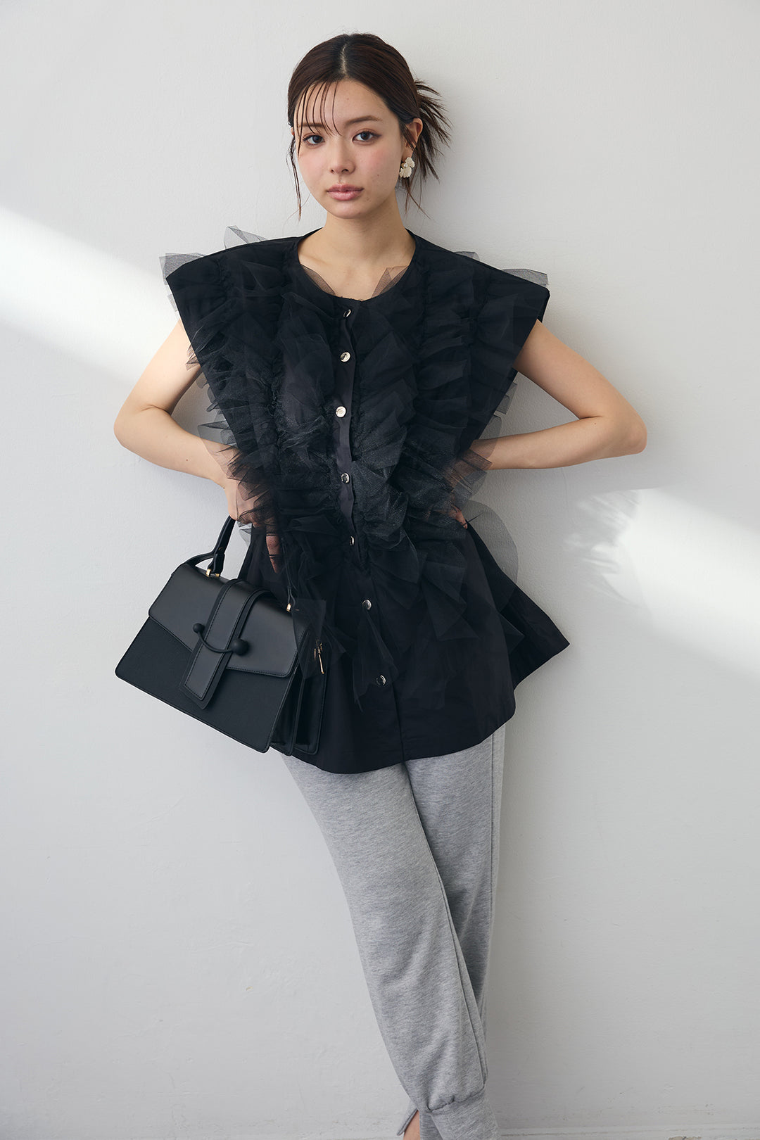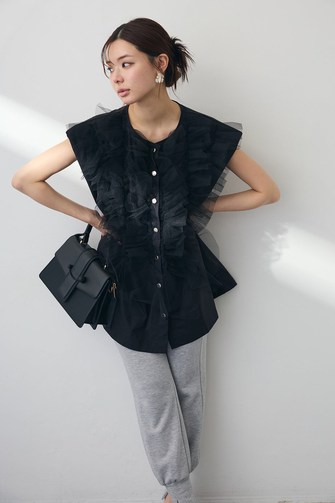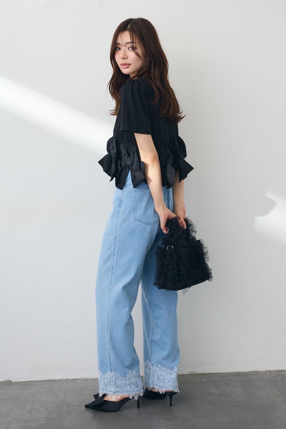 [予約/SET]シースルー×フリルドッキングトップス+パールラインストーンハイウエストデニム(2set)