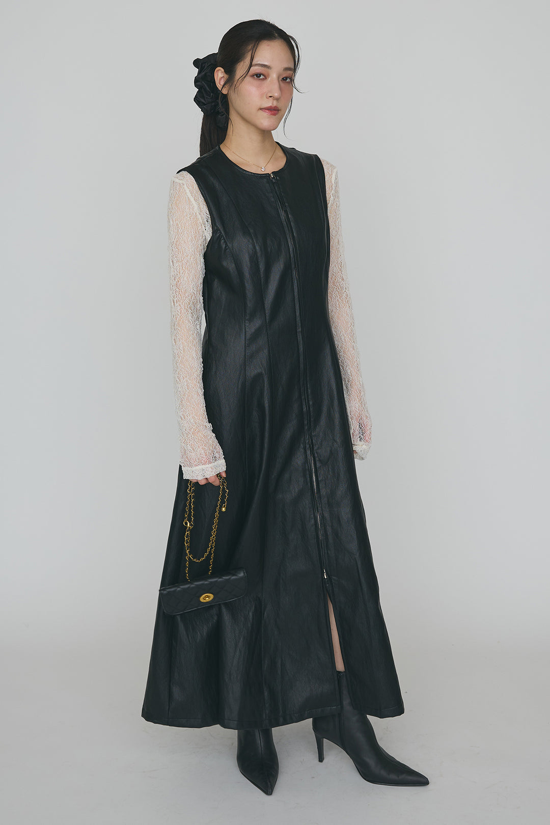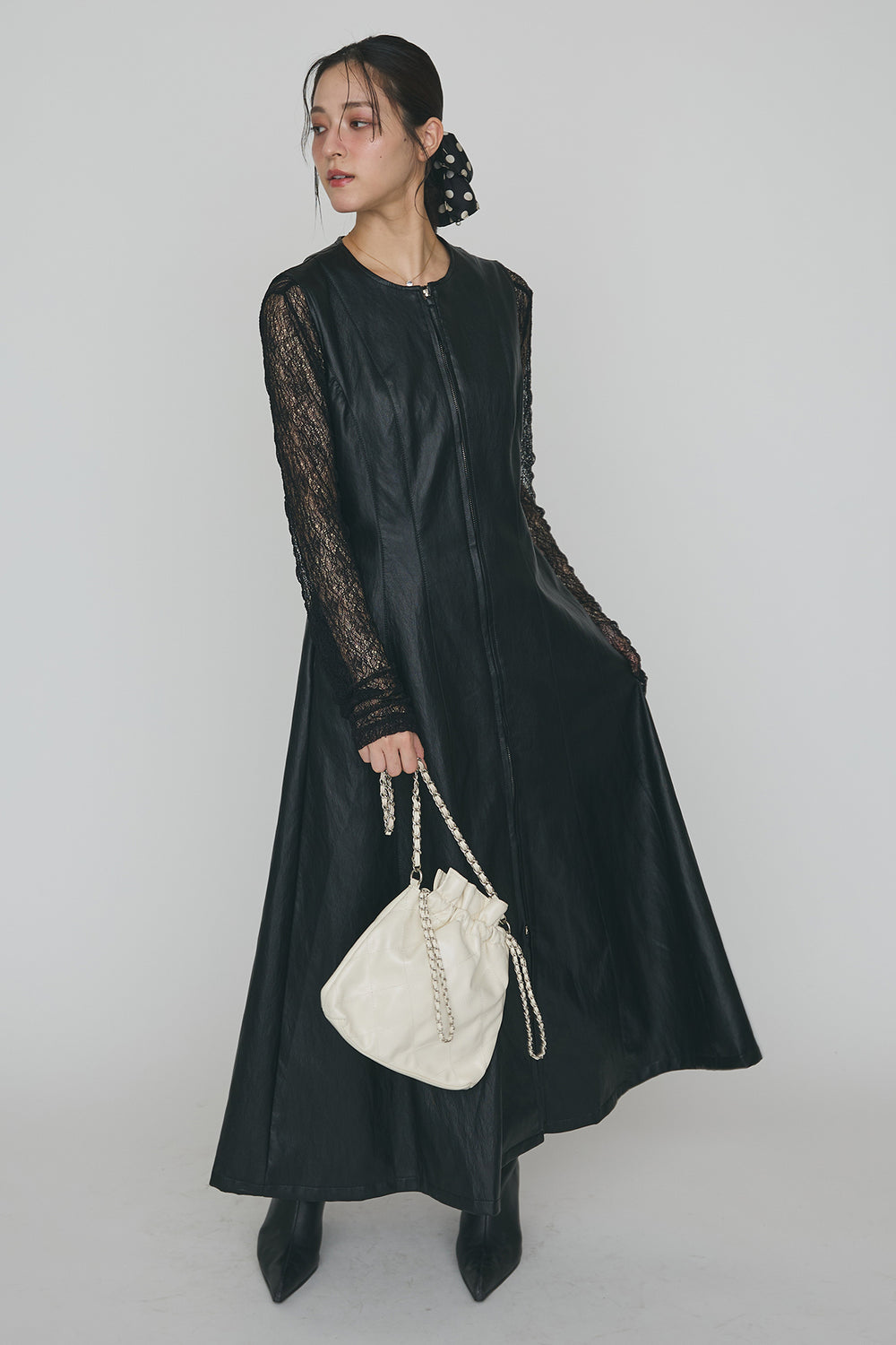 [予約/SET]ストレッチ繊細レーストップス+フロントZIPレザーライクジャンスカ(2set)