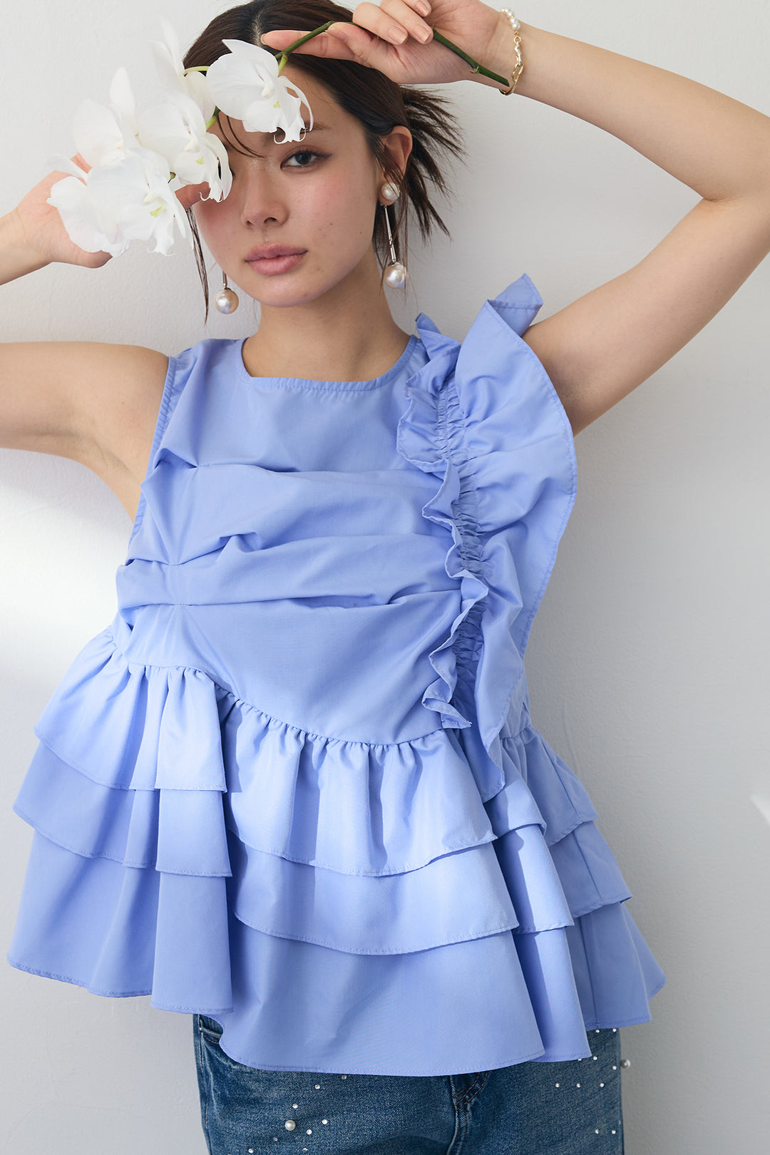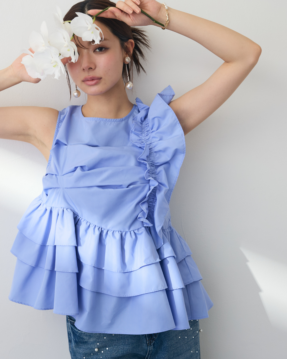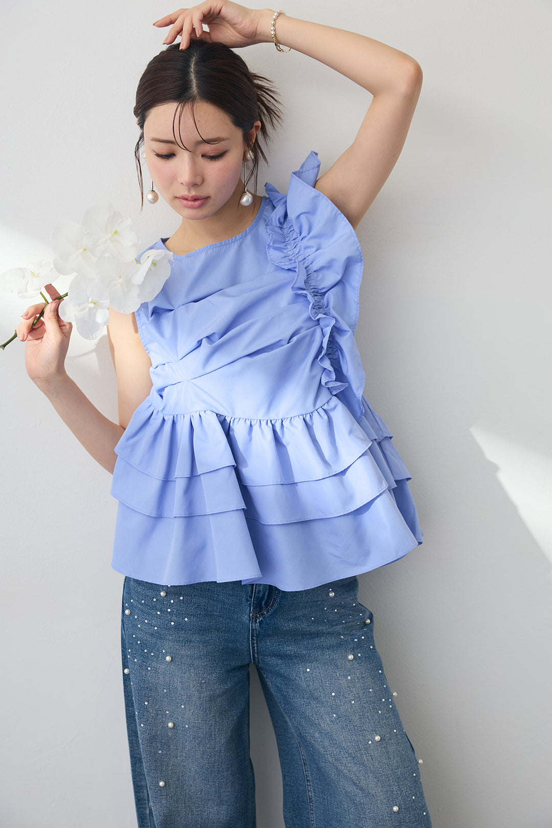 [予約/SET]アシメフリルギャザーブラウス+パールラインストーンハイウエストデニム(2set)
