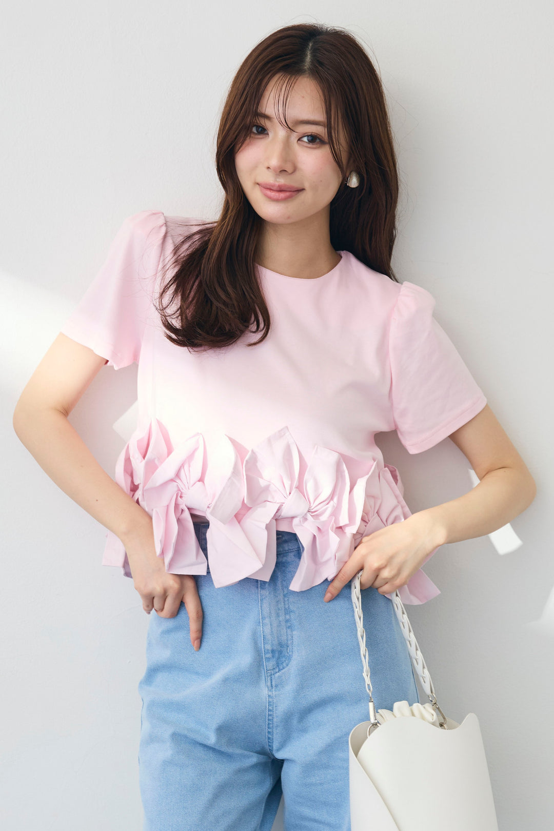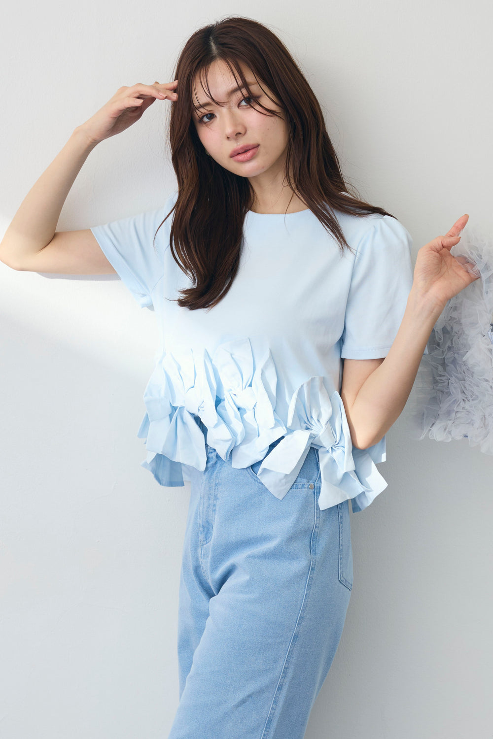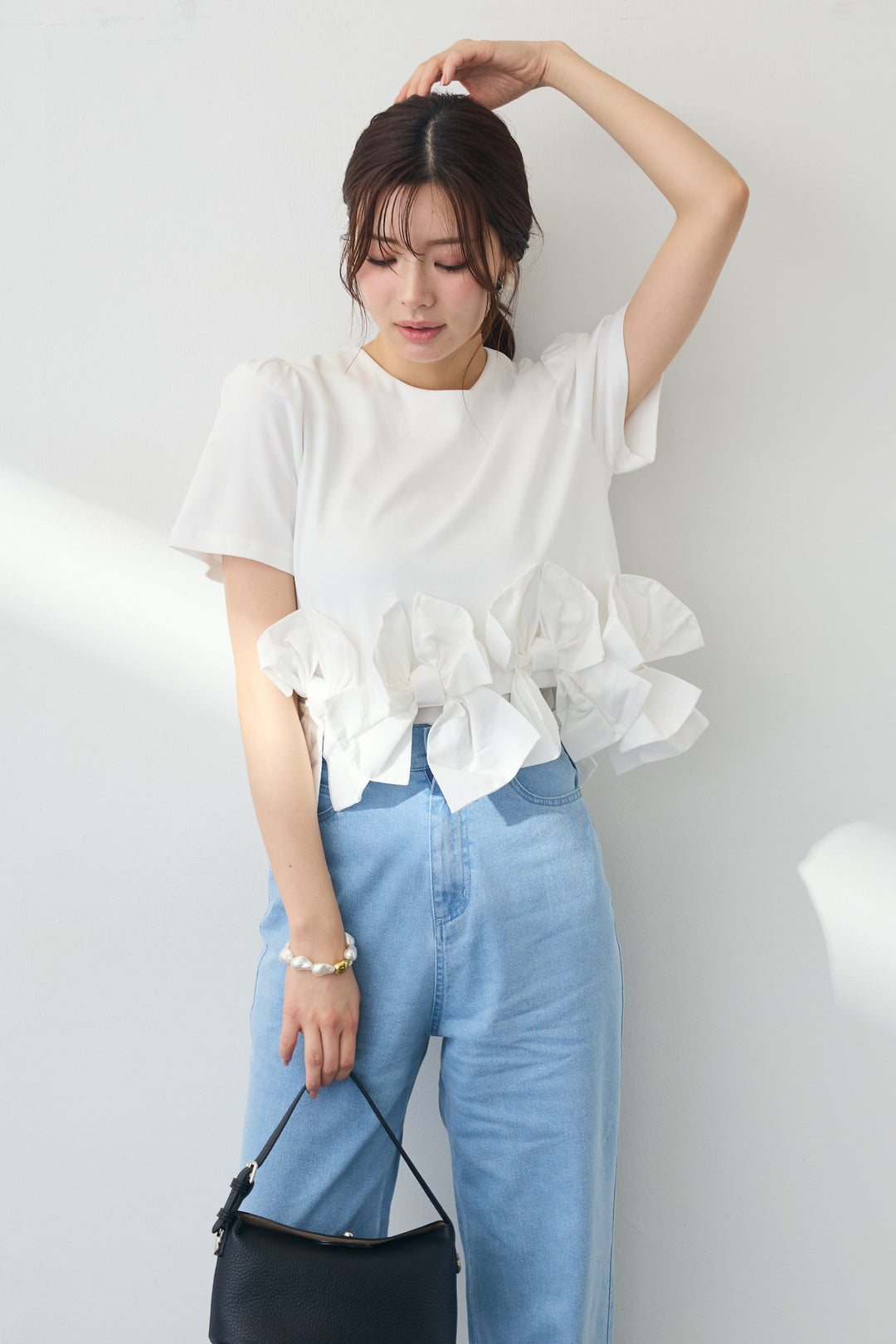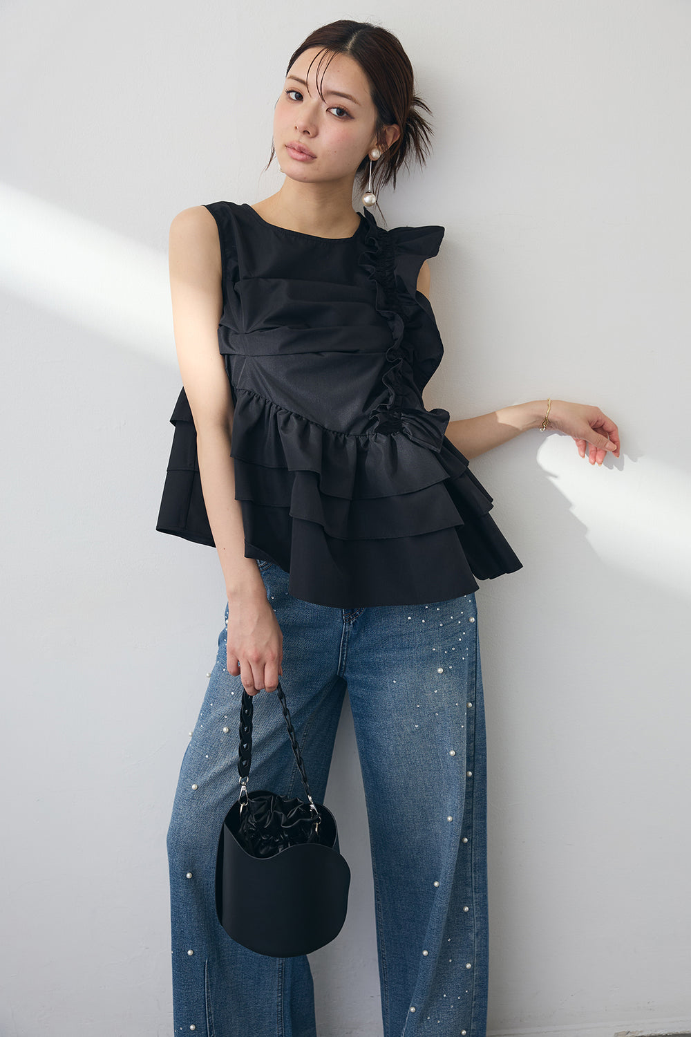 [予約/SET]アシメフリルギャザーブラウス+パールラインストーンハイウエストデニム(2set)