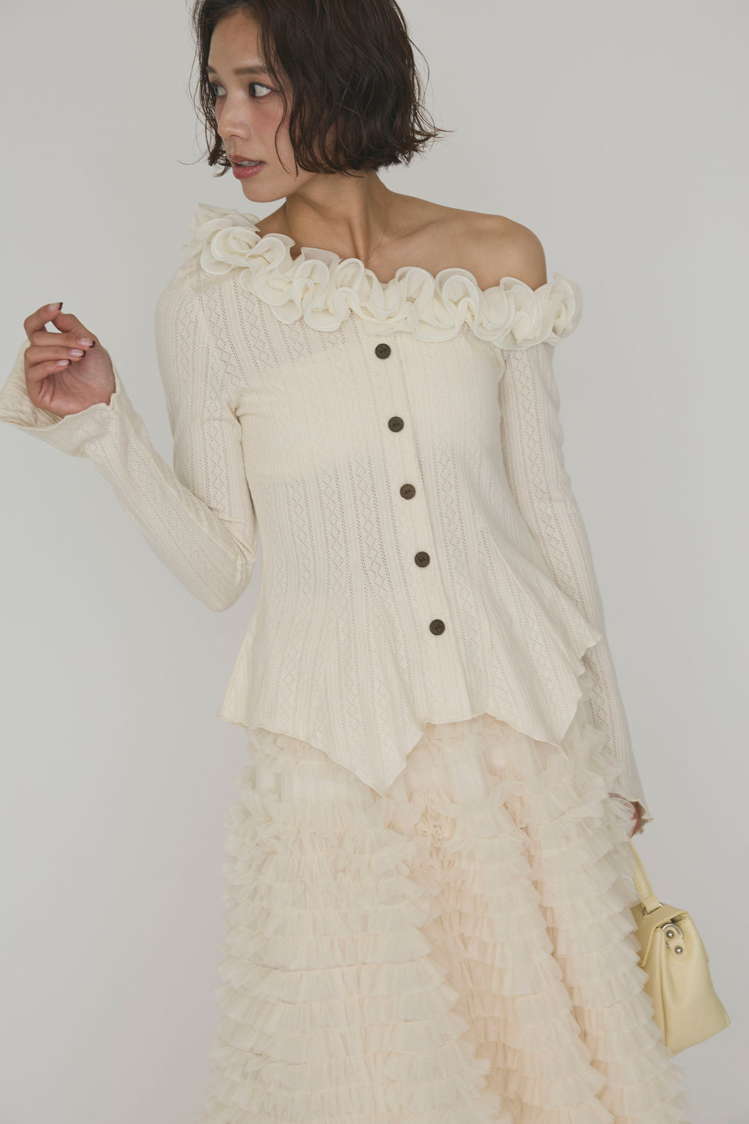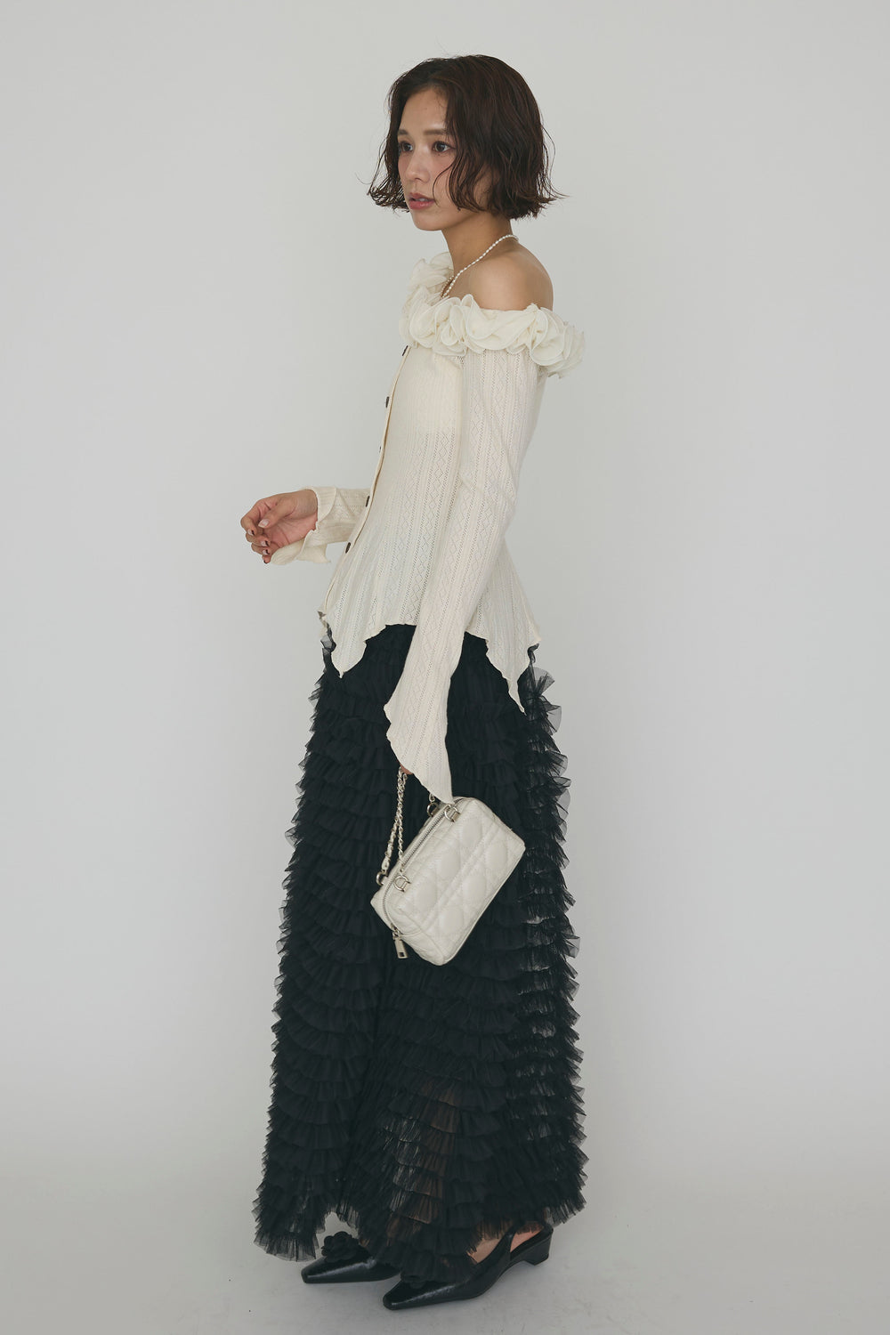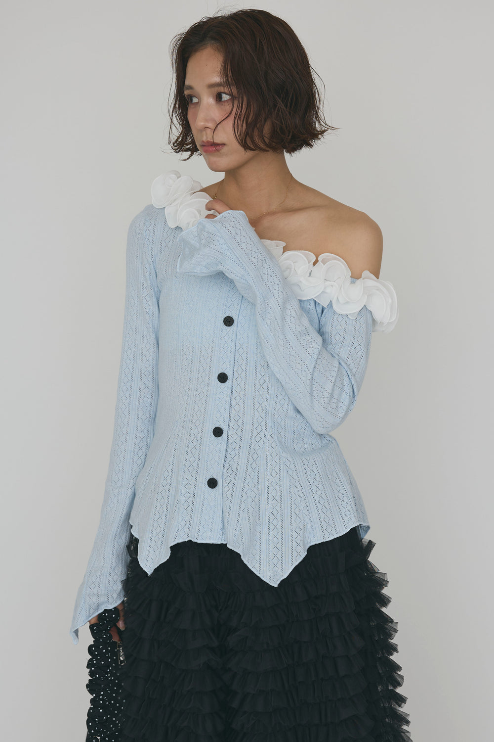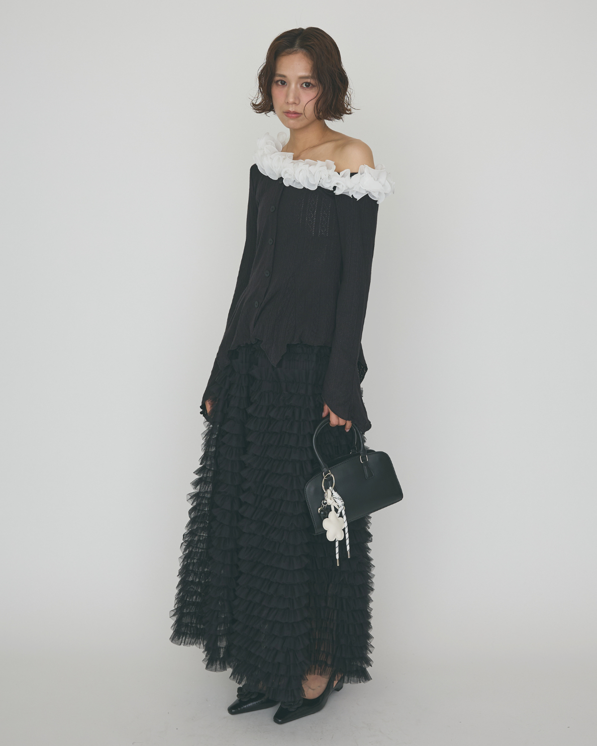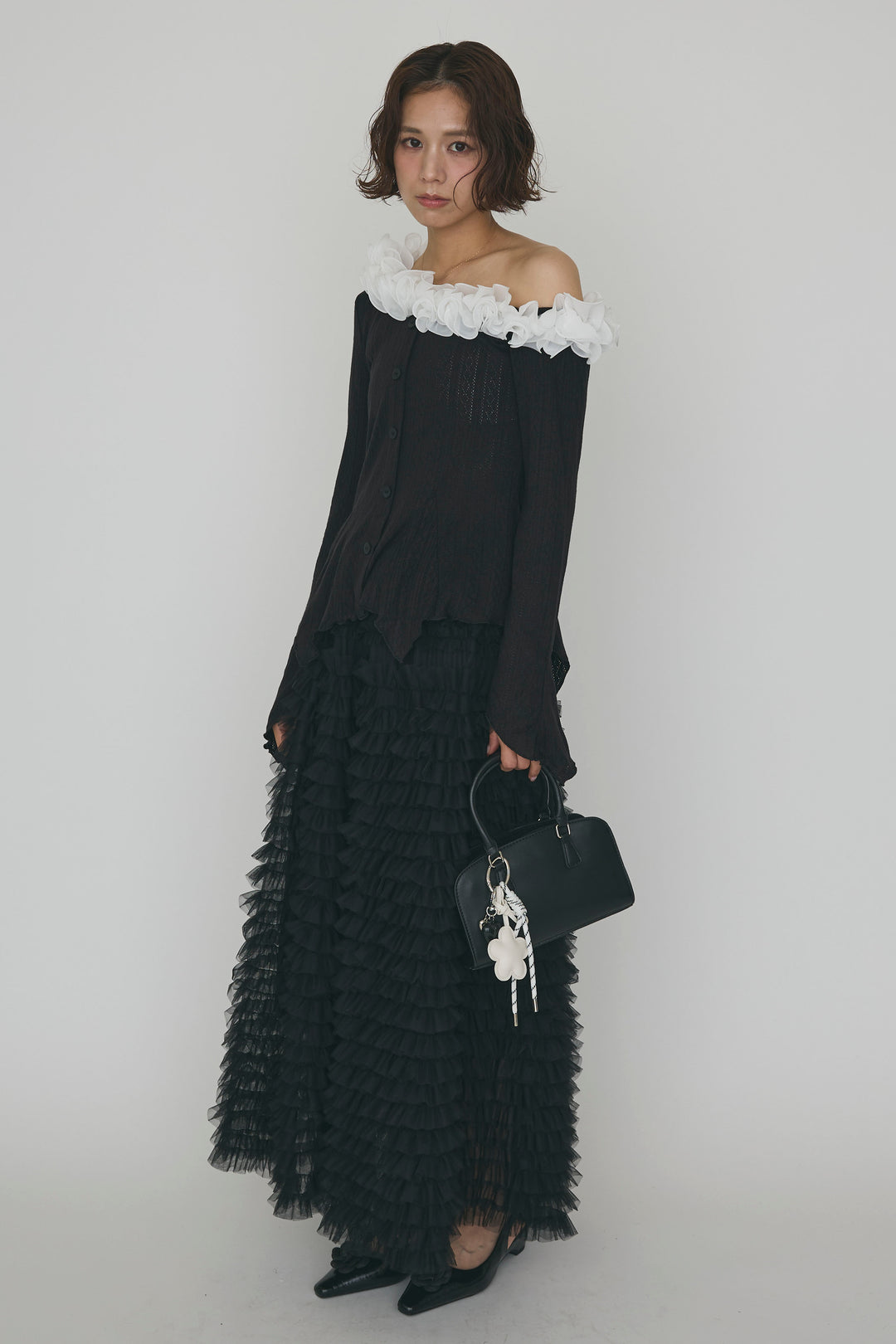 [予約/SET]フリルモチーフアシメオフショルフレアトップス+ホイップチュールティアードスカート(2set)