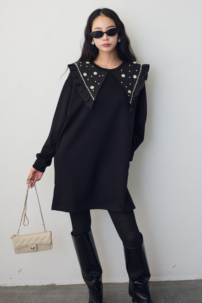 [予約/SET]ポロ襟ペプラムニットプルオーバー+センターシームランダムパールパンツ(2set)
