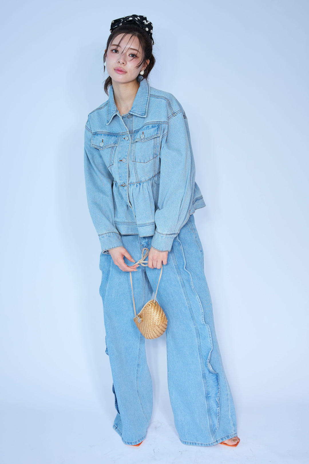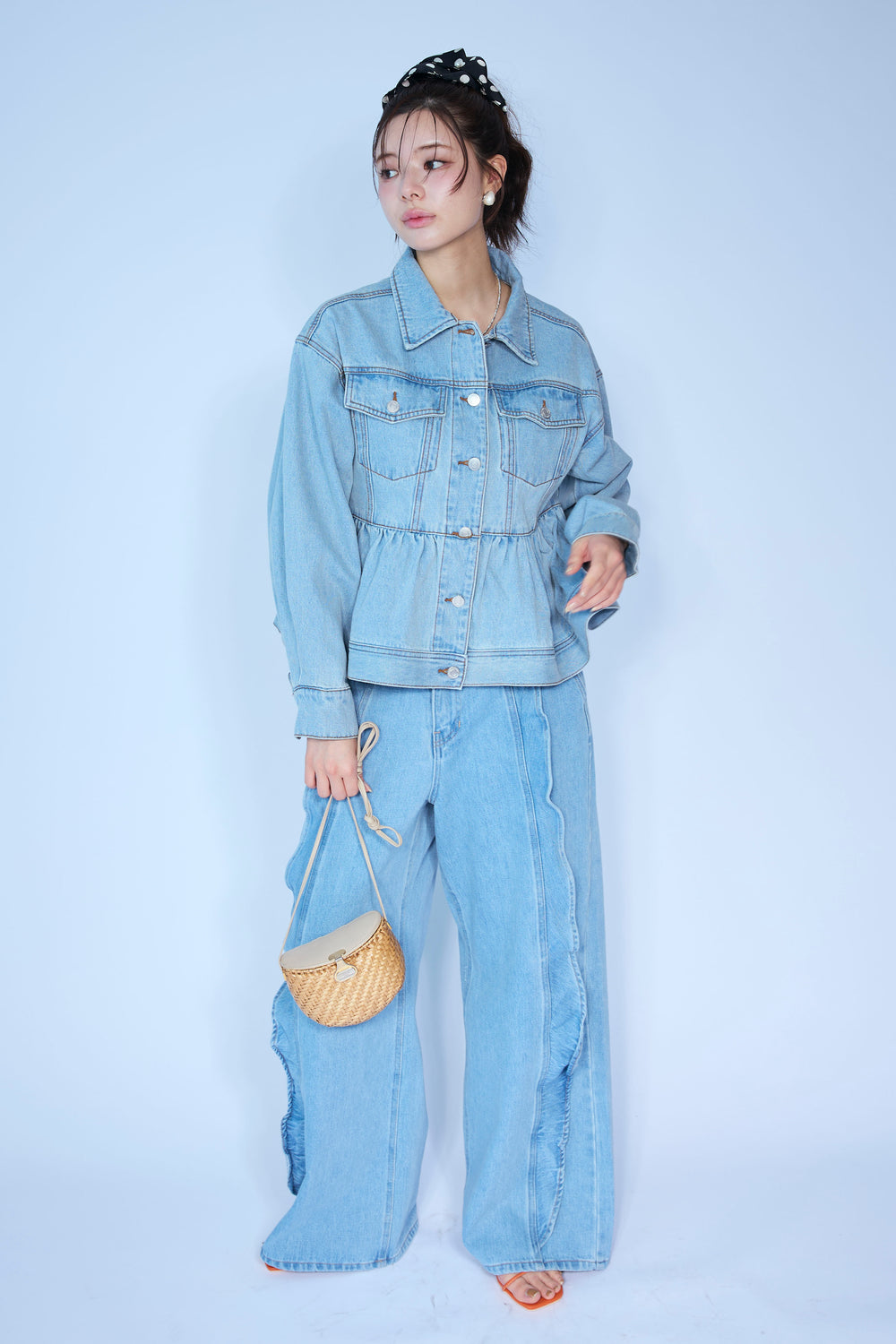 [予約/SET]ペプラムデニムジャケット+フリルウェーブデニムパンツ(2set)