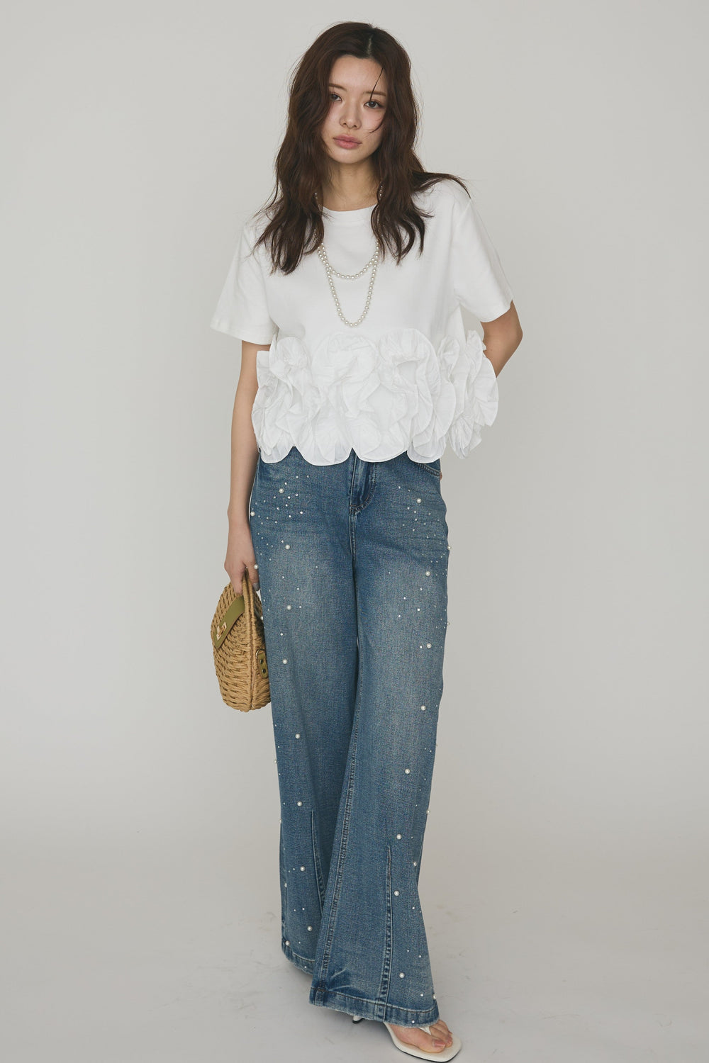 [予約/SET]フリルウェーブヘムカットTシャツ+パールラインストーンハイウエストデニム(2set)