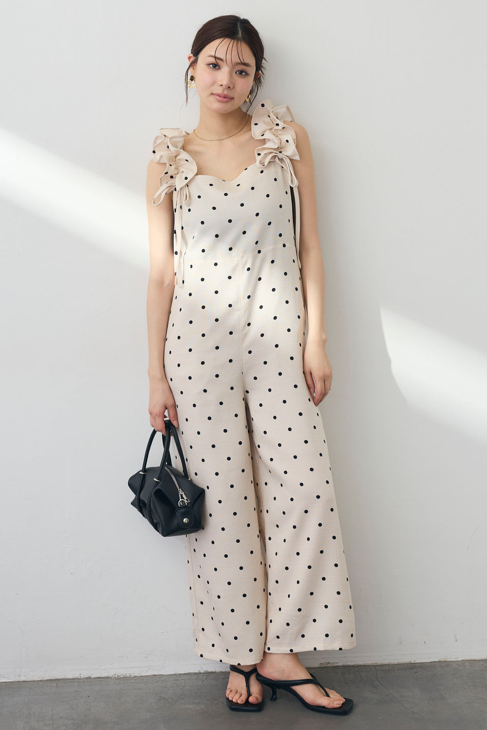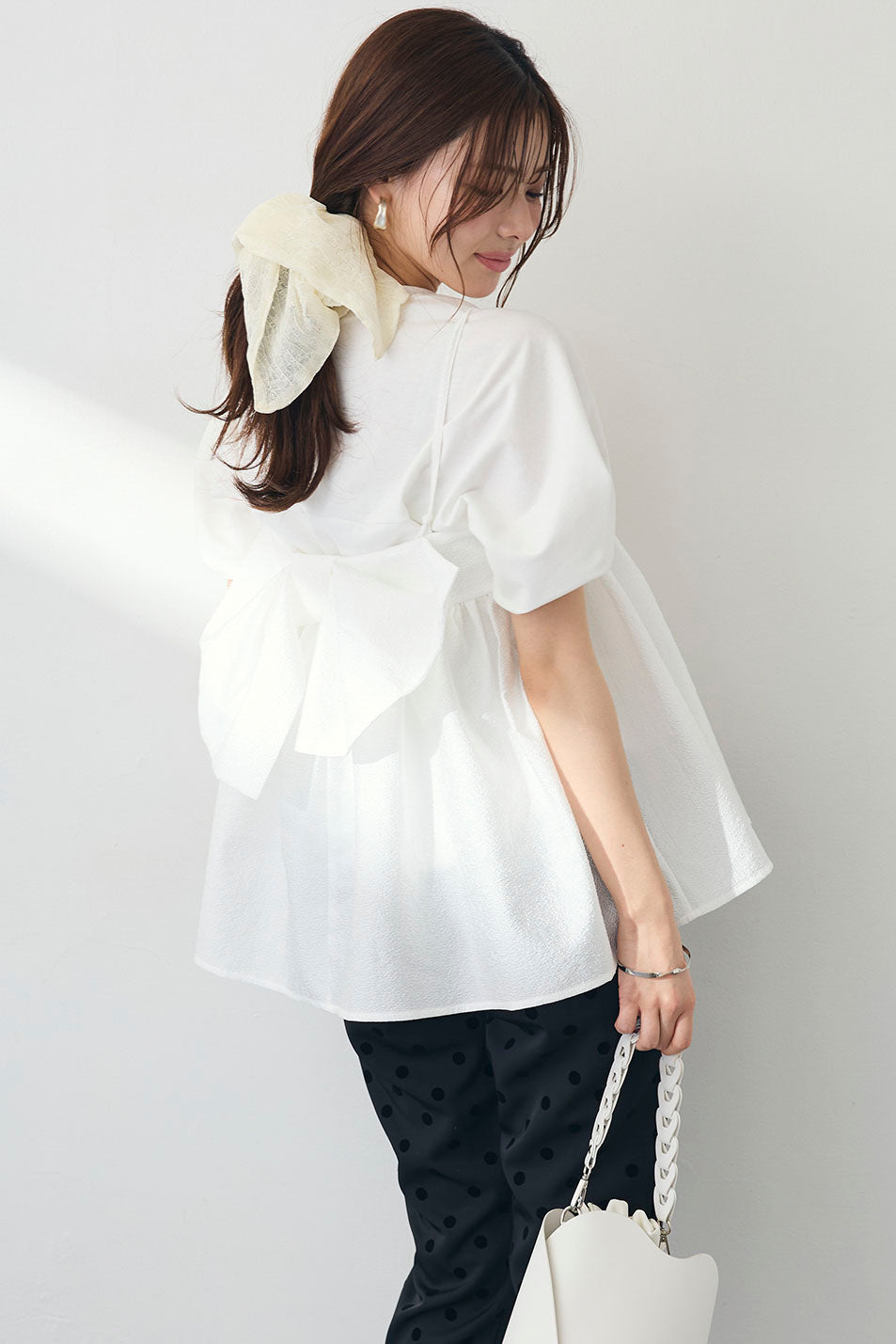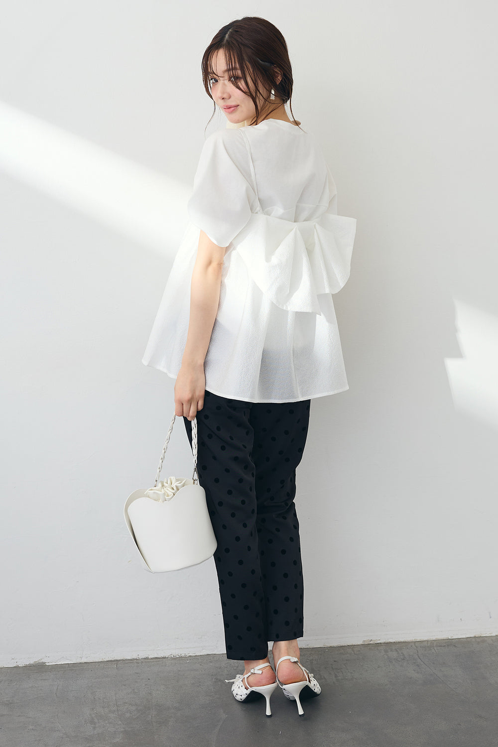 [予約/SET]ランタンスリーブカットトップス+ふくれジャガードシアーバックリボンキャミ+ドット柄センターラインテーパードパンツ(3set)