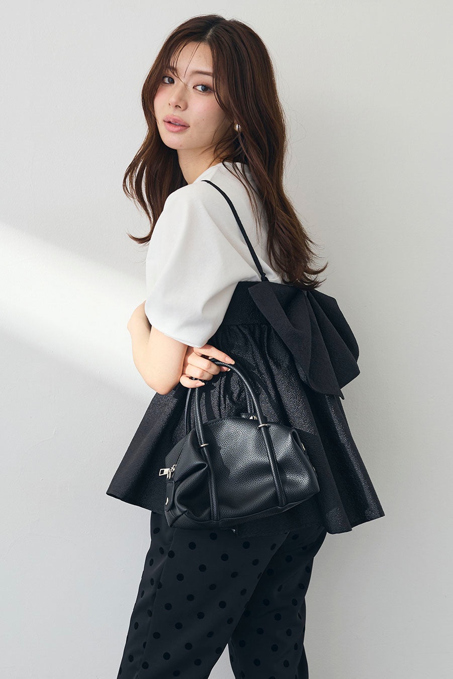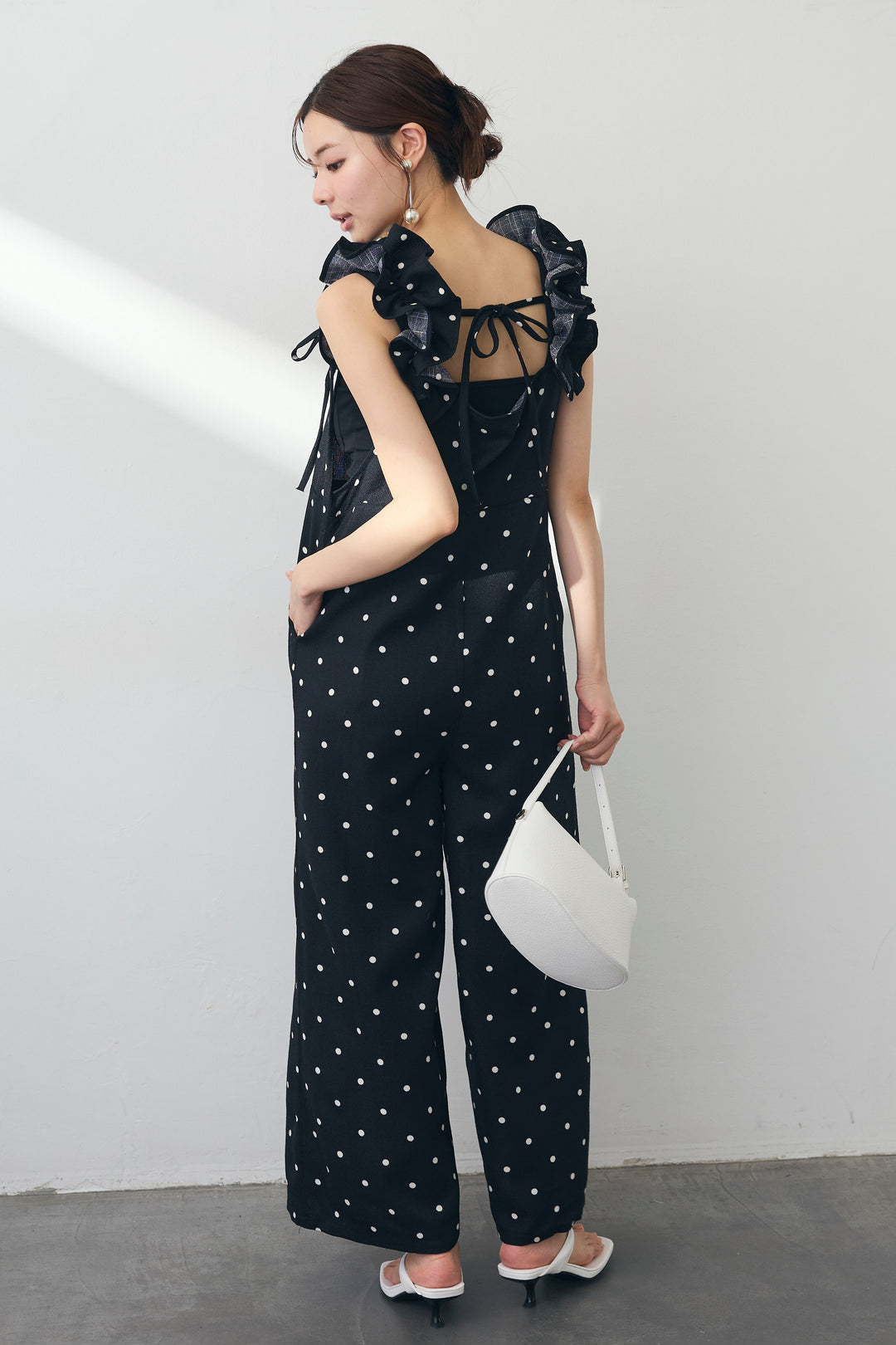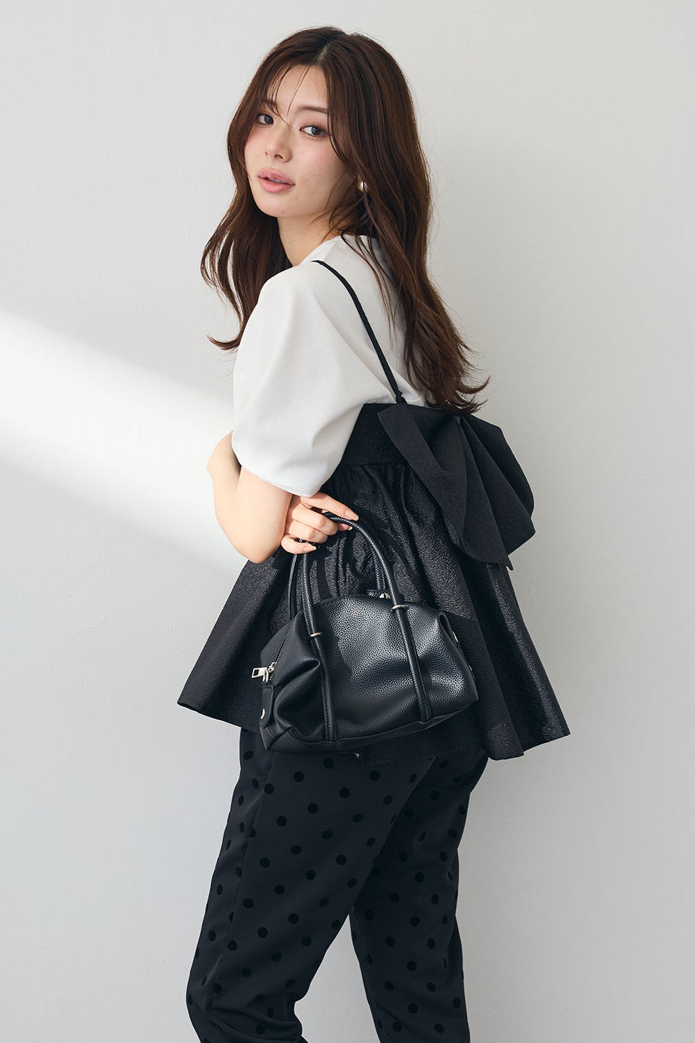 [予約/SET]ランタンスリーブカットトップス+ふくれジャガードシアーバックリボンキャミ+ドット柄センターラインテーパードパンツ(3set)