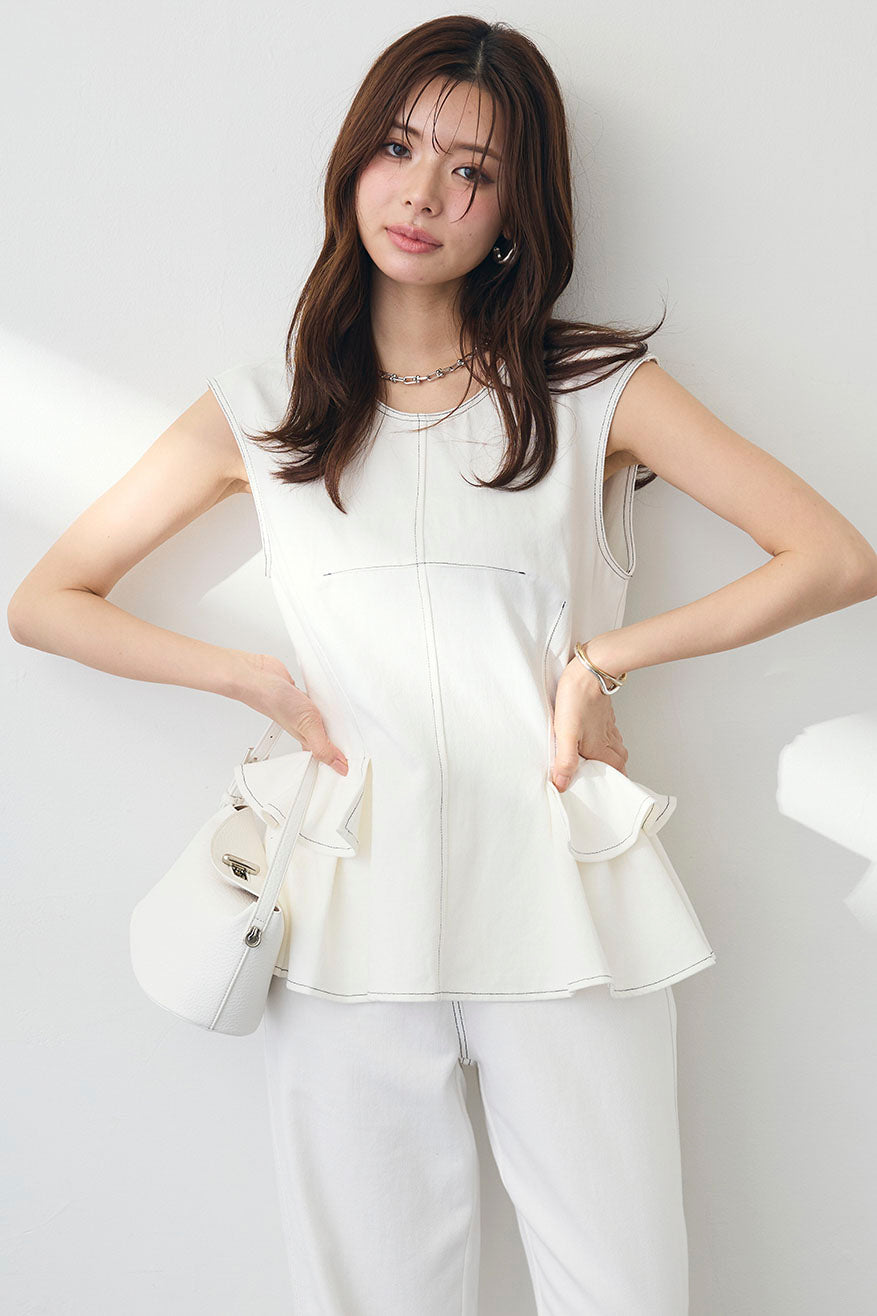 [予約]ステッチミニペプラム美シルエットデニムトップス