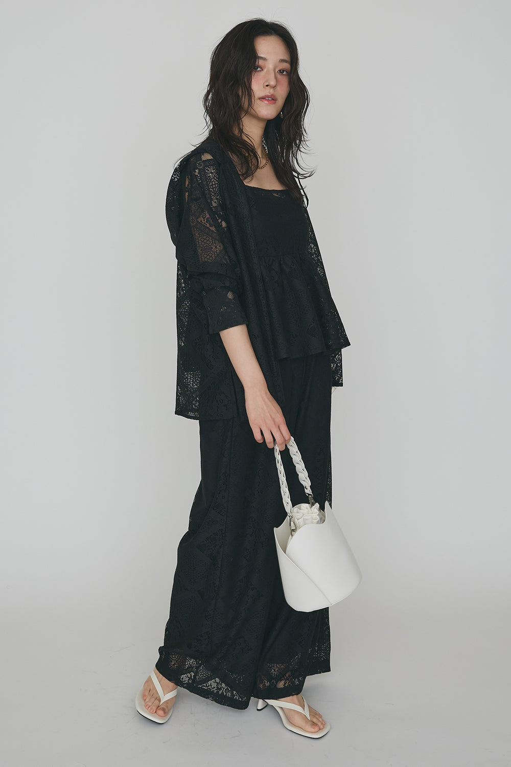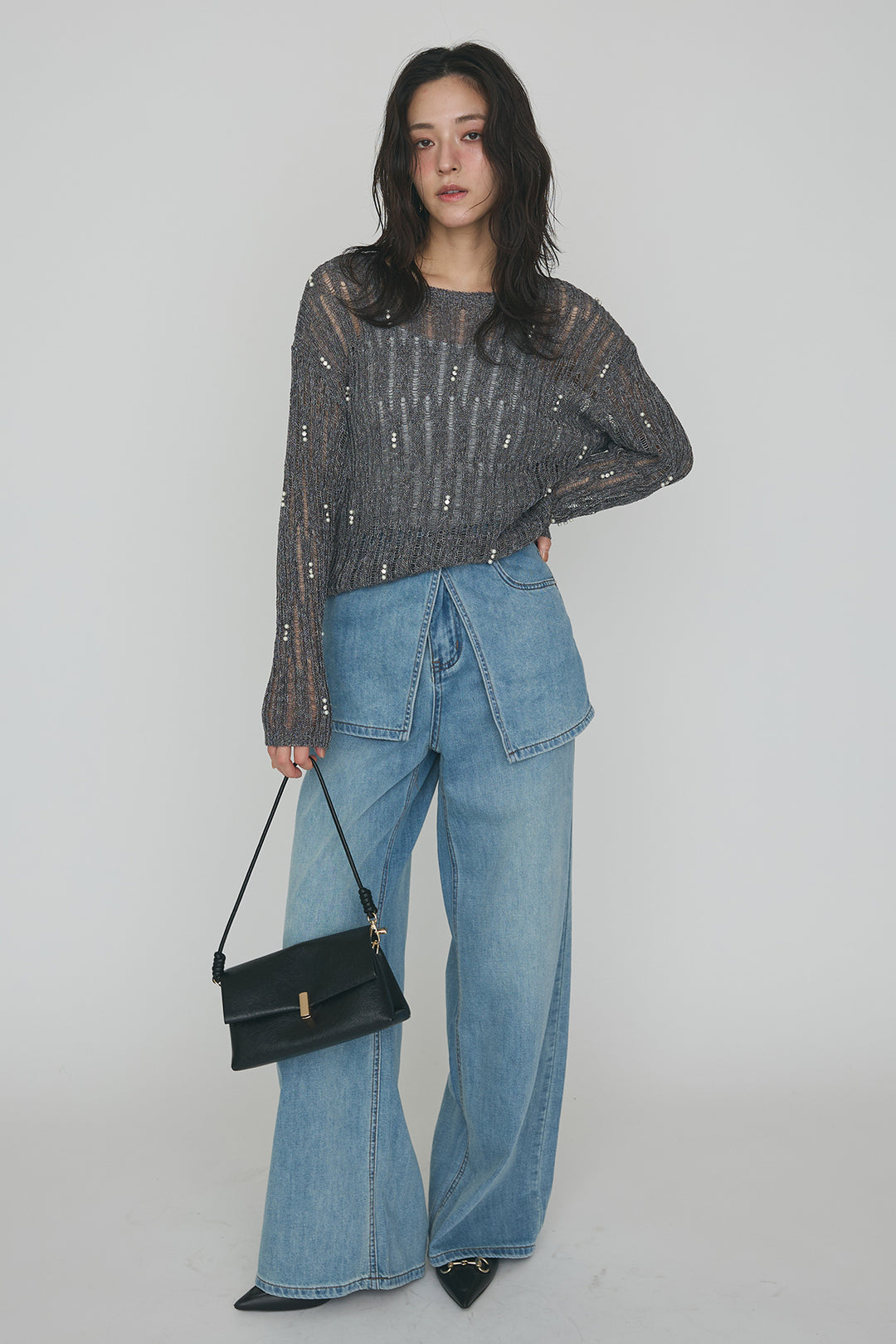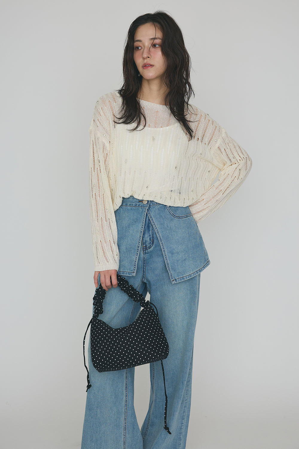 [予約/SET]パールドロップシースルーインナーセットニット+ラップ2wayストレートデニムパンツ(2set)
