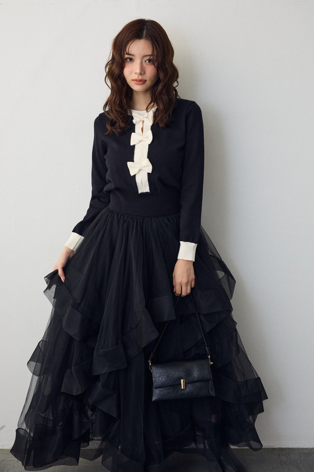 [予約/SET]フロントリボンモチーフカーデ+ランダムフリルティアードボリュームスカート(2set)