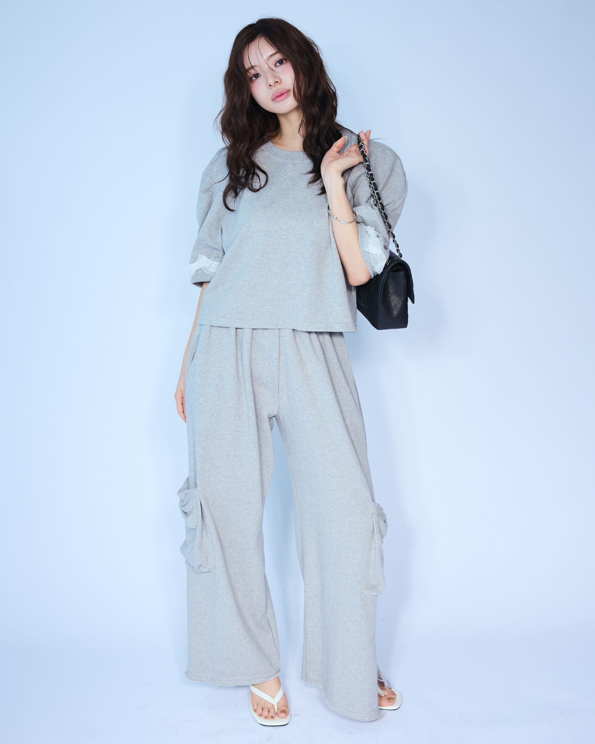 [予約/SET]ティアード袖ジョーゼットブラウス+カットジョーゼット前スリットパンツ(2set)