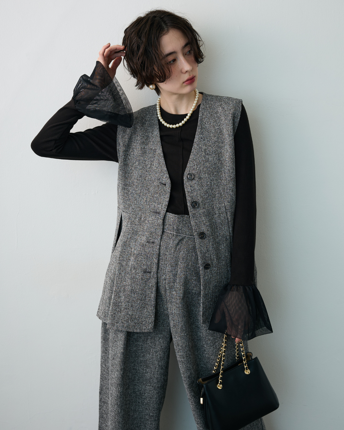 [予約/SET]チュールシアーカフスリブニット+サマーツイードボックスプリーツベスト+サマーツイードウエストラインタックパンツ(3set)