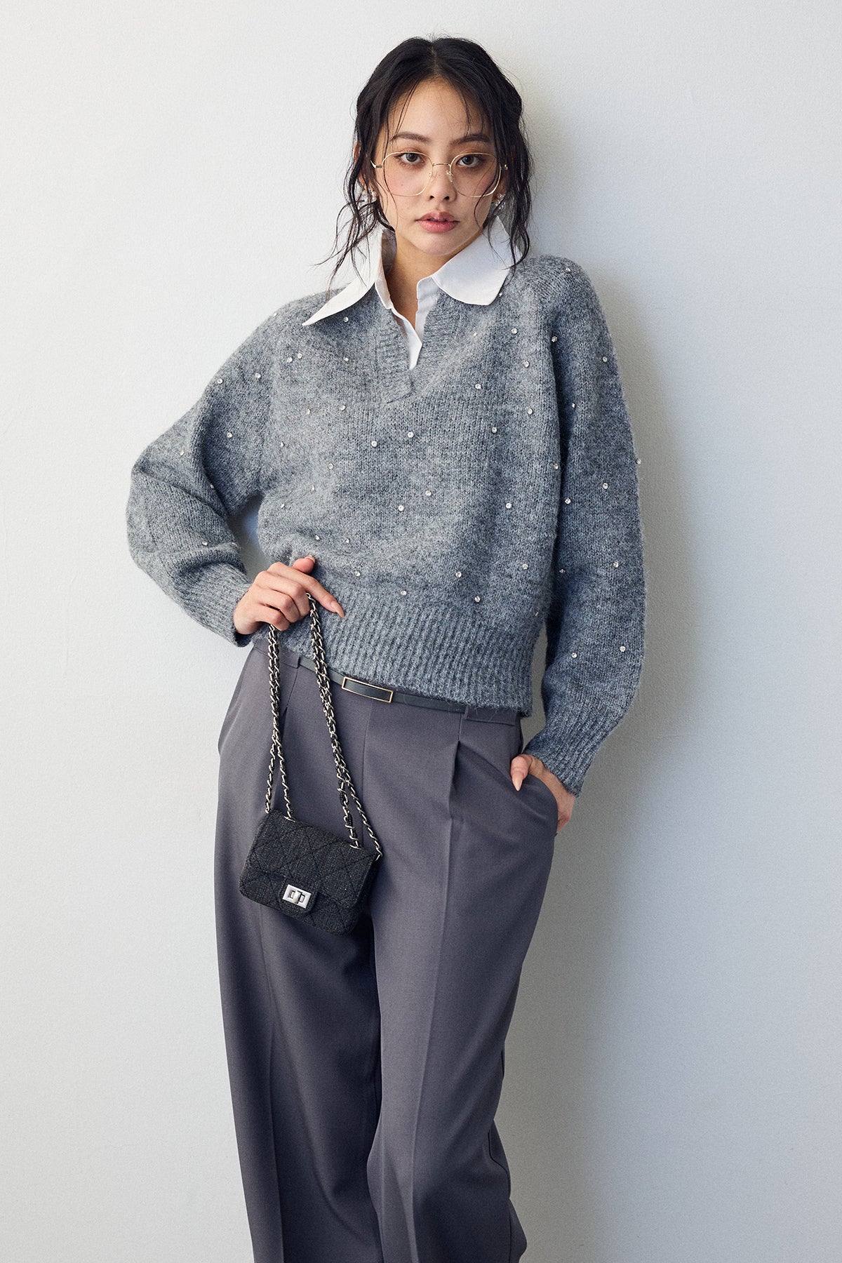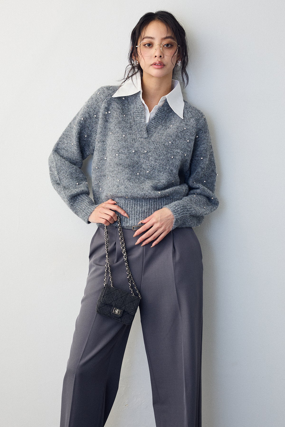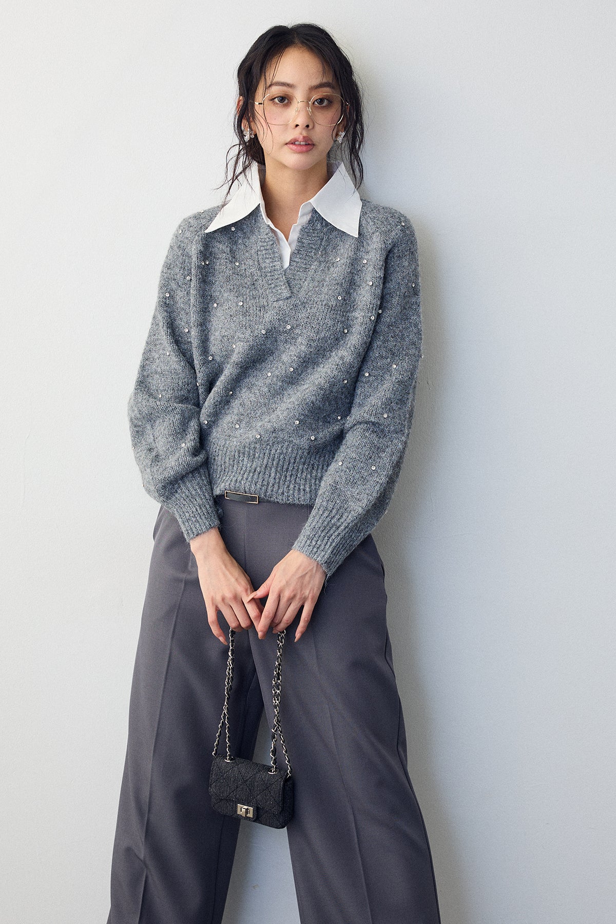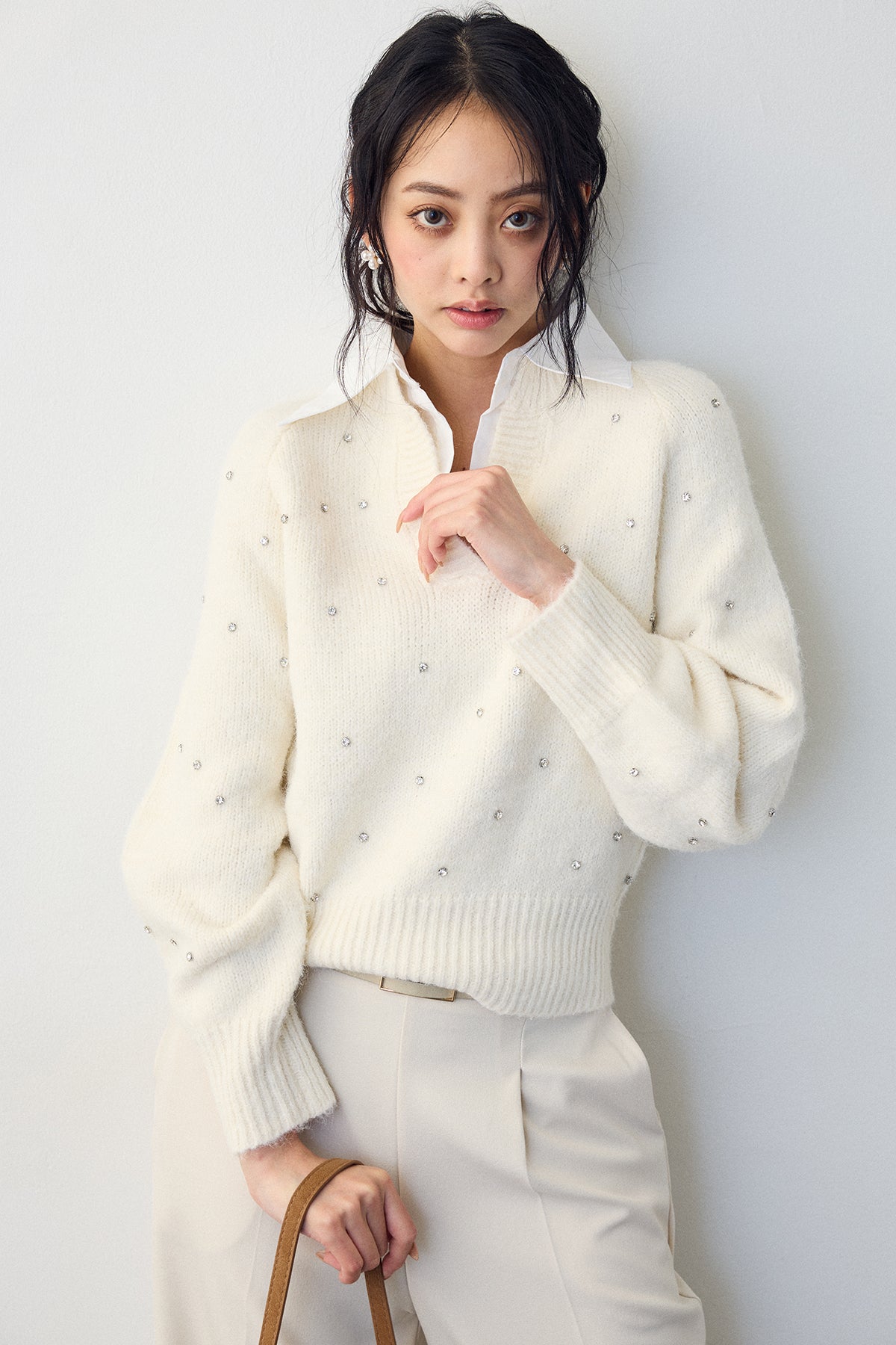 [予約]シャツ襟ラインストーンニットPOを含んだコーデセット商品を探す↓