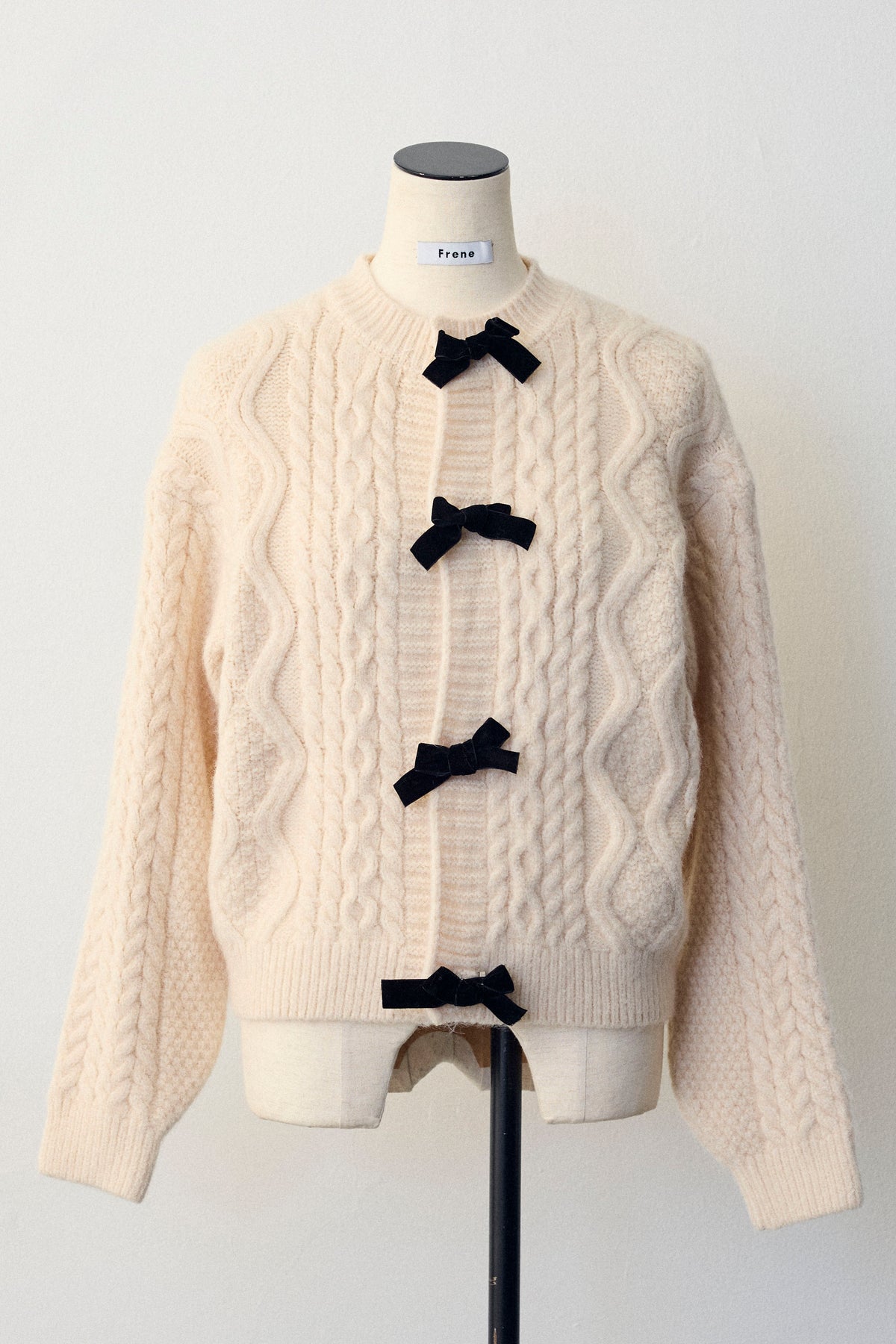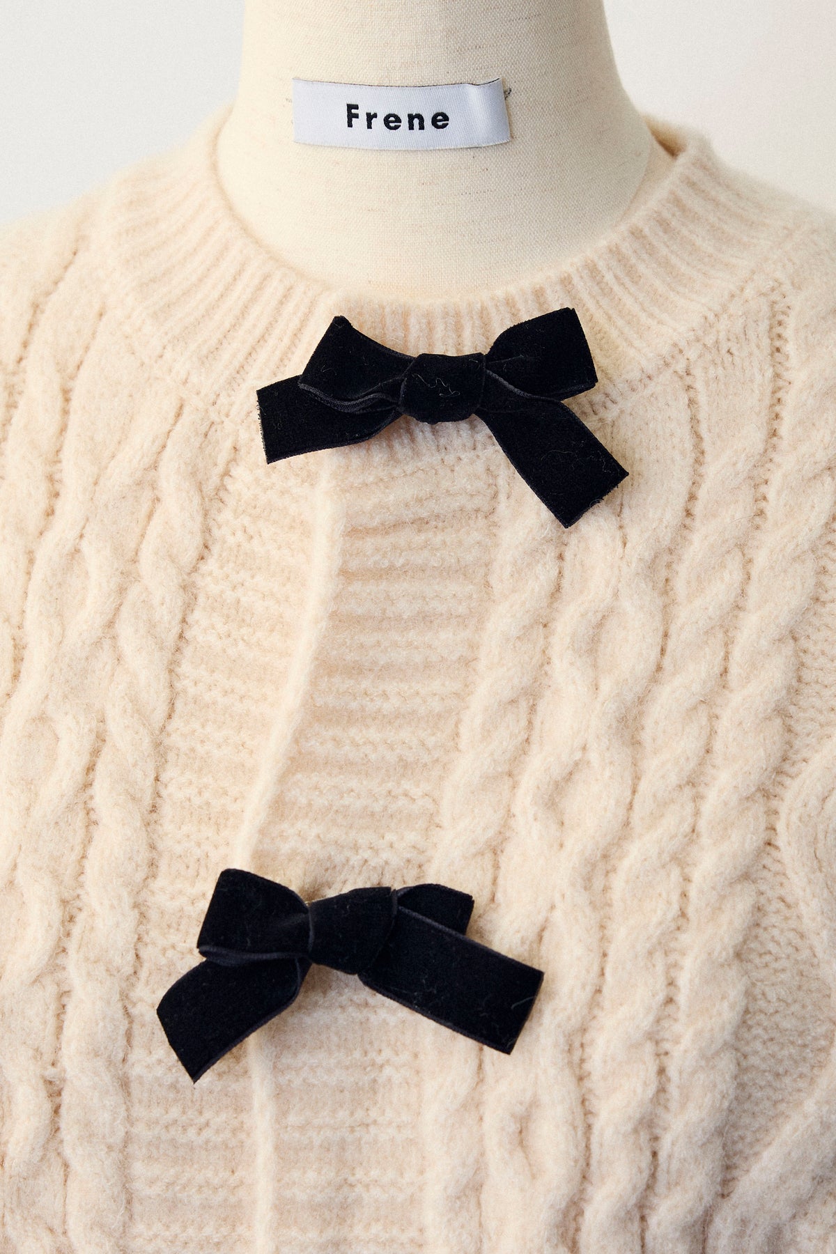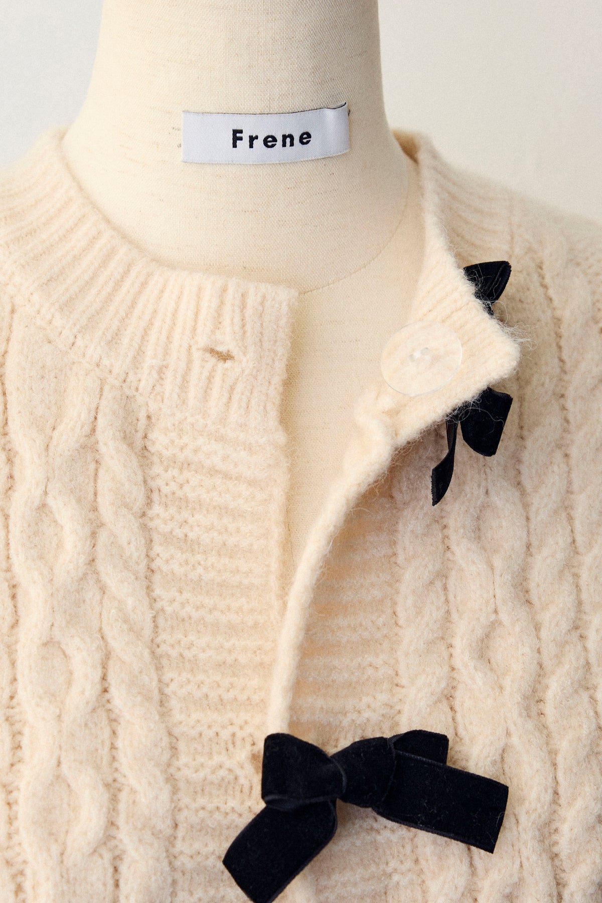 クラシカルなケーブル編みと、艶やかなベロアリボンが目を惹くニットカーディガン。 温かみのある編み地に、ブラックのリボンを大胆にあしらうことで、甘すぎない大人のフェミニンスタイルを実現しました。 フロントに並ぶリボンがジュエリーのようなアクセントになり、シンプルなボトムスと合わせるだけで着映え効果は抜群。 程よい着丈ですっきりと着こなせるため、デニムでカジュアルダウンしたり、ボリュームスカートで華やかに仕上げたりと、気分に合わせたスタイリングが楽しめます。 冬の装いにときめきとメリハリを与える、存在感たっぷりの一着です。