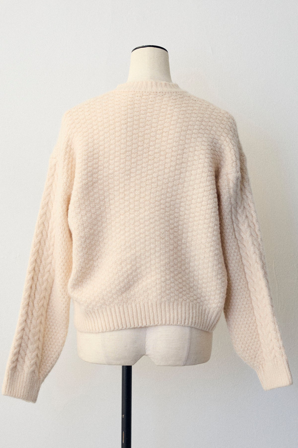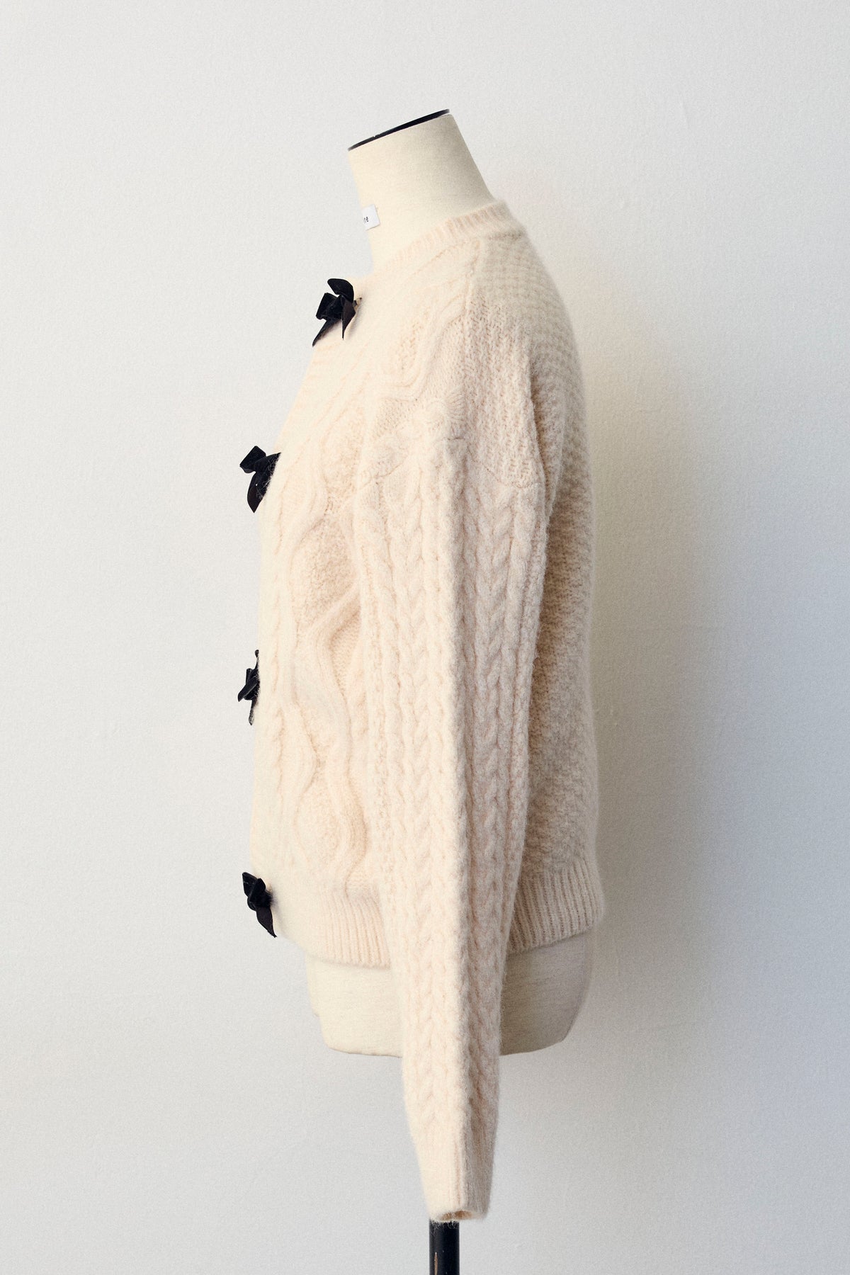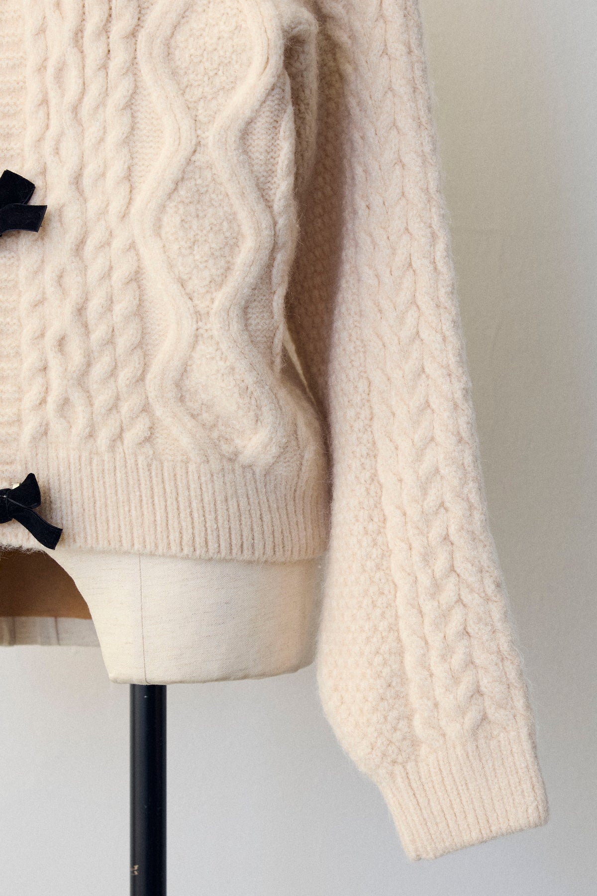 クラシカルなケーブル編みと、艶やかなベロアリボンが目を惹くニットカーディガン。 温かみのある編み地に、ブラックのリボンを大胆にあしらうことで、甘すぎない大人のフェミニンスタイルを実現しました。 フロントに並ぶリボンがジュエリーのようなアクセントになり、シンプルなボトムスと合わせるだけで着映え効果は抜群。 程よい着丈ですっきりと着こなせるため、デニムでカジュアルダウンしたり、ボリュームスカートで華やかに仕上げたりと、気分に合わせたスタイリングが楽しめます。 冬の装いにときめきとメリハリを与える、存在感たっぷりの一着です。