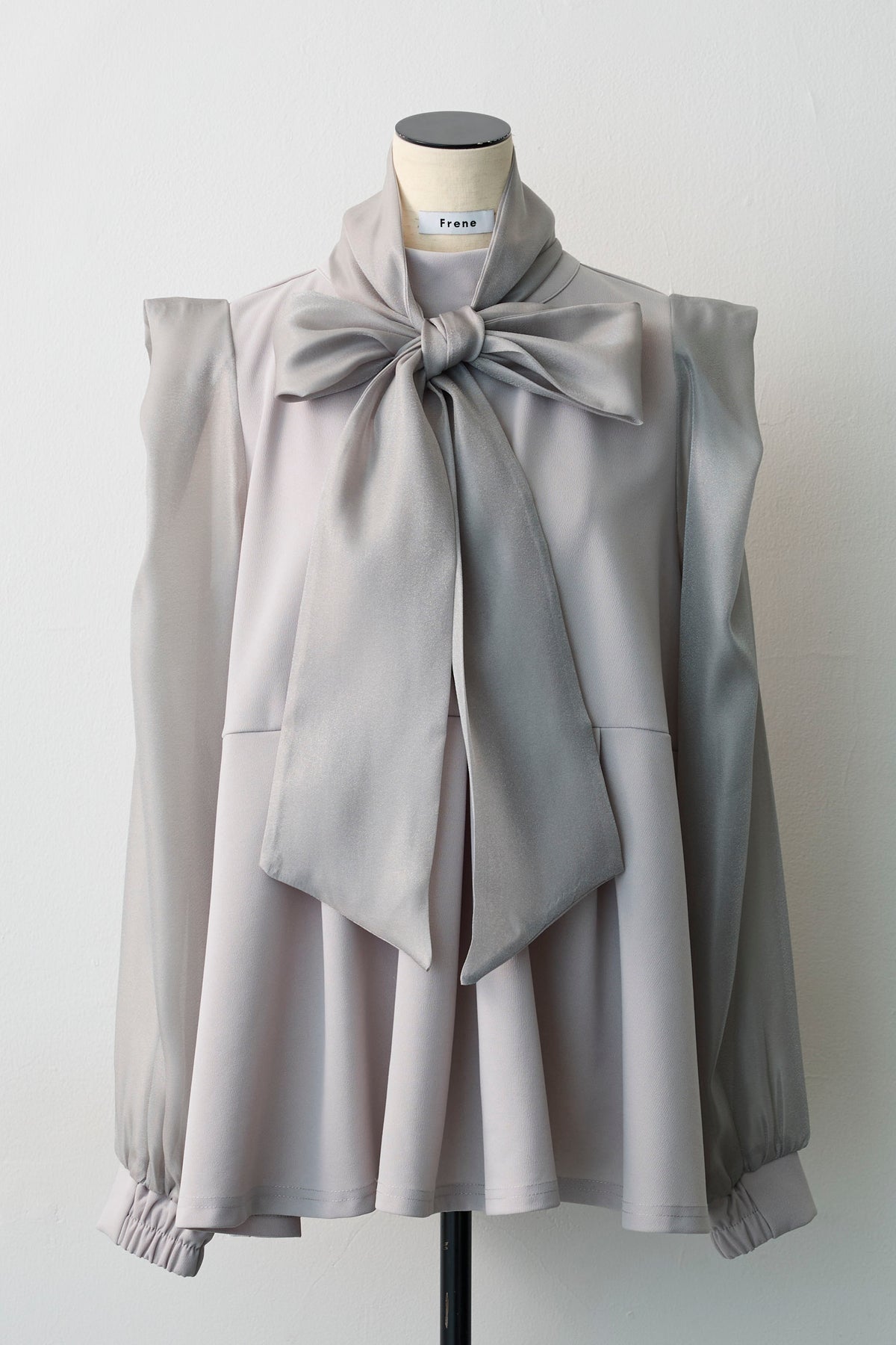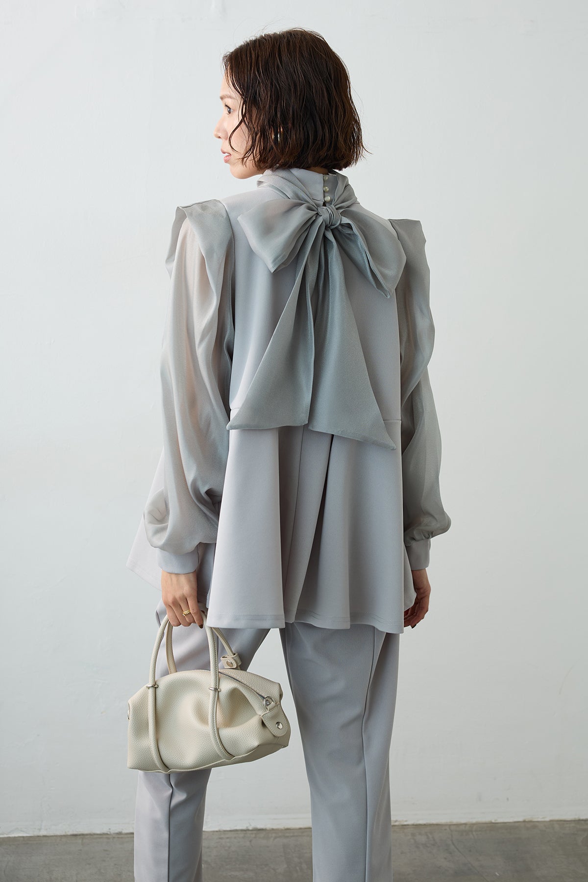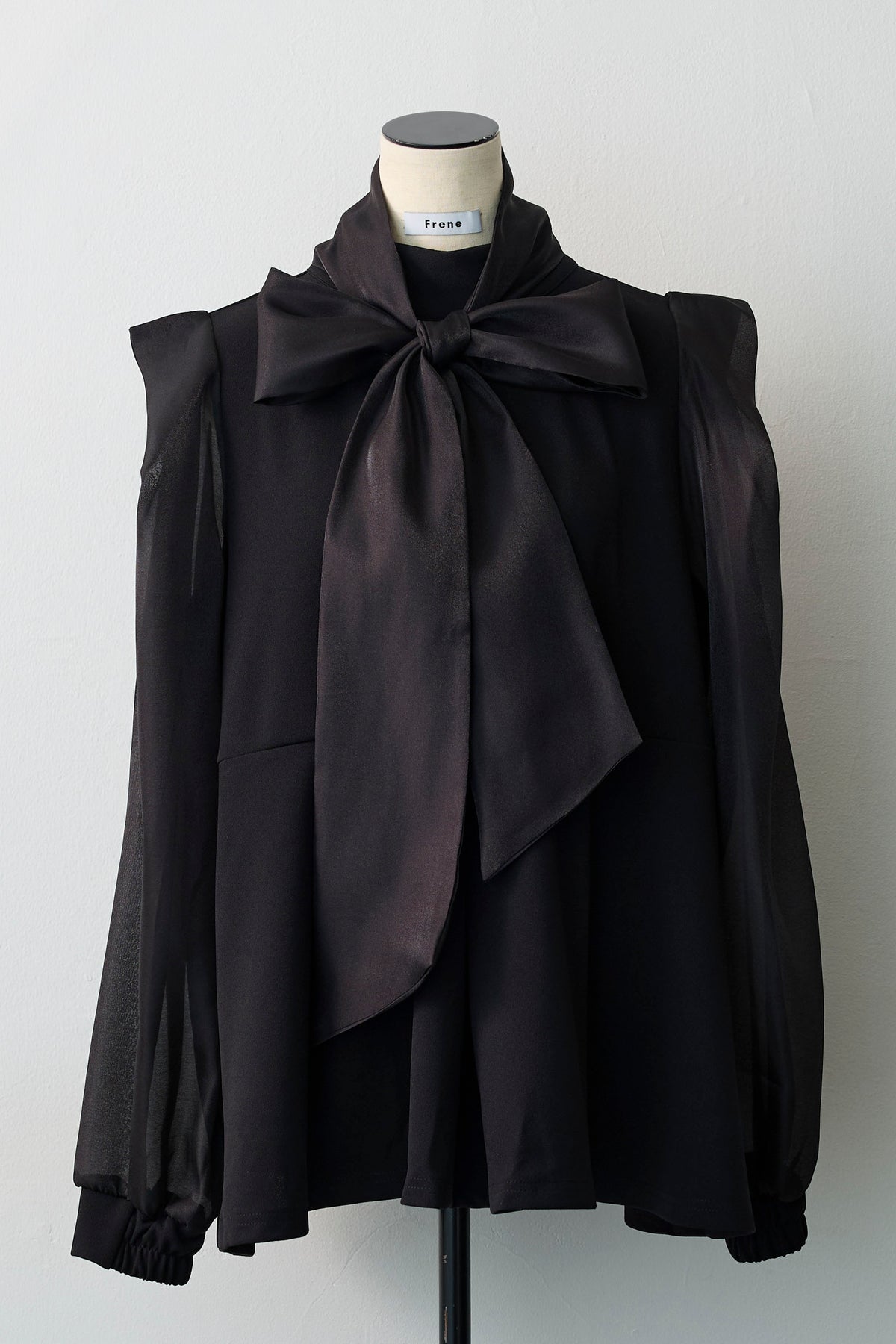 シアーな袖と身頃の異素材ドッキングが、奥行きのある表情を作るブラウス。 顔周りを飾るボリューミーなリボンは、前後どちらでも結べるだけでなく、取り外せばシャープなスタンドネックとしても楽しめるマルチウェイ仕様。 存在感のあるリボンが顔周りを一気に華やかに彩り、アクセサリーいらずで写真映えも抜群。 ウエストにタックを施したペプラムシルエットが、ふわりと腰回りをカバーし、メリハリのあるスタイルを叶えます。