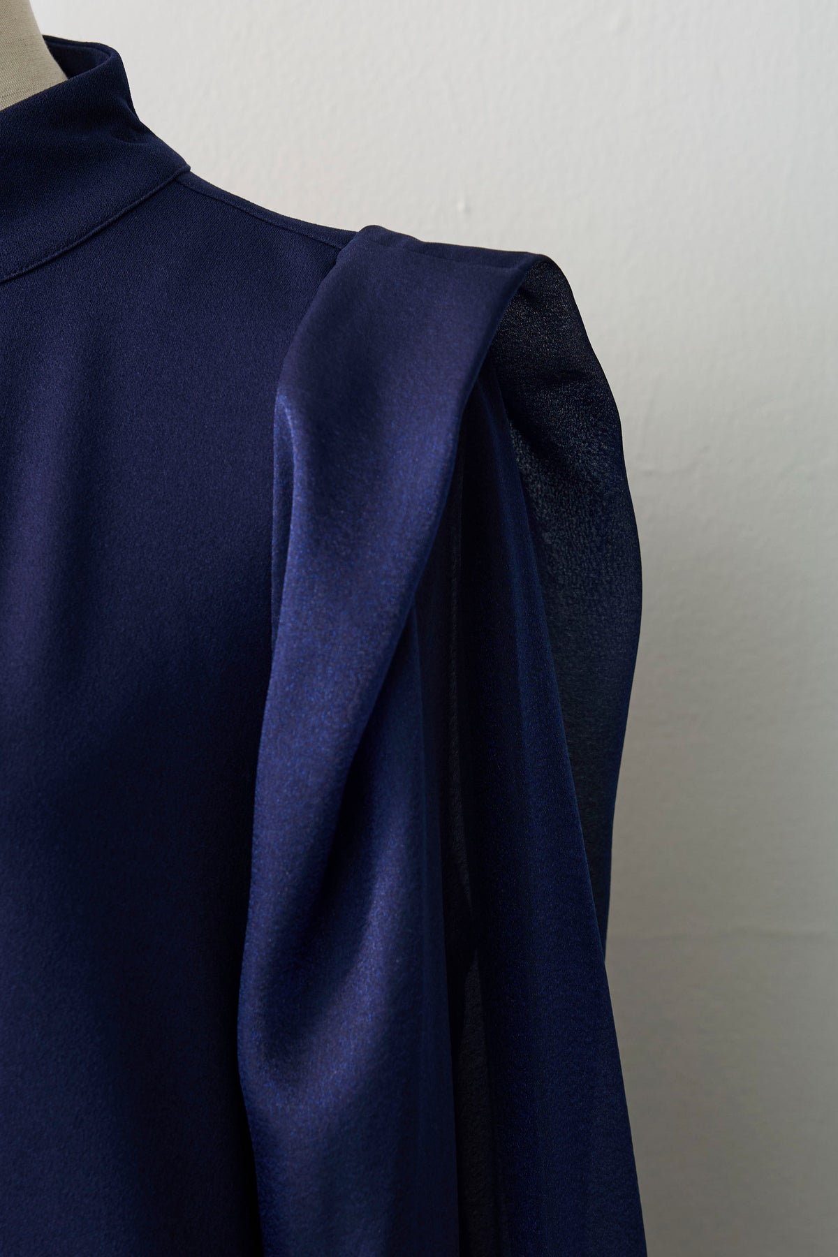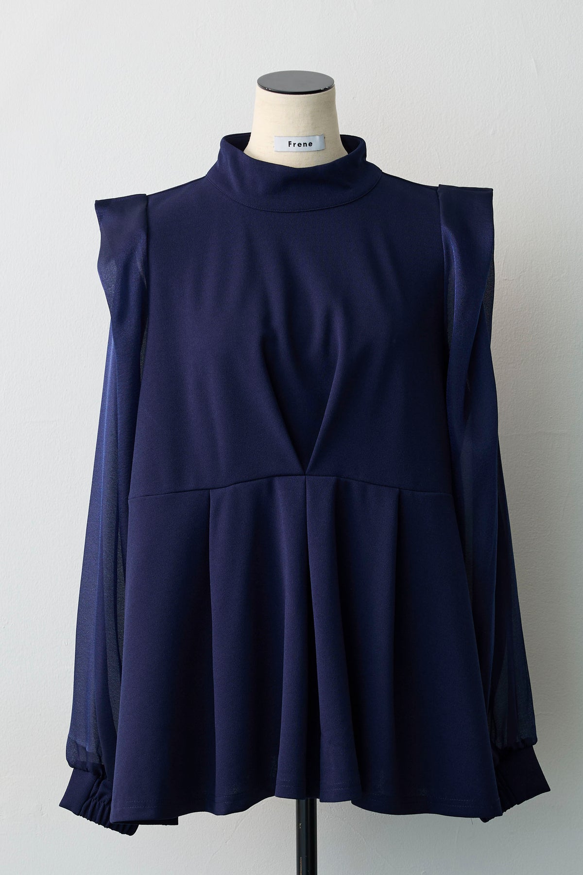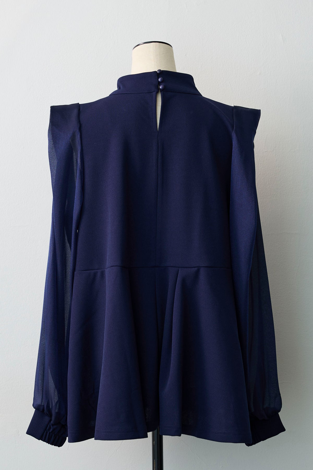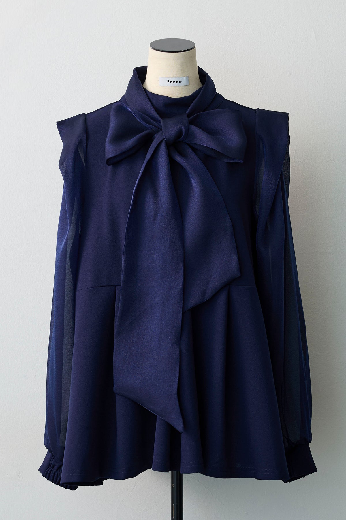 シアーな袖と身頃の異素材ドッキングが、奥行きのある表情を作るブラウス。 顔周りを飾るボリューミーなリボンは、前後どちらでも結べるだけでなく、取り外せばシャープなスタンドネックとしても楽しめるマルチウェイ仕様。 存在感のあるリボンが顔周りを一気に華やかに彩り、アクセサリーいらずで写真映えも抜群。 ウエストにタックを施したペプラムシルエットが、ふわりと腰回りをカバーし、メリハリのあるスタイルを叶えます。