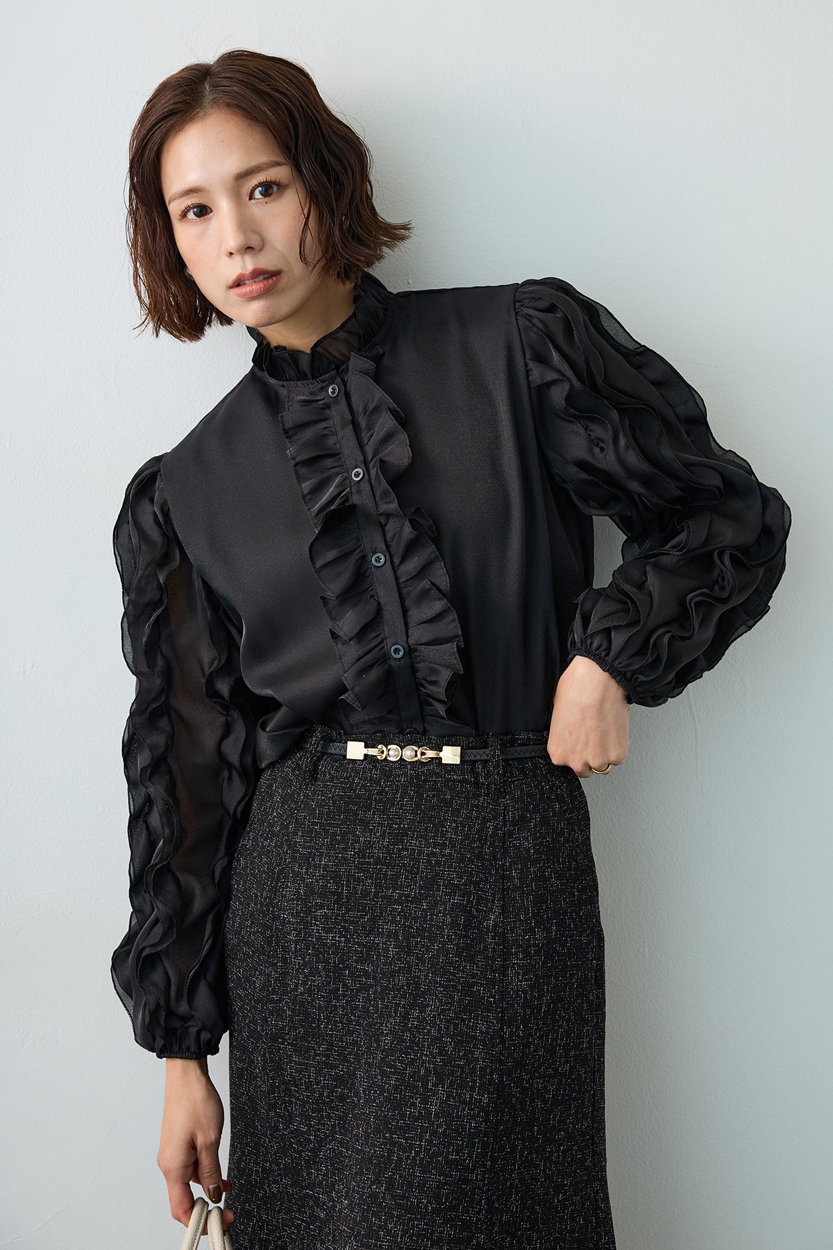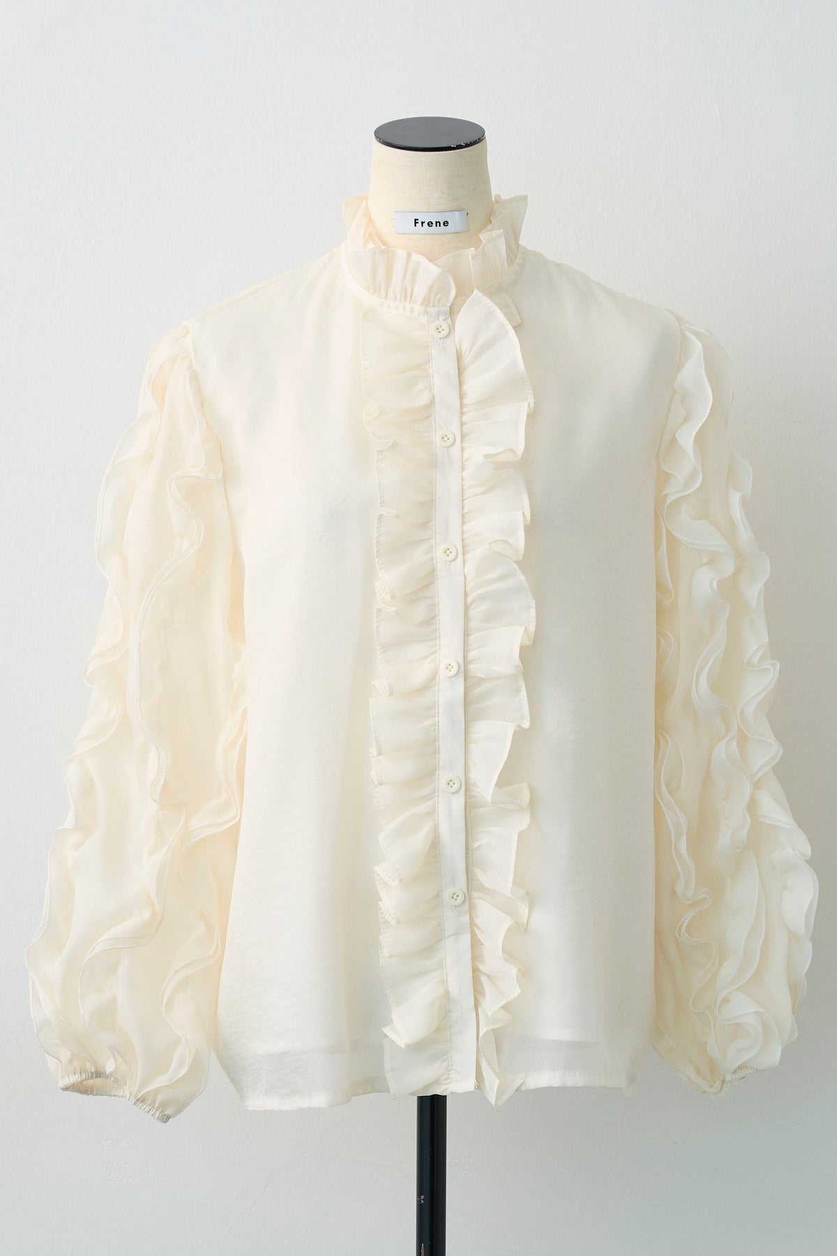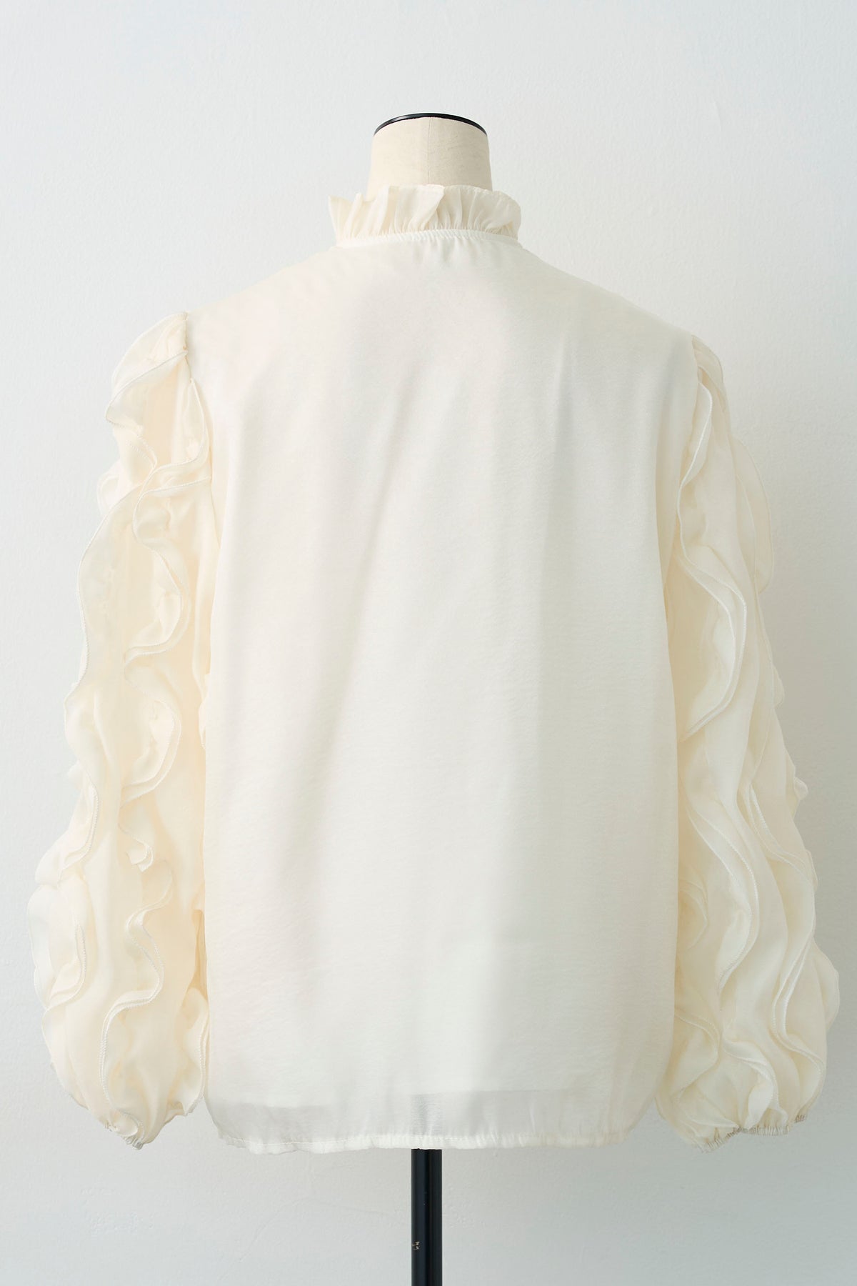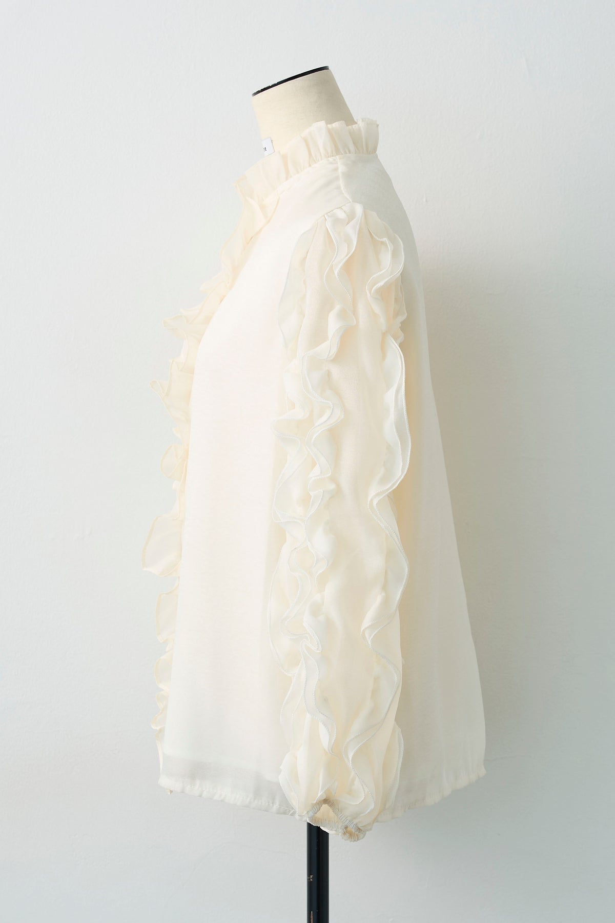 空気を含んだようなシアー素材が、軽やかでセンシュアルな魅力を放つブラウス。 袖やフロントに贅沢にあしらわれたフリルが、立体的な華やかさを演出し、動くたびに優美な表情を見せます。 首元のプチハイネックが全体の甘さを引き締め、クラシカルで上品な印象に。 シンプルなボトムスに合わせるだけで、特別感のある洗練されたスタイルが完成する主役級の一着です。