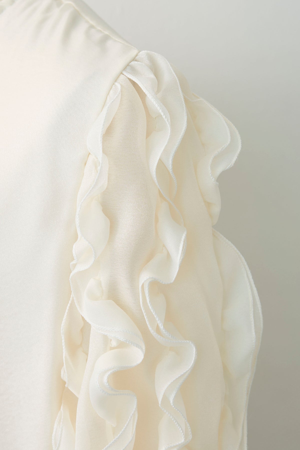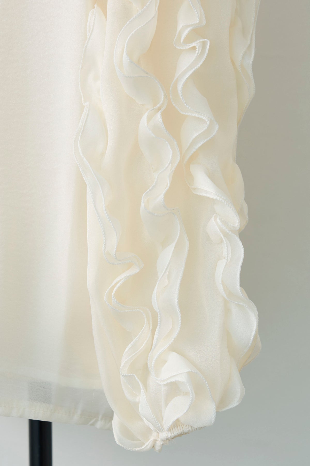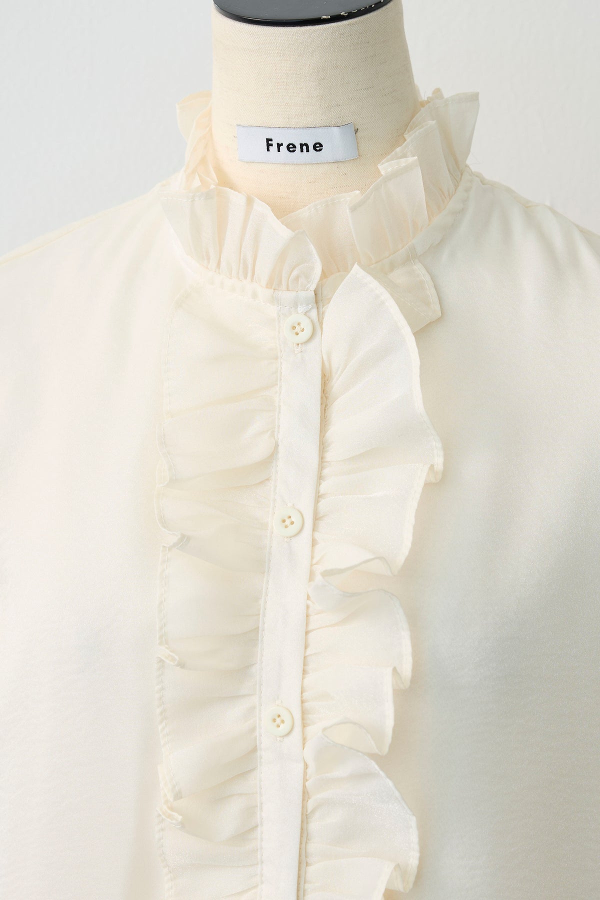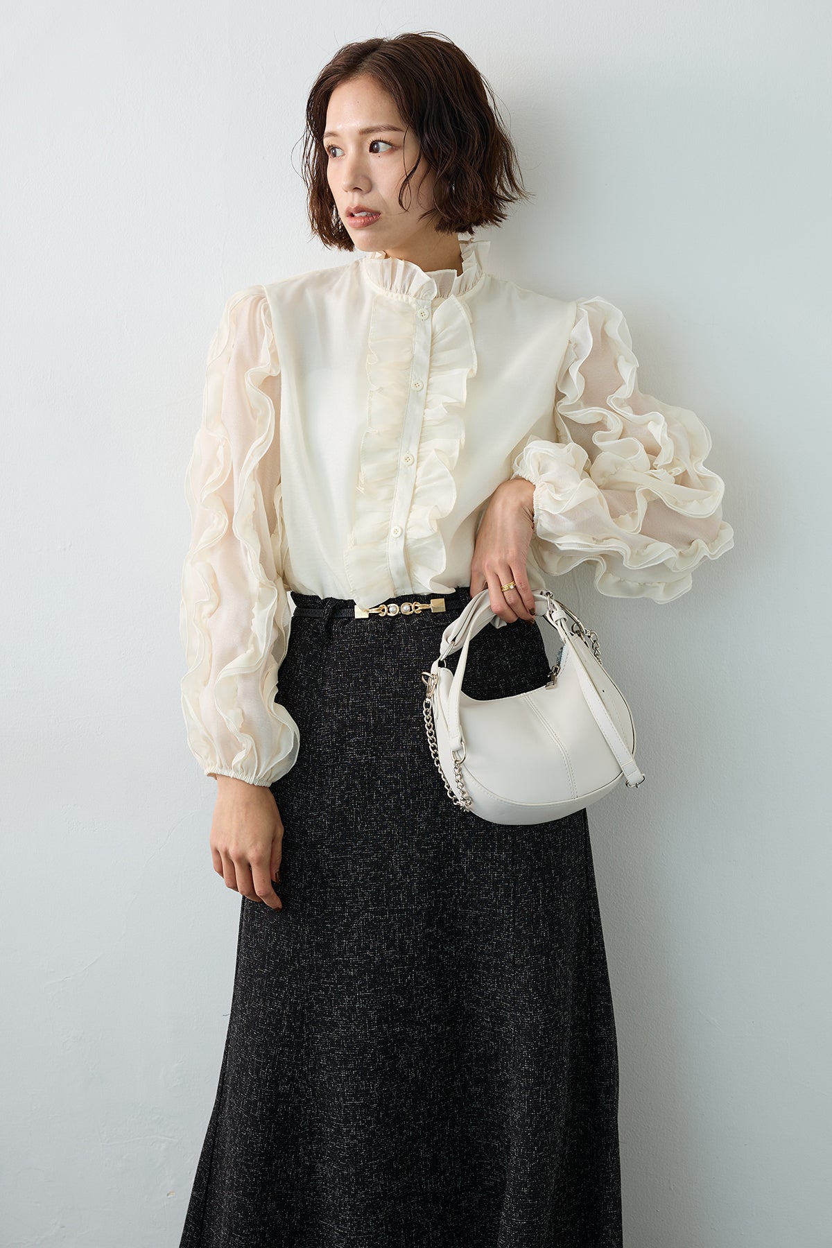 空気を含んだようなシアー素材が、軽やかでセンシュアルな魅力を放つブラウス。 袖やフロントに贅沢にあしらわれたフリルが、立体的な華やかさを演出し、動くたびに優美な表情を見せます。 首元のプチハイネックが全体の甘さを引き締め、クラシカルで上品な印象に。 シンプルなボトムスに合わせるだけで、特別感のある洗練されたスタイルが完成する主役級の一着です。