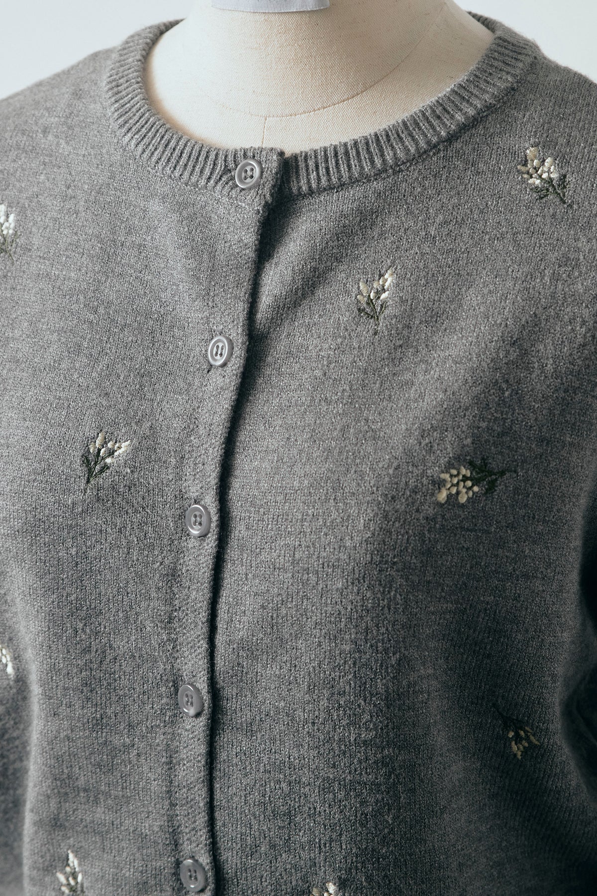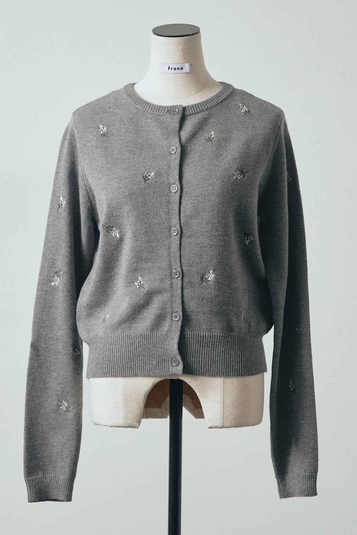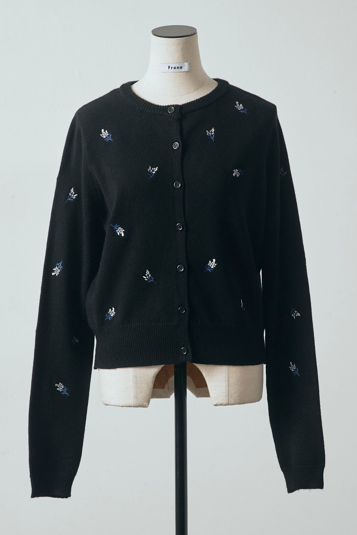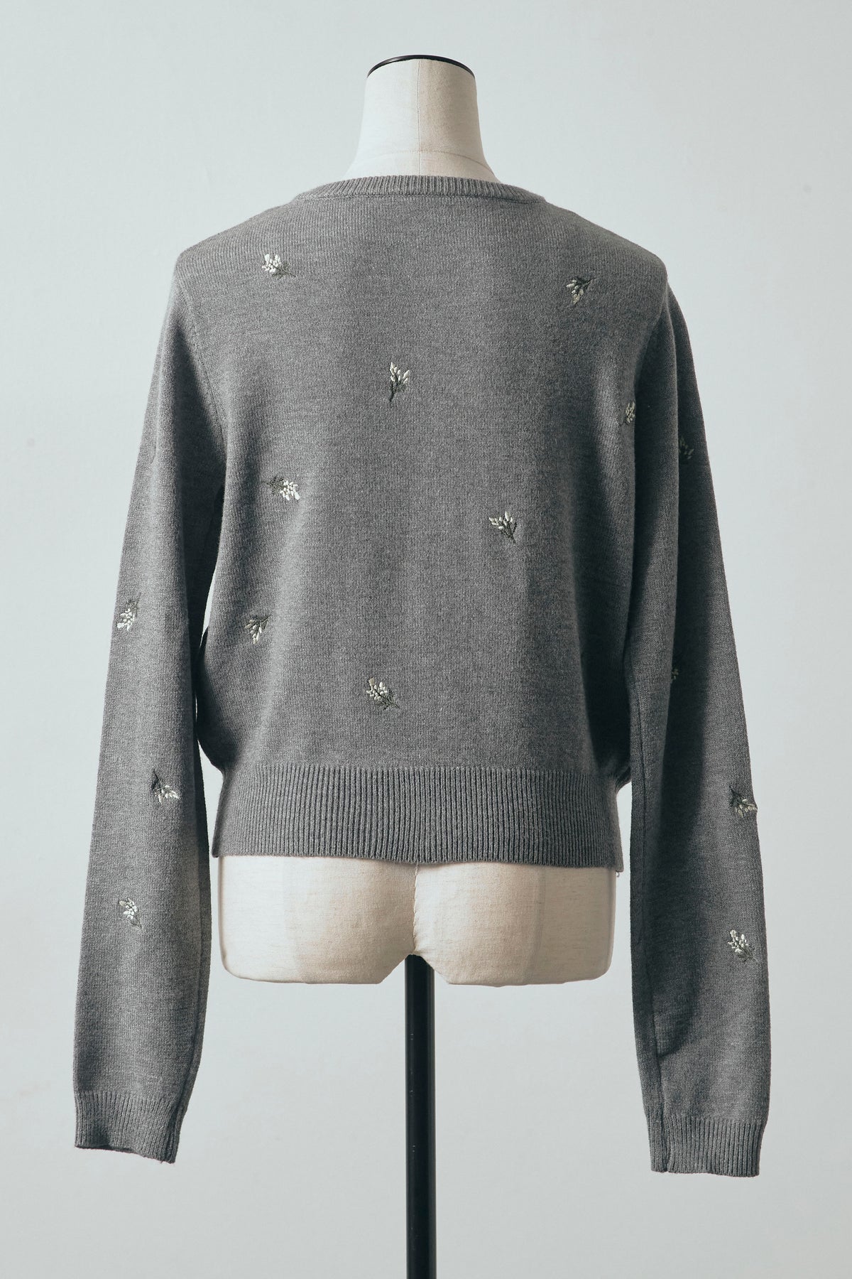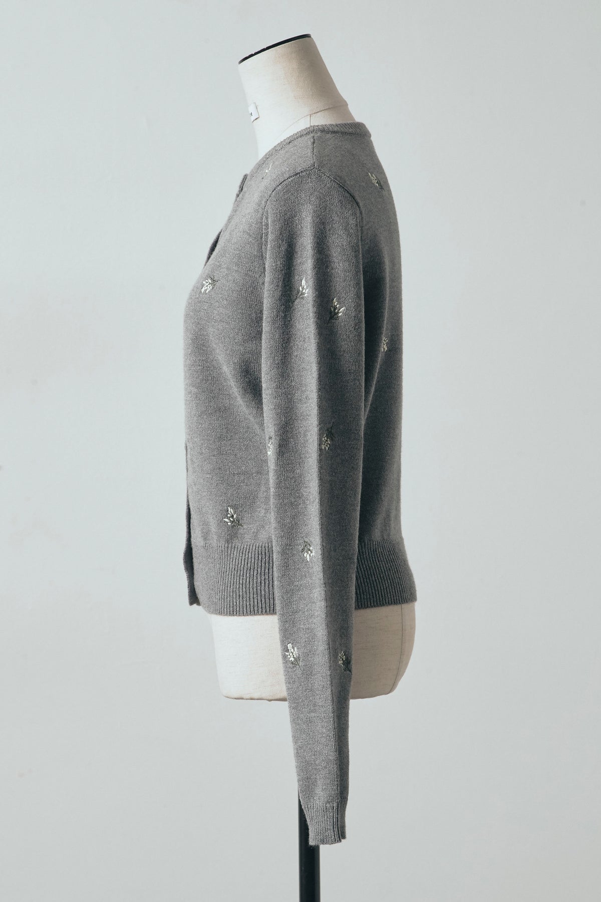 繊細なニュアンスフラワー刺繍を散りばめた、軽やかな印象のニットカーディガン。 コンパクトなクロップド丈が全体のバランスを取りやすく、ボトムスとの組み合わせで表情の変化を楽しめます。 程よくフィットするシルエットで、前を留めてトップス感覚でも着用可能。 シンプルな中にさりげないディテールが映え、スタイリングに柔らかなアクセントを添える一着です。