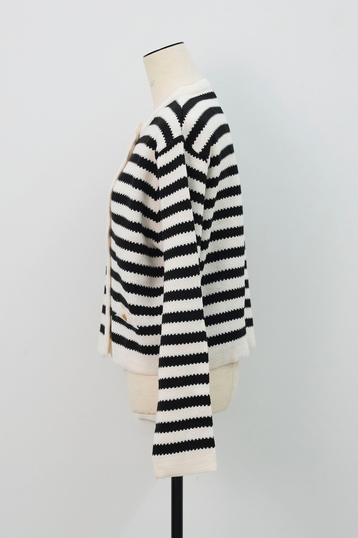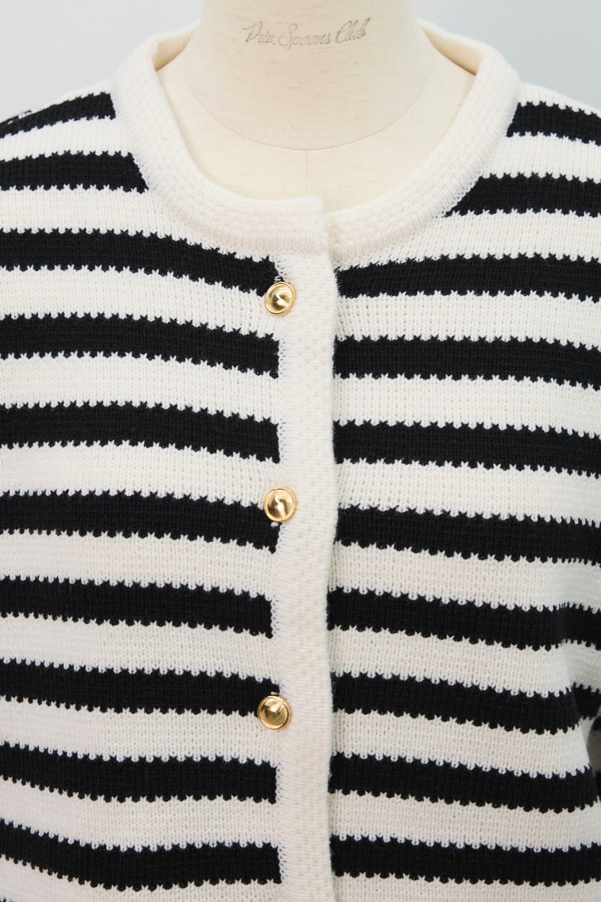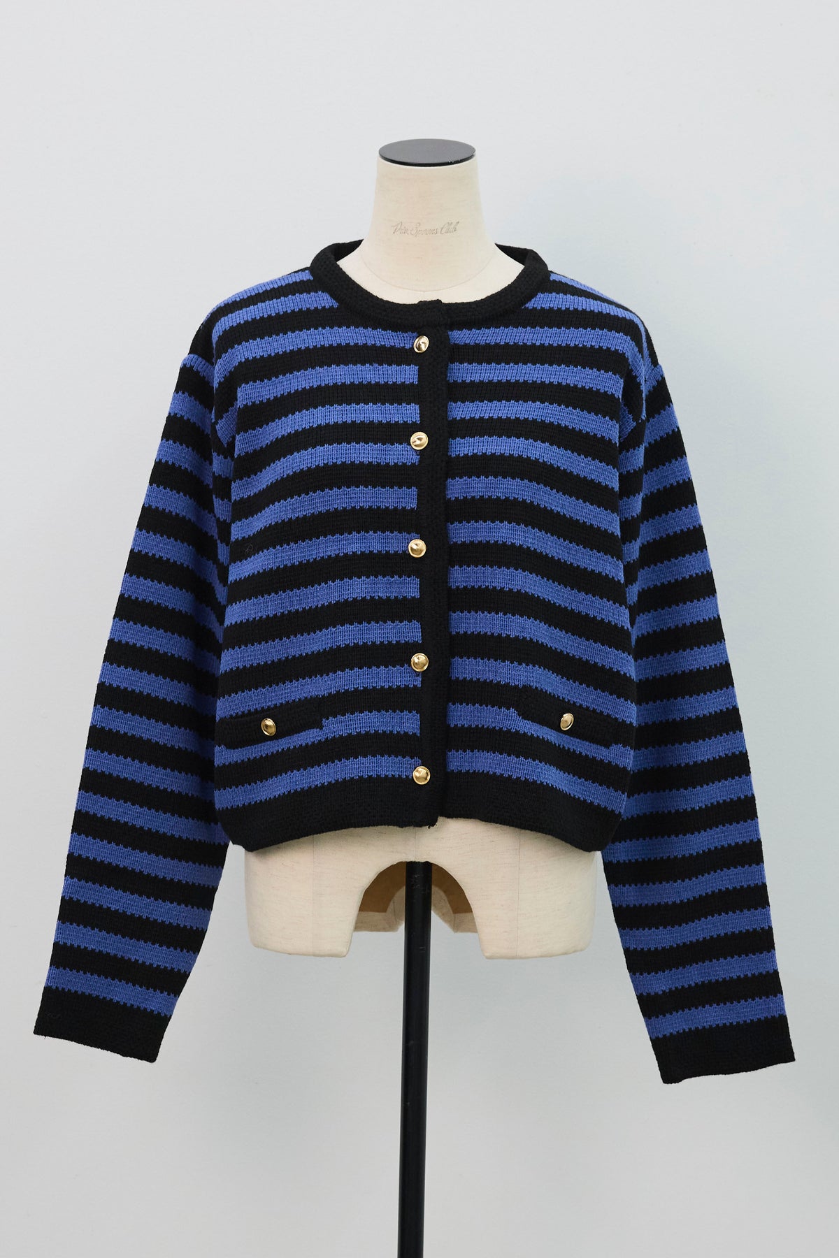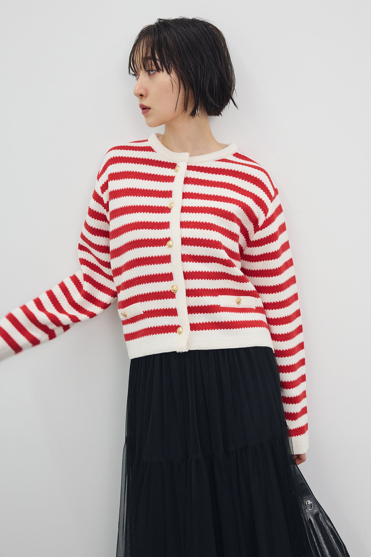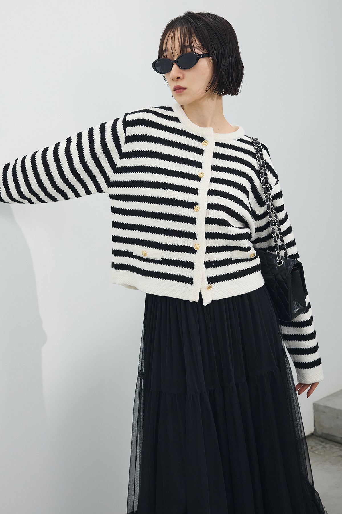 上品なゴールドボタンをあしらった、クラシカルムード漂うカーディガン。 コンパクトな丈感とすっきりとしたシルエットで、どんなボトムともバランスよく合わせられます。 ボーダーのリズムがスタイリングに程よいアクセントを加え、羽織るだけでこなれた印象に。 ロングスカートやワイドパンツを合わせた抜け感のあるスタイルもおすすめです。