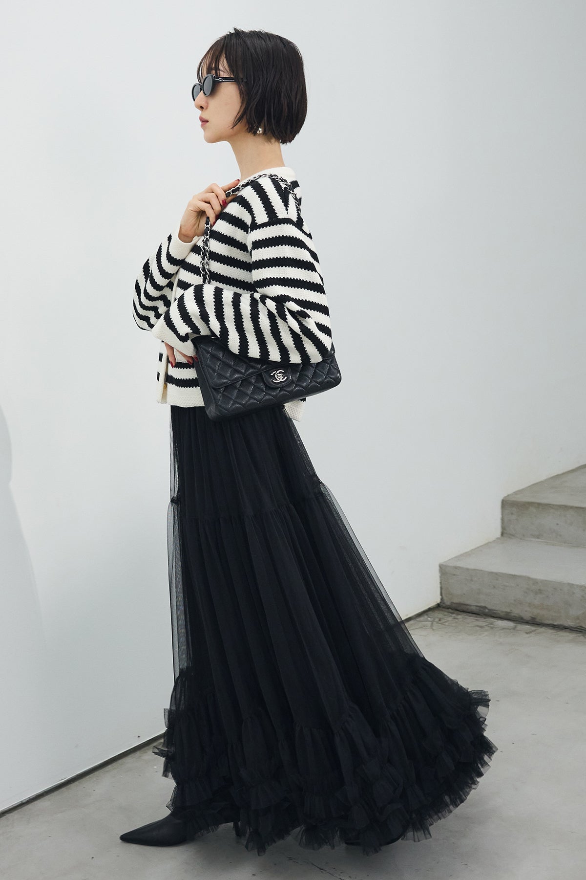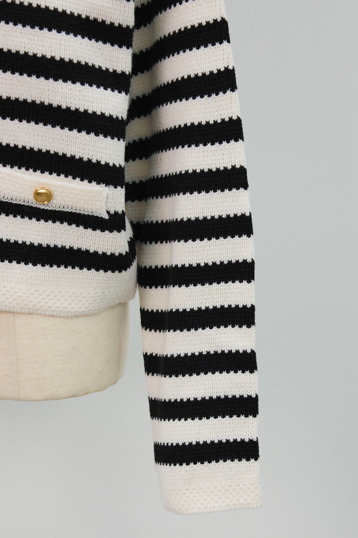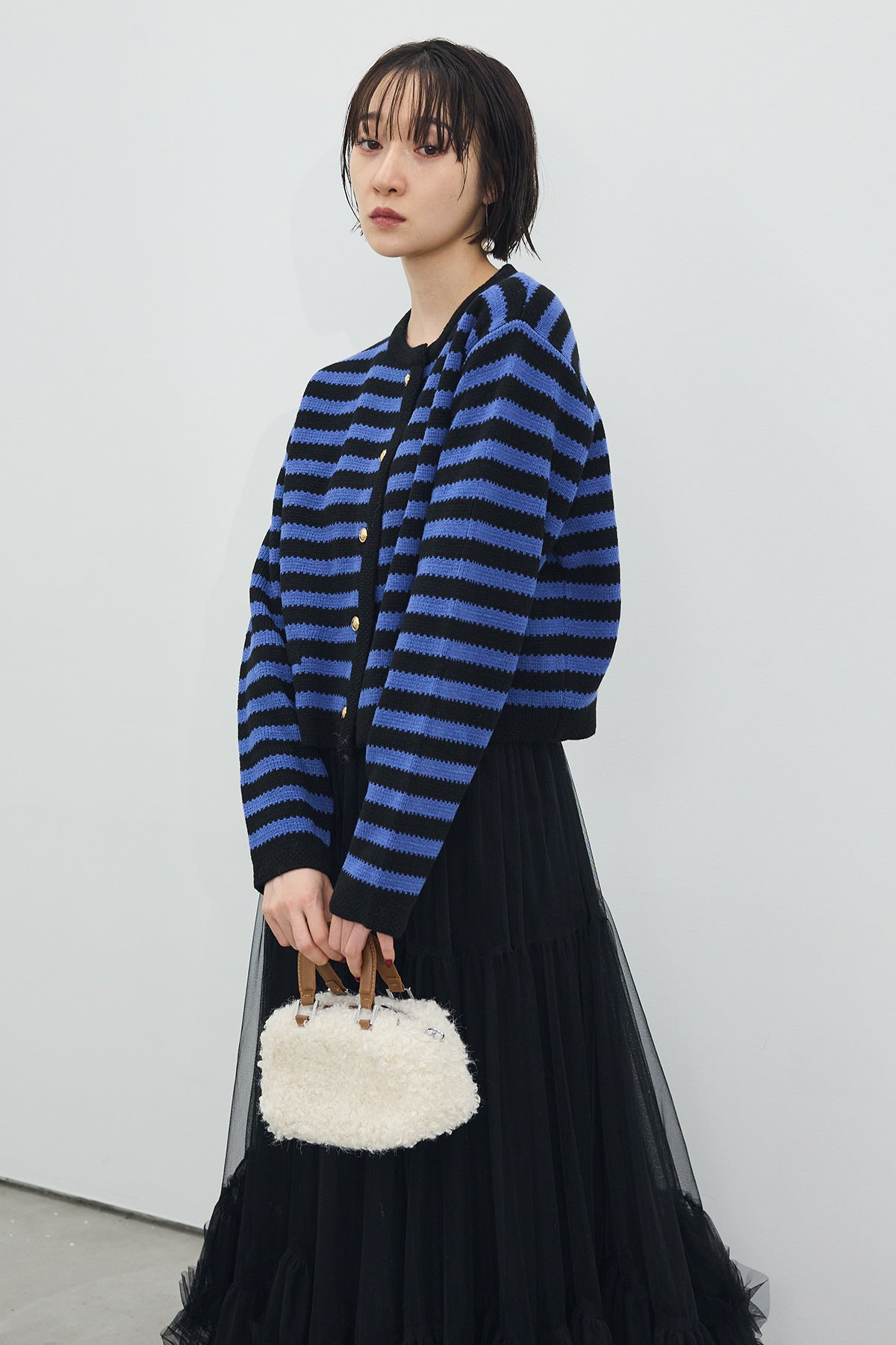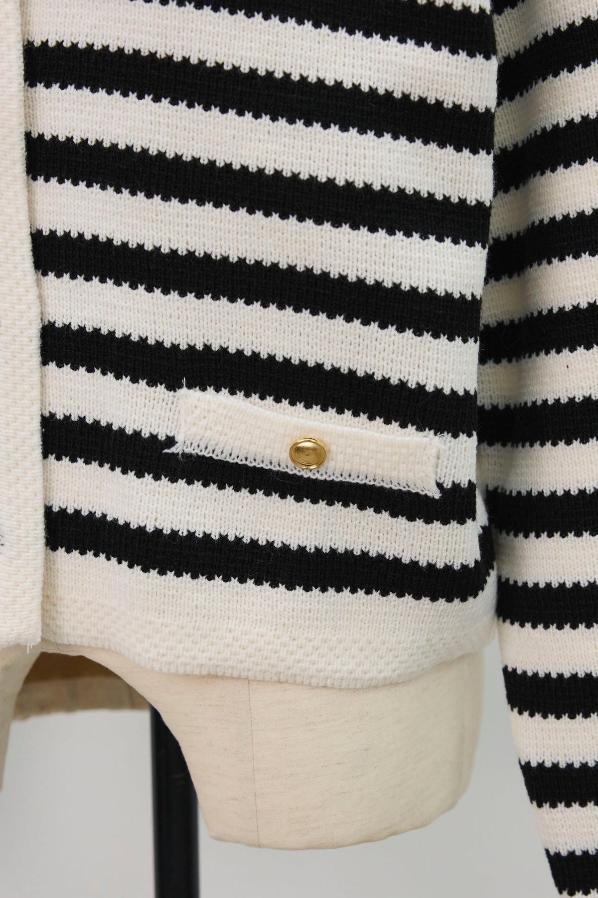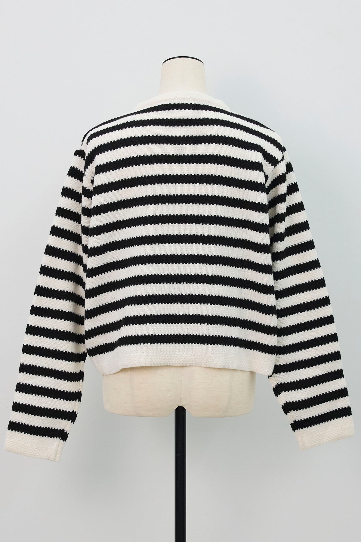 上品なゴールドボタンをあしらった、クラシカルムード漂うカーディガン。 コンパクトな丈感とすっきりとしたシルエットで、どんなボトムともバランスよく合わせられます。 ボーダーのリズムがスタイリングに程よいアクセントを加え、羽織るだけでこなれた印象に。 ロングスカートやワイドパンツを合わせた抜け感のあるスタイルもおすすめです。