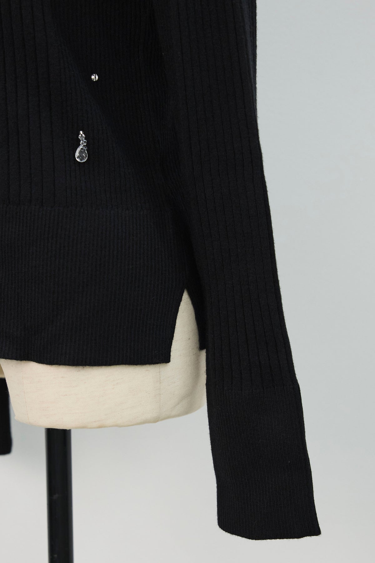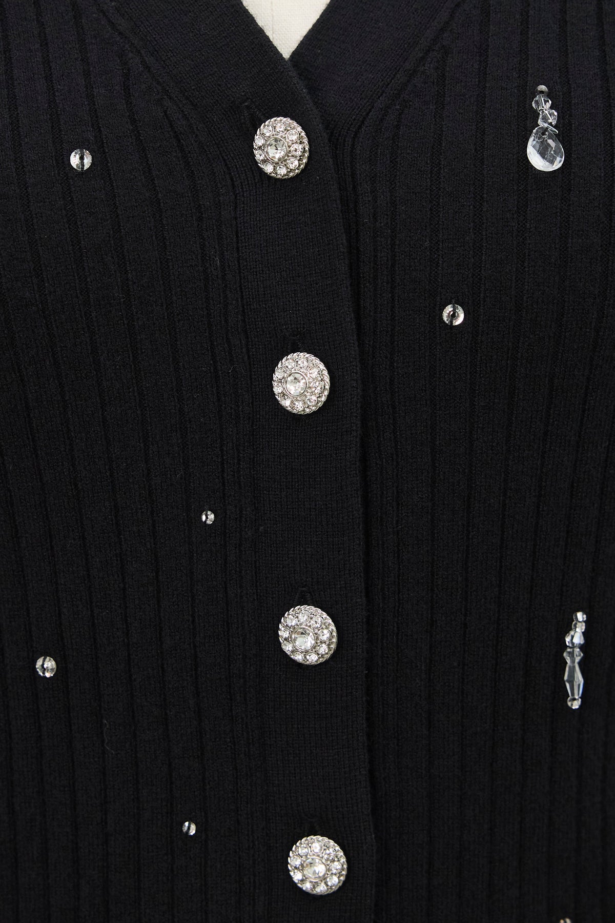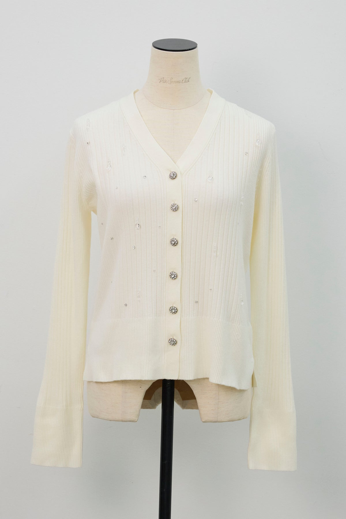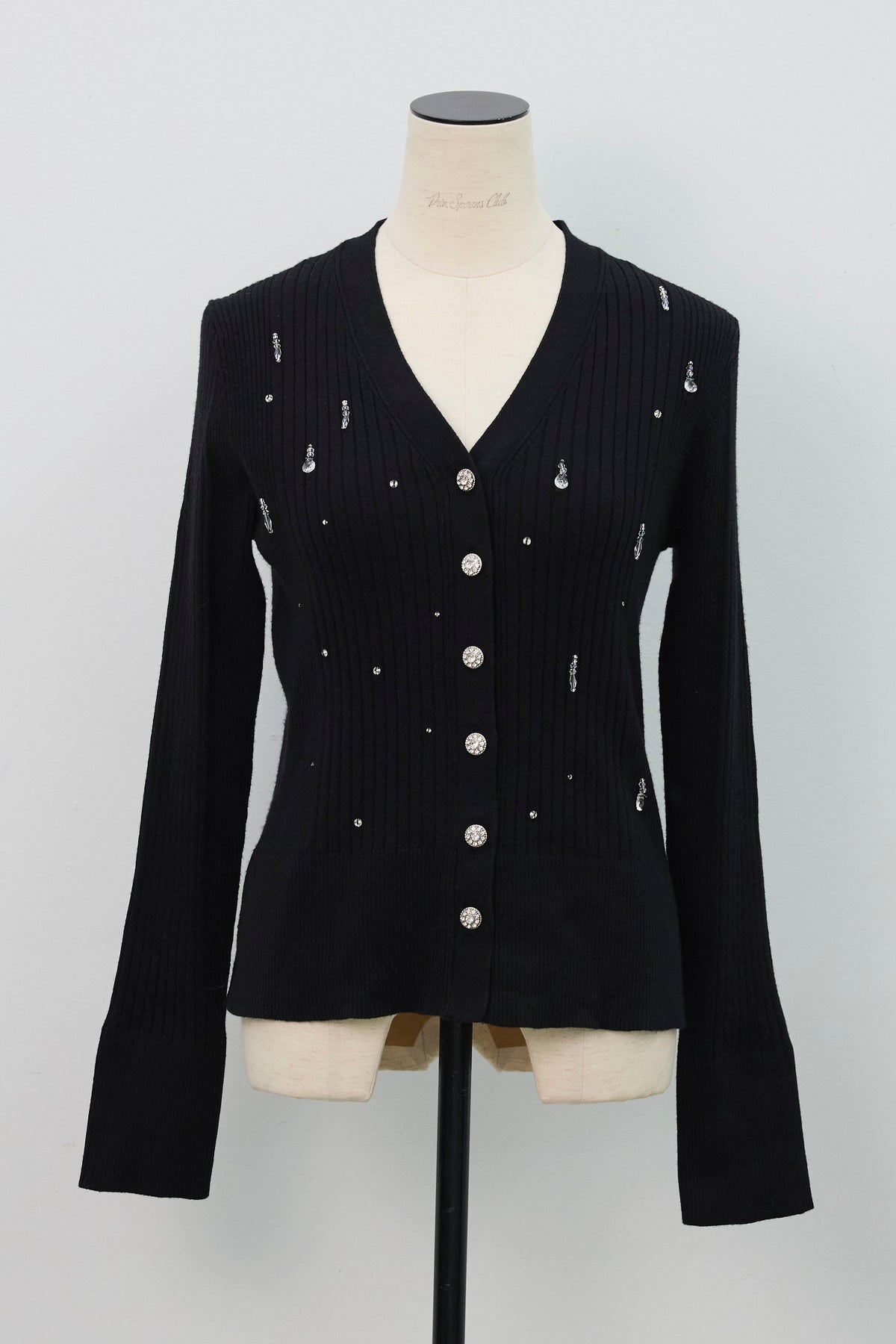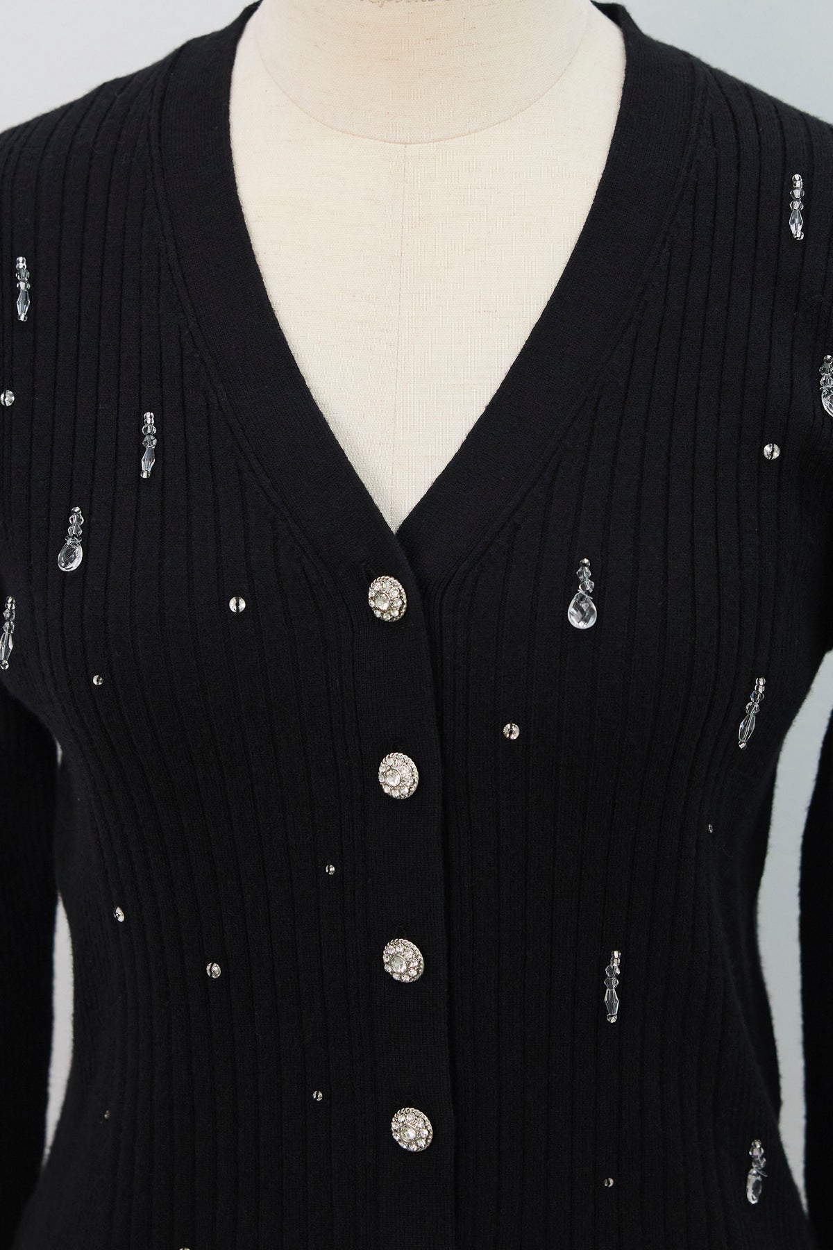 一枚で主役級の華やかさを放つニットカーディガン。 きらめくビジューを散りばめ、フロントにはクリスタル調ボタンをあしらったジュエリーのような一枚です。 リブ編みのすっきりとしたシルエットが女性らしいラインを引き立て、羽織りとしてはもちろん、トップスとしても着映えするアイテムです。