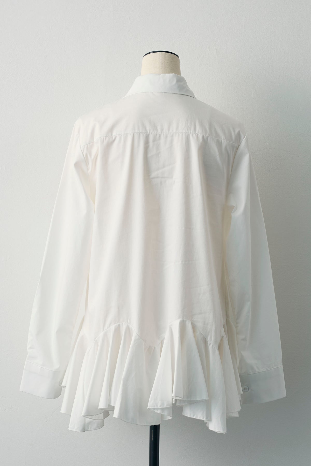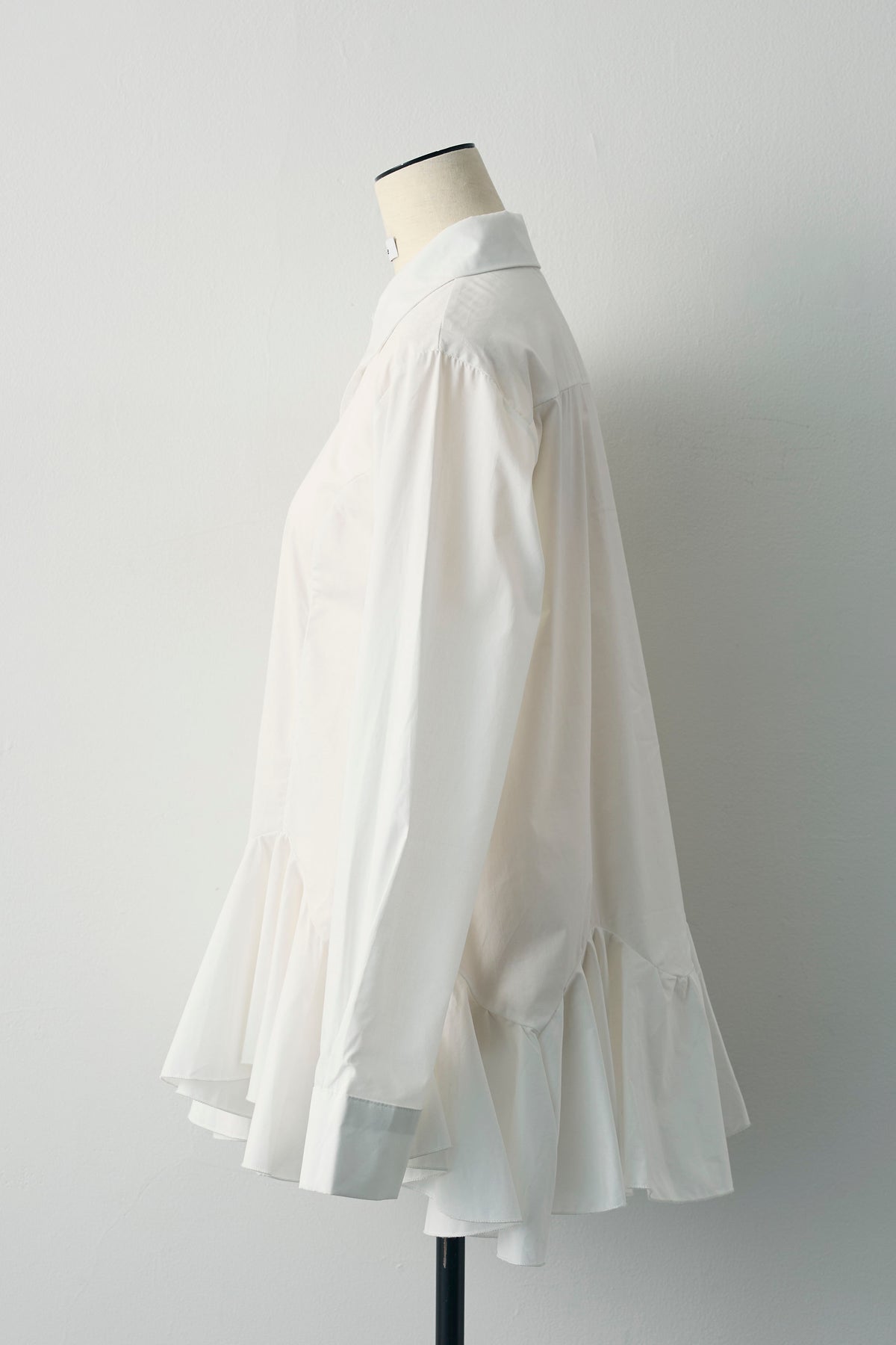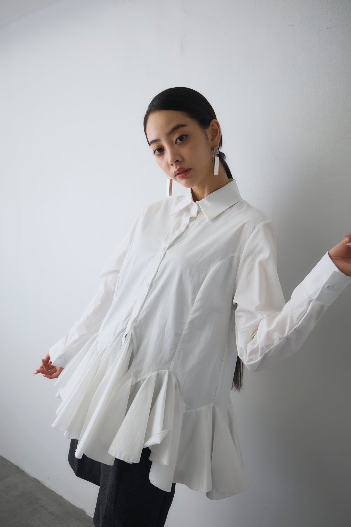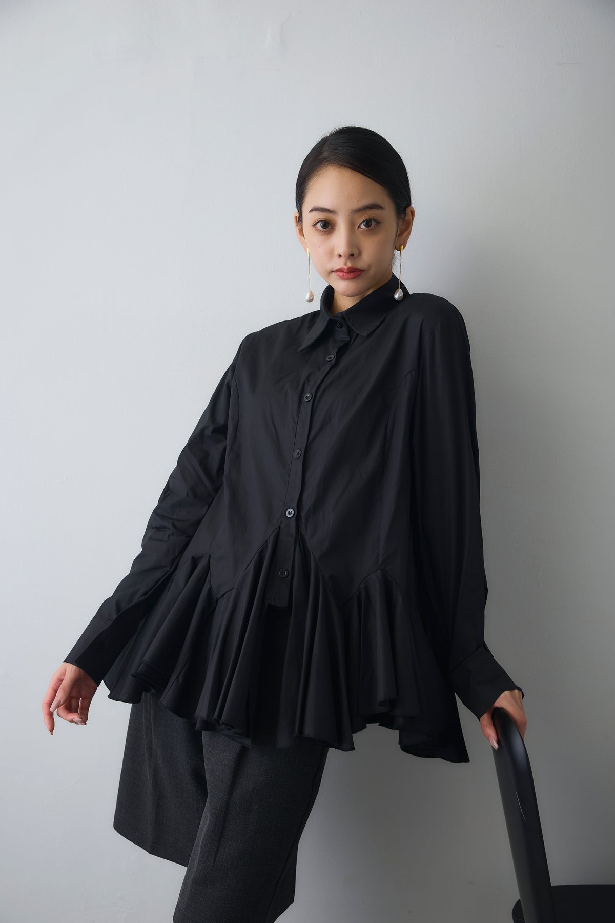 裾まわりにパネル切り替えを入れ、ふわっと広がるフレアが主役のシャツ。前後で少し丈差をつけて横から見ても立体的に。ハリのあるシャツ地で広がりすぎず、1枚でも重ね着でも使いやすいデザインです。短めのジャケットやカーデの下から裾フレアをのぞかせると、動きが出て腰位置も高く見え、いつものコーデがぐっとこなれます。