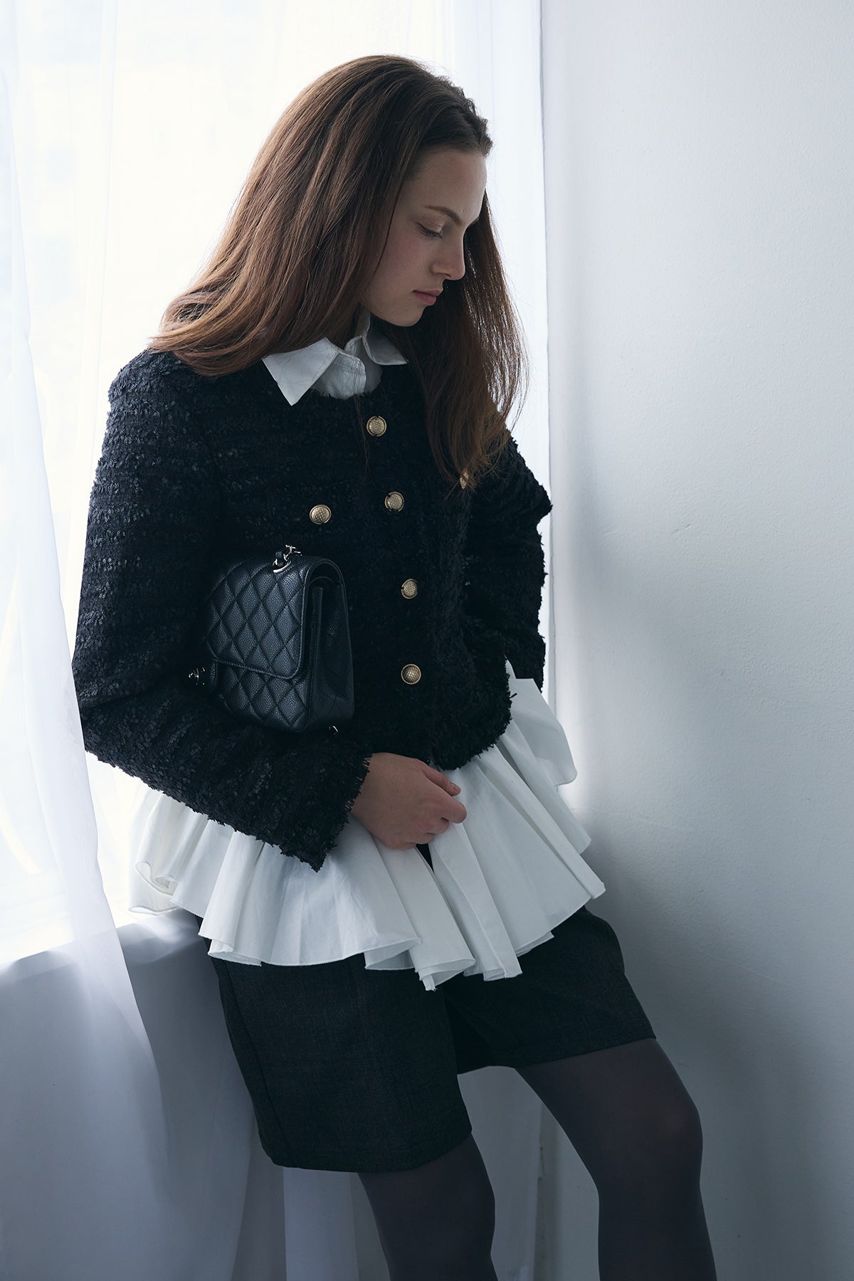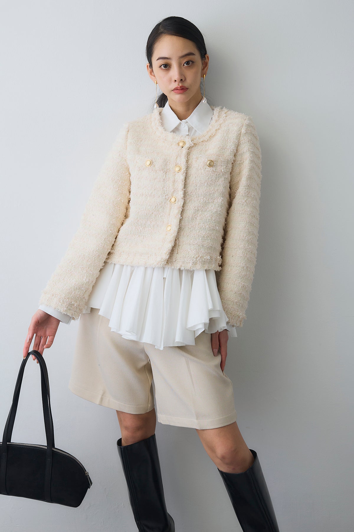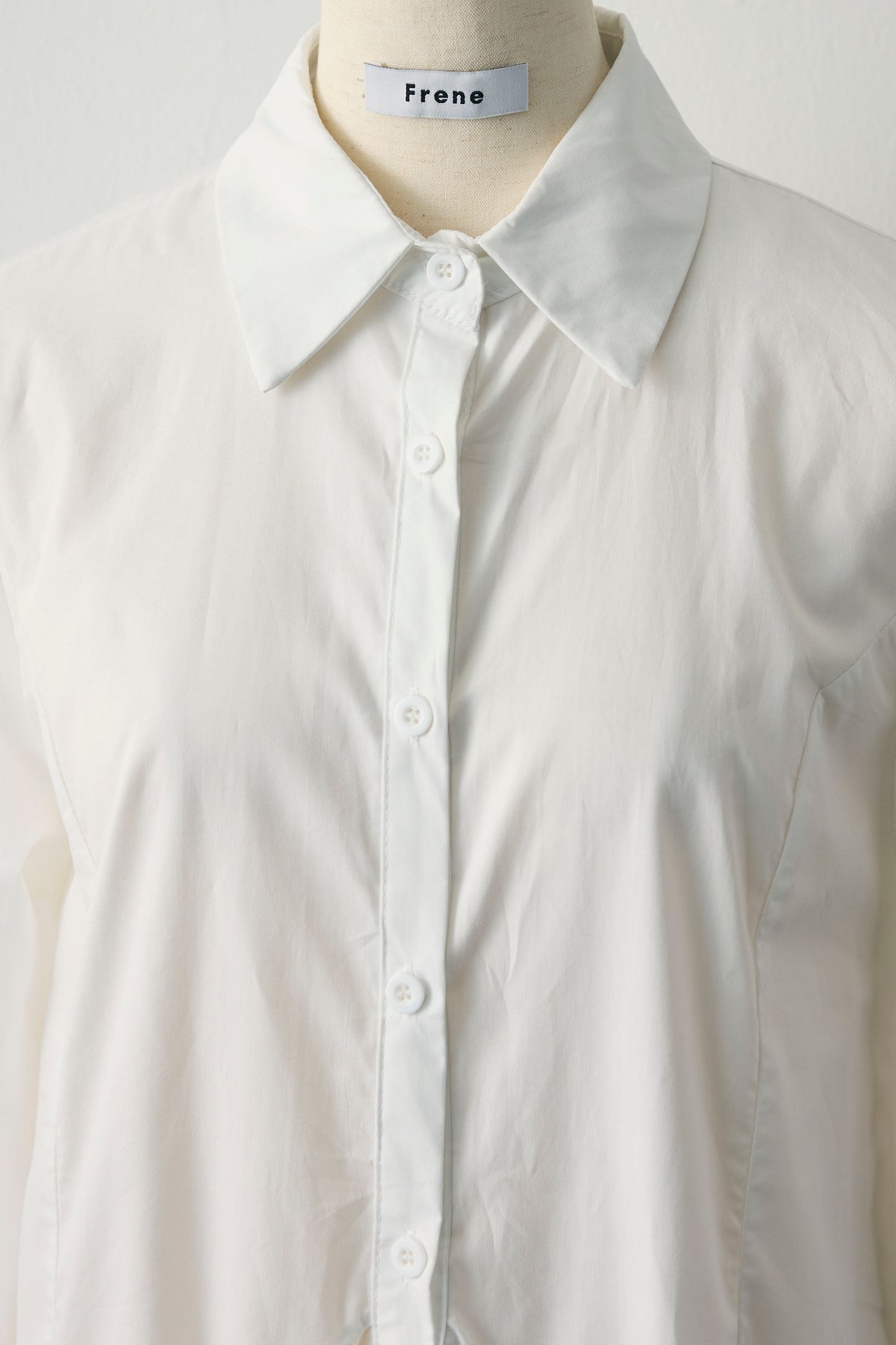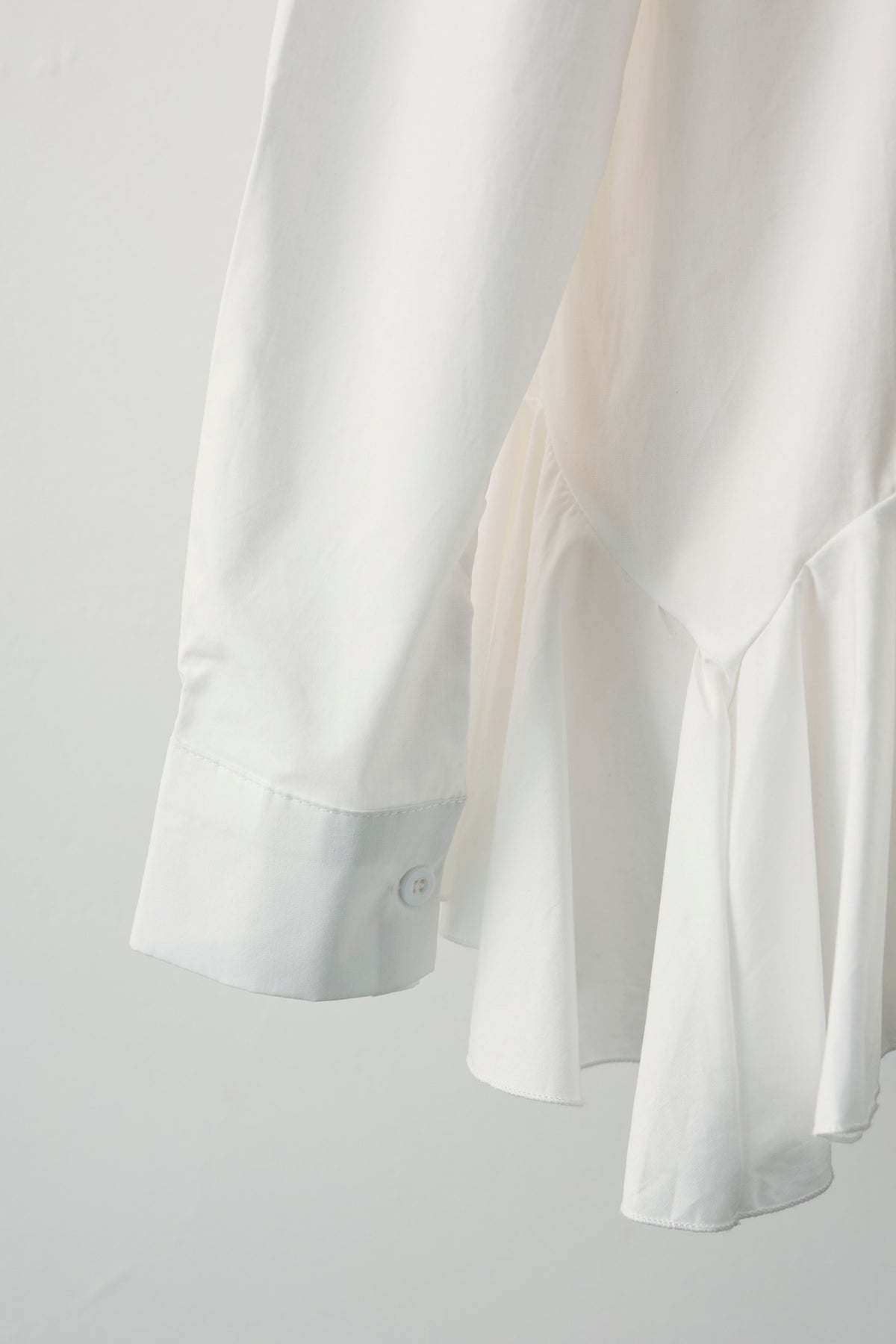 裾まわりにパネル切り替えを入れ、ふわっと広がるフレアが主役のシャツ。前後で少し丈差をつけて横から見ても立体的に。ハリのあるシャツ地で広がりすぎず、1枚でも重ね着でも使いやすいデザインです。短めのジャケットやカーデの下から裾フレアをのぞかせると、動きが出て腰位置も高く見え、いつものコーデがぐっとこなれます。