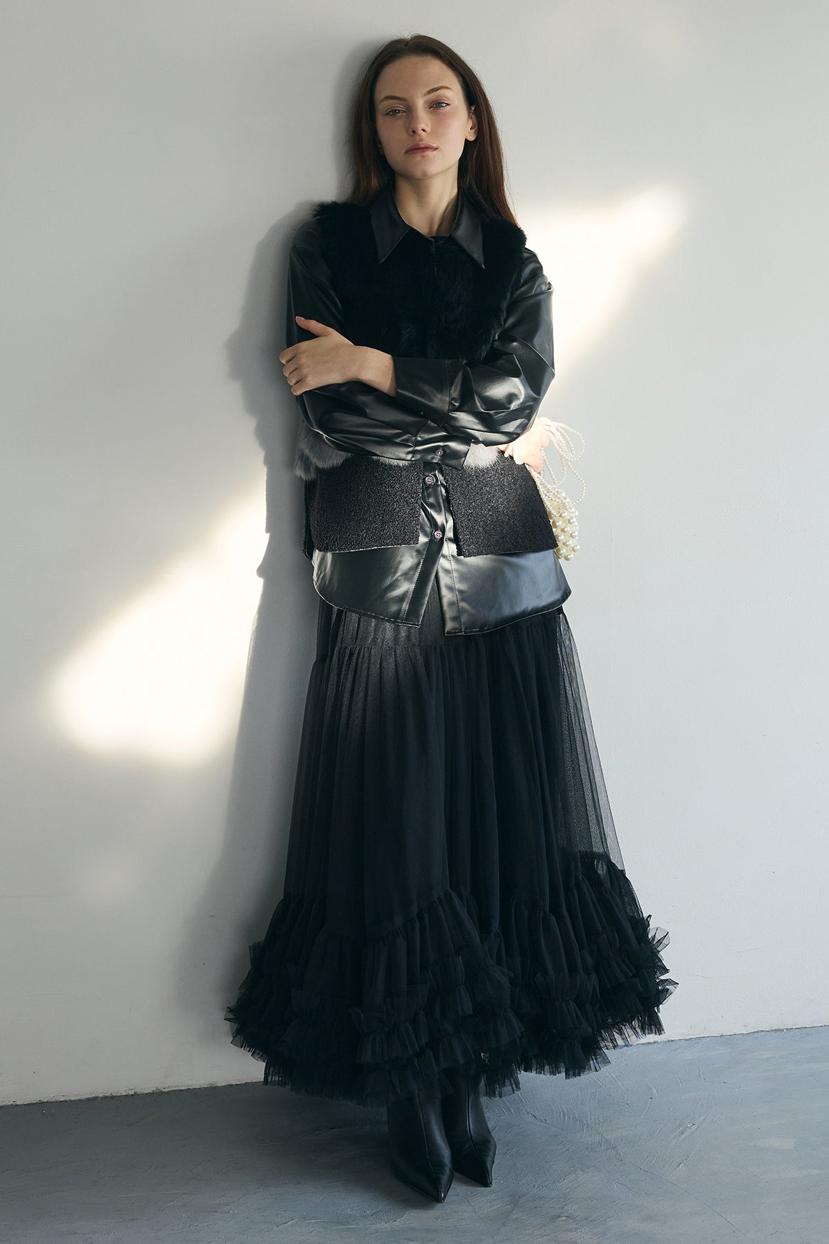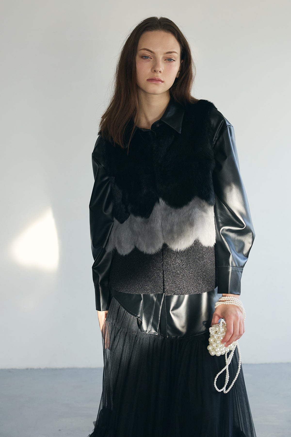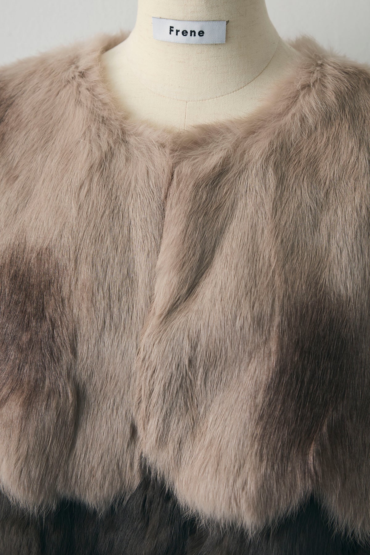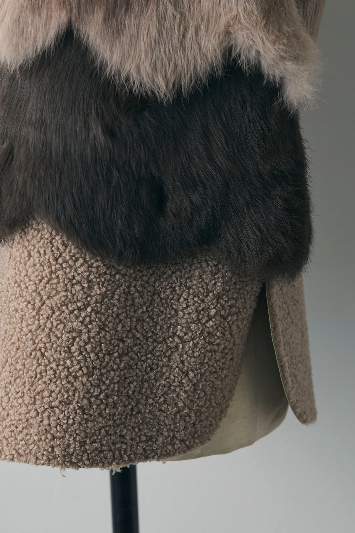 波のように重ねた配色フェイクファーが主役の軽いベスト。上身頃はふわっと、裾はボア調で立体感。シャツや薄手ニット、ワンピースに重ねるだけで着映え。前開けで抜け感、閉じてすっきり。腰が隠れる丈でパンツにもスカートにも好相性