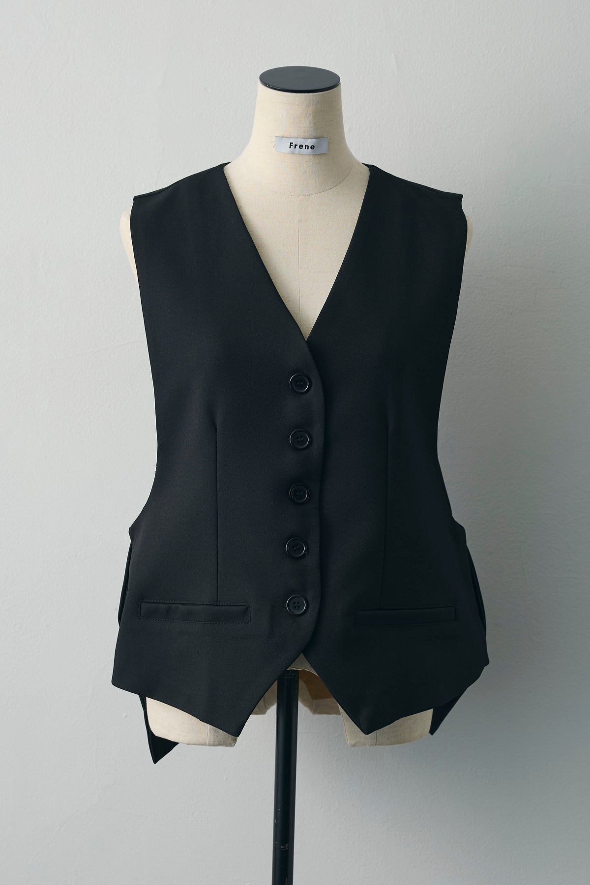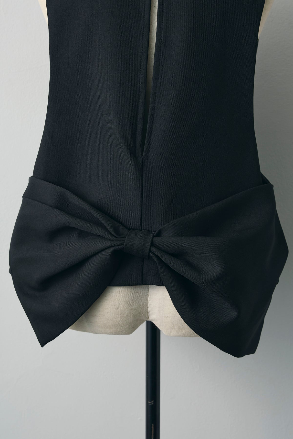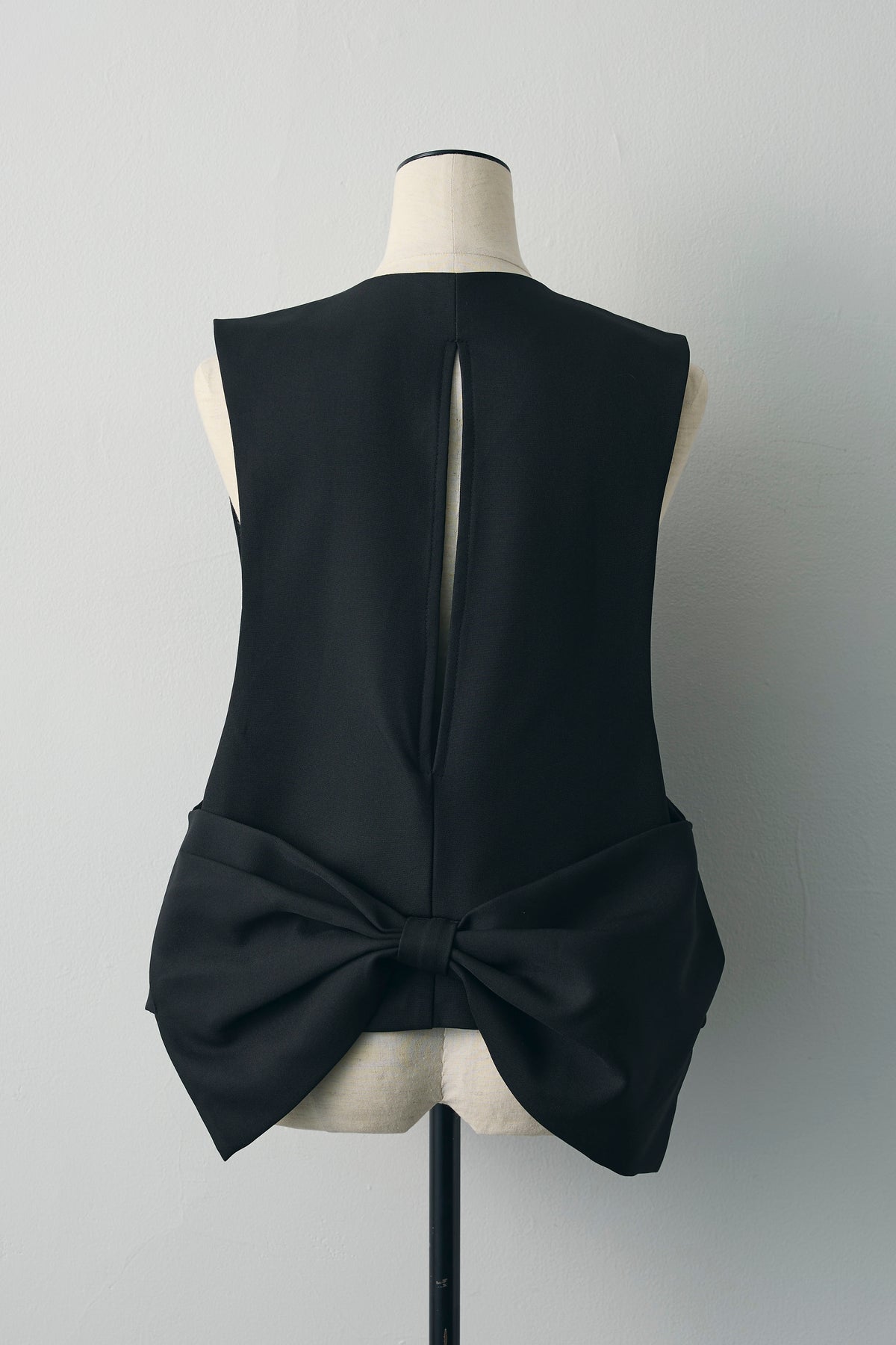 前はすっきりVネック、後ろに大きなリボンをあしらった主役ジレ。ほどよいくびれが出て横からのラインもきれい。シャツやワンピの上に重ねるだけで甘辛ミックスに仕上がります。ヒップにかかる着丈で体型カバーもしやすい一枚。
