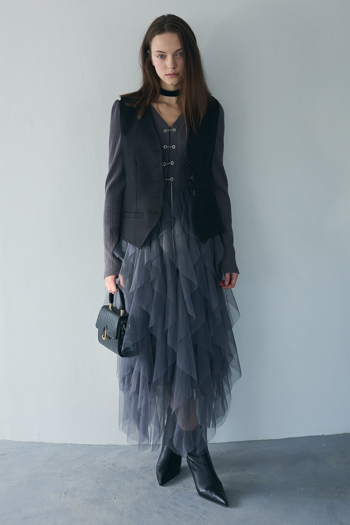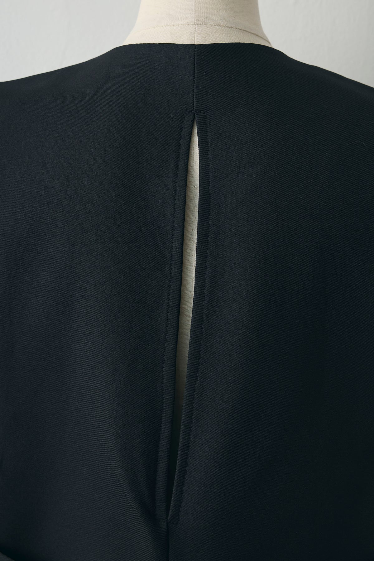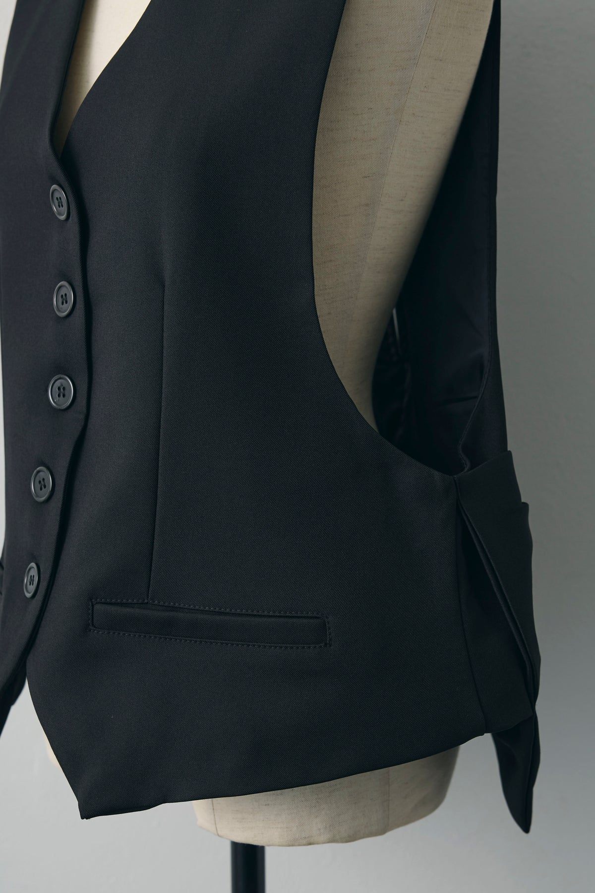 前はすっきりVネック、後ろに大きなリボンをあしらった主役ジレ。ほどよいくびれが出て横からのラインもきれい。シャツやワンピの上に重ねるだけで甘辛ミックスに仕上がります。ヒップにかかる着丈で体型カバーもしやすい一枚。