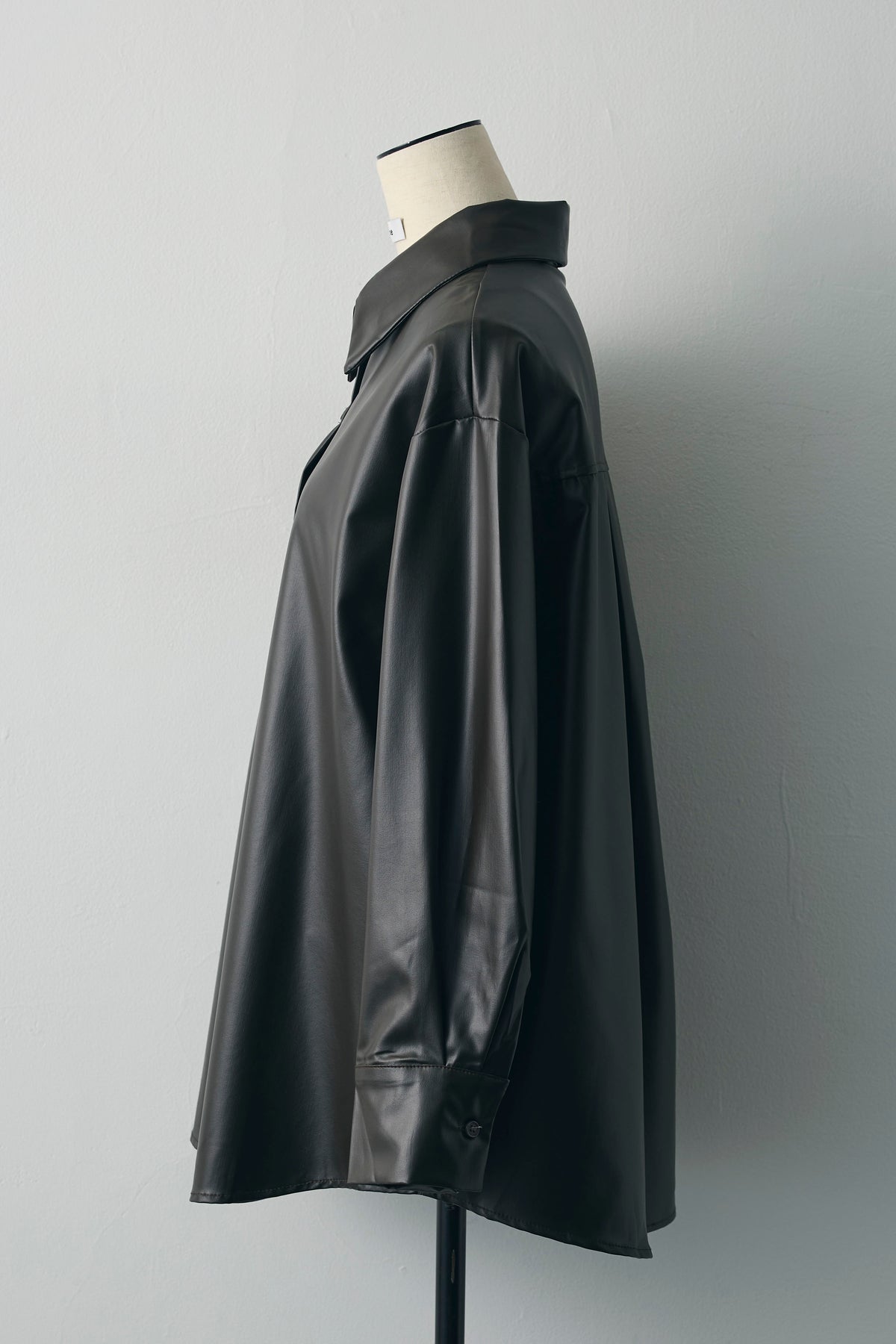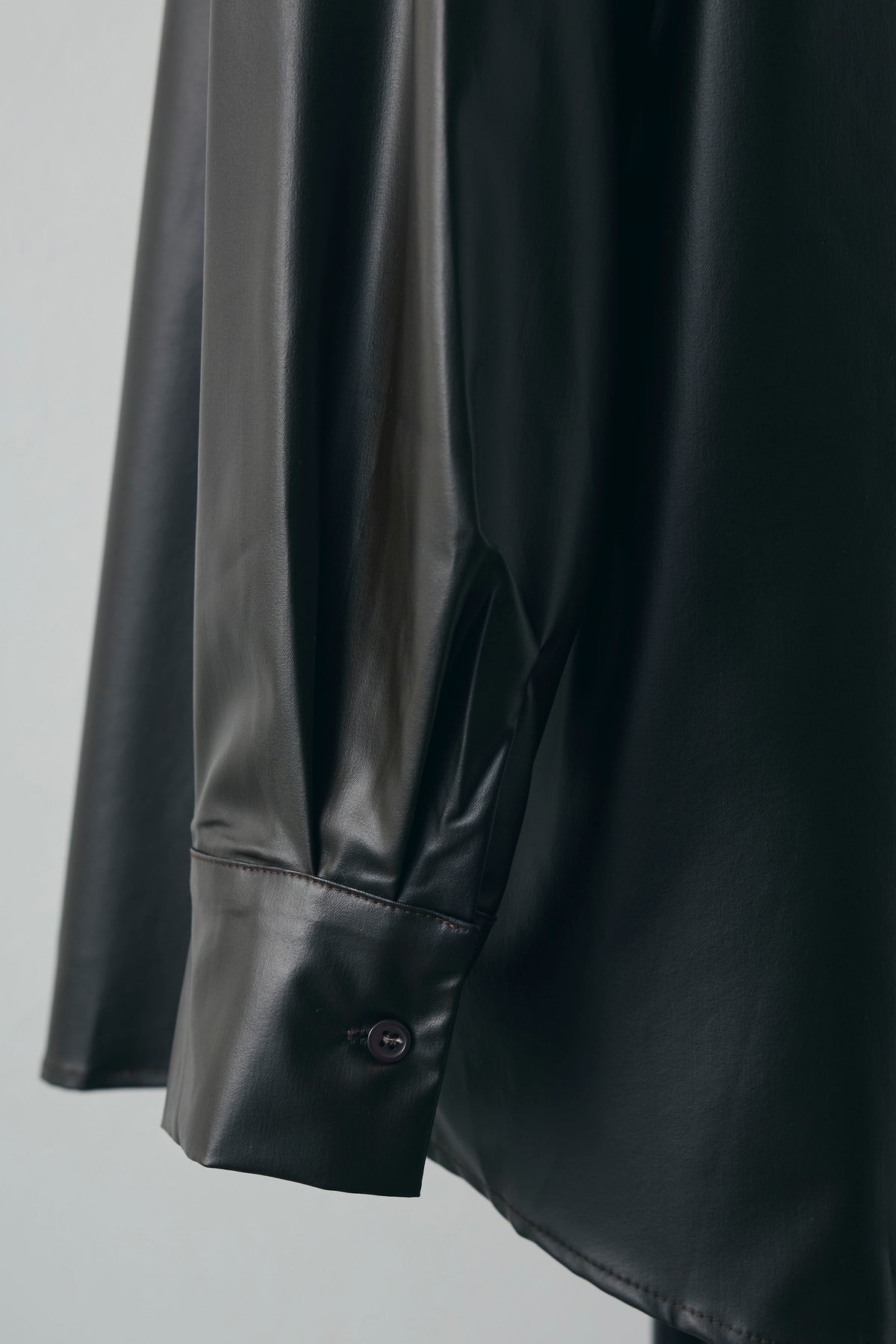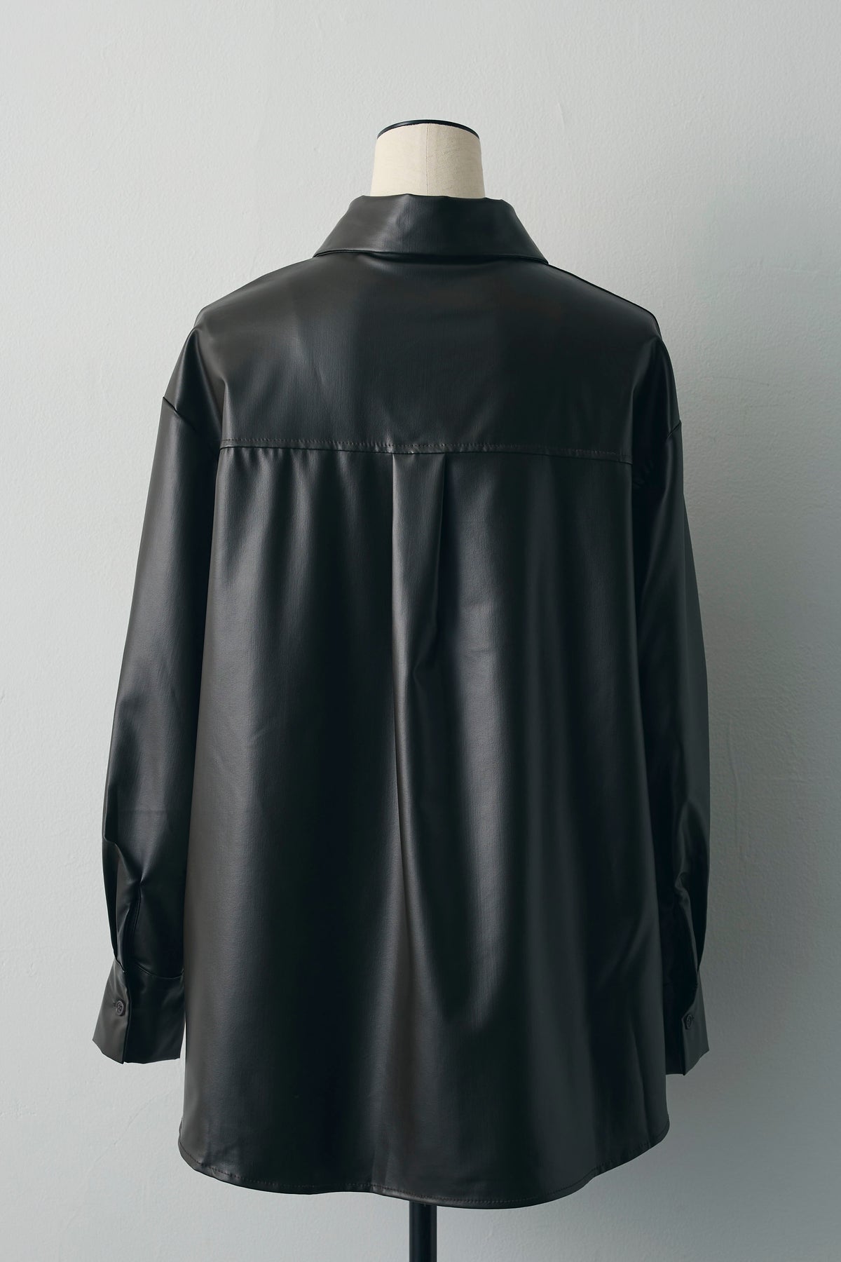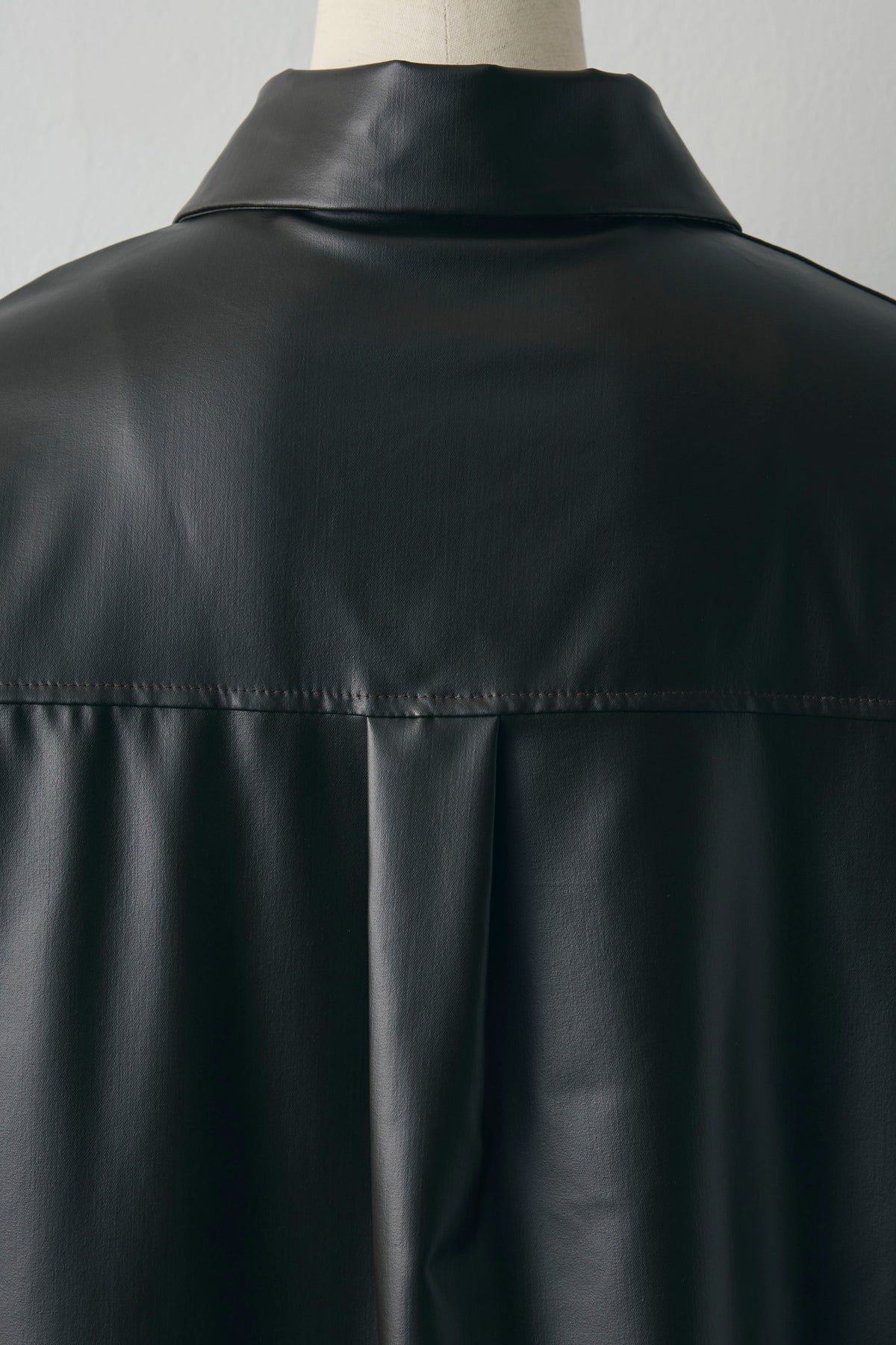 軽くてやわらかなフェイクレザー見えのシャツ。ほどよいツヤと落ち感で大人っぽく、オーバーサイズでも体が泳いですっきり見えます。前を留めてトップスとしても、開けて羽織りとしても便利。デニムでカジュアルに、チュールやタイトスカートで甘辛ミックスもおすすめ。