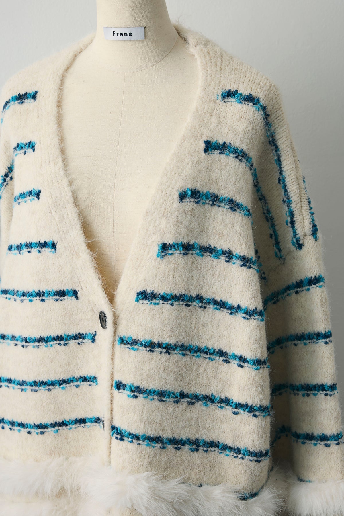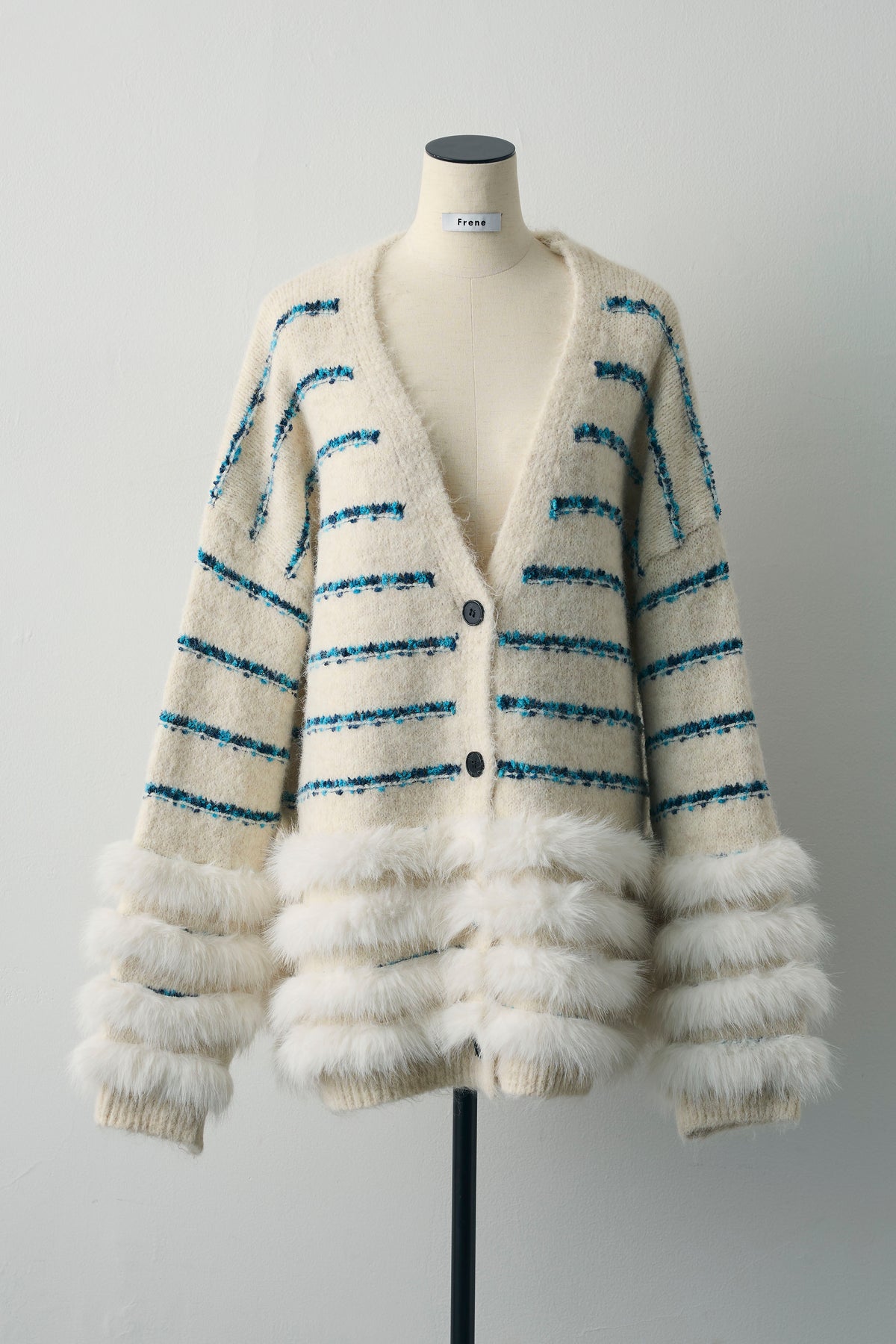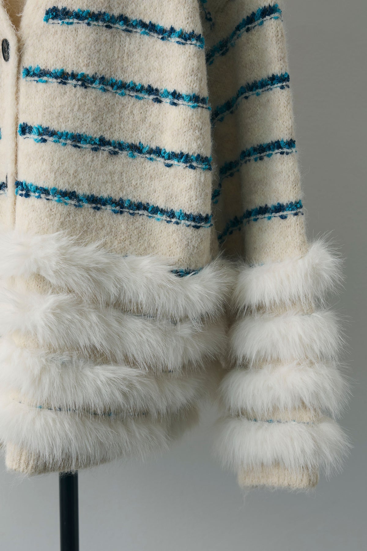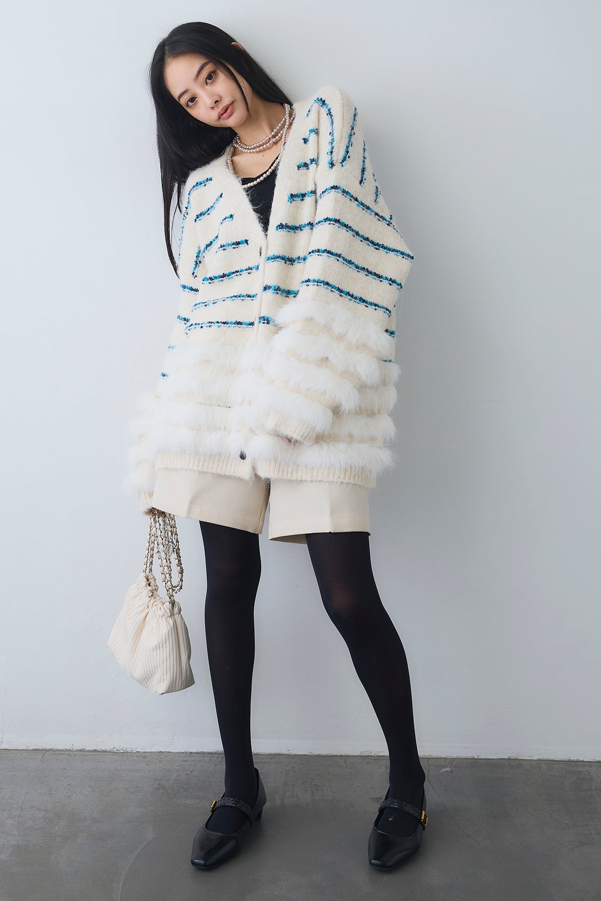 ブルーのラインが映える、ふわふわシャギーの主役カーデ。裾と袖口は段々のフェイクファー切替で、羽織るだけで存在感たっぷり。ヒップを隠す長め丈、Vネック×ボタン開きでインナーを選ばず、ワンピやショートボトムに合わせるだけでコーデが華やぎます。