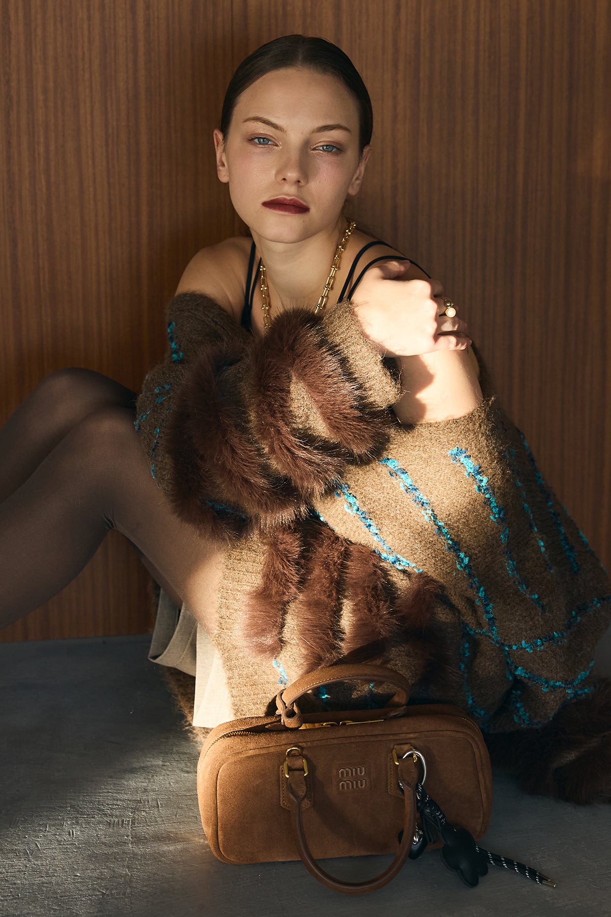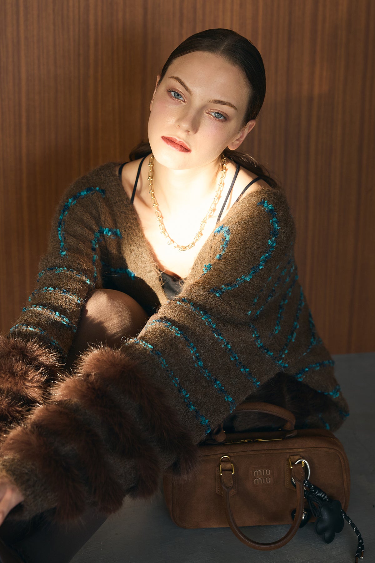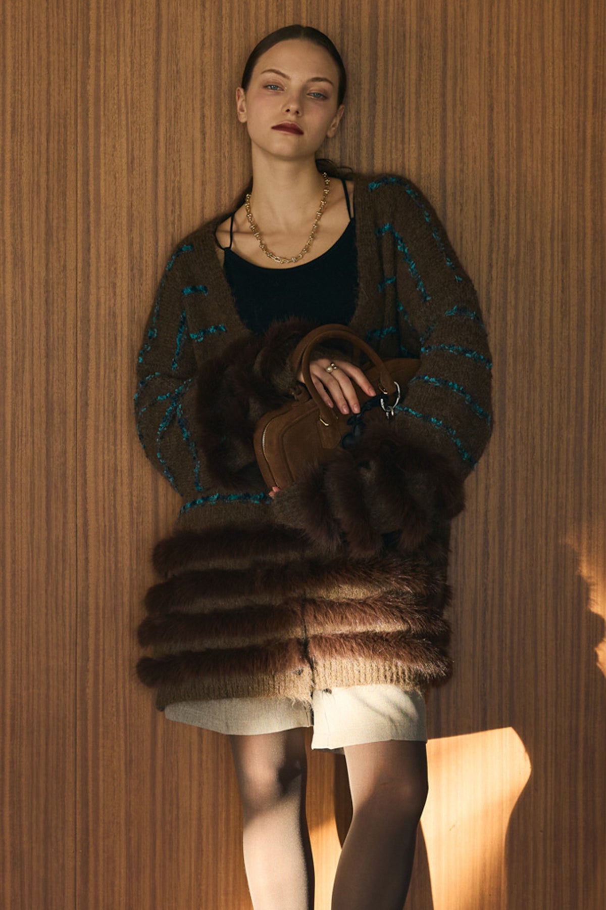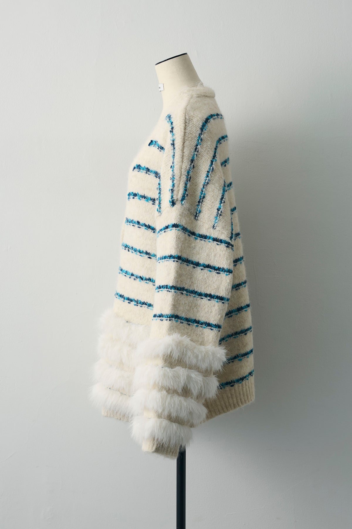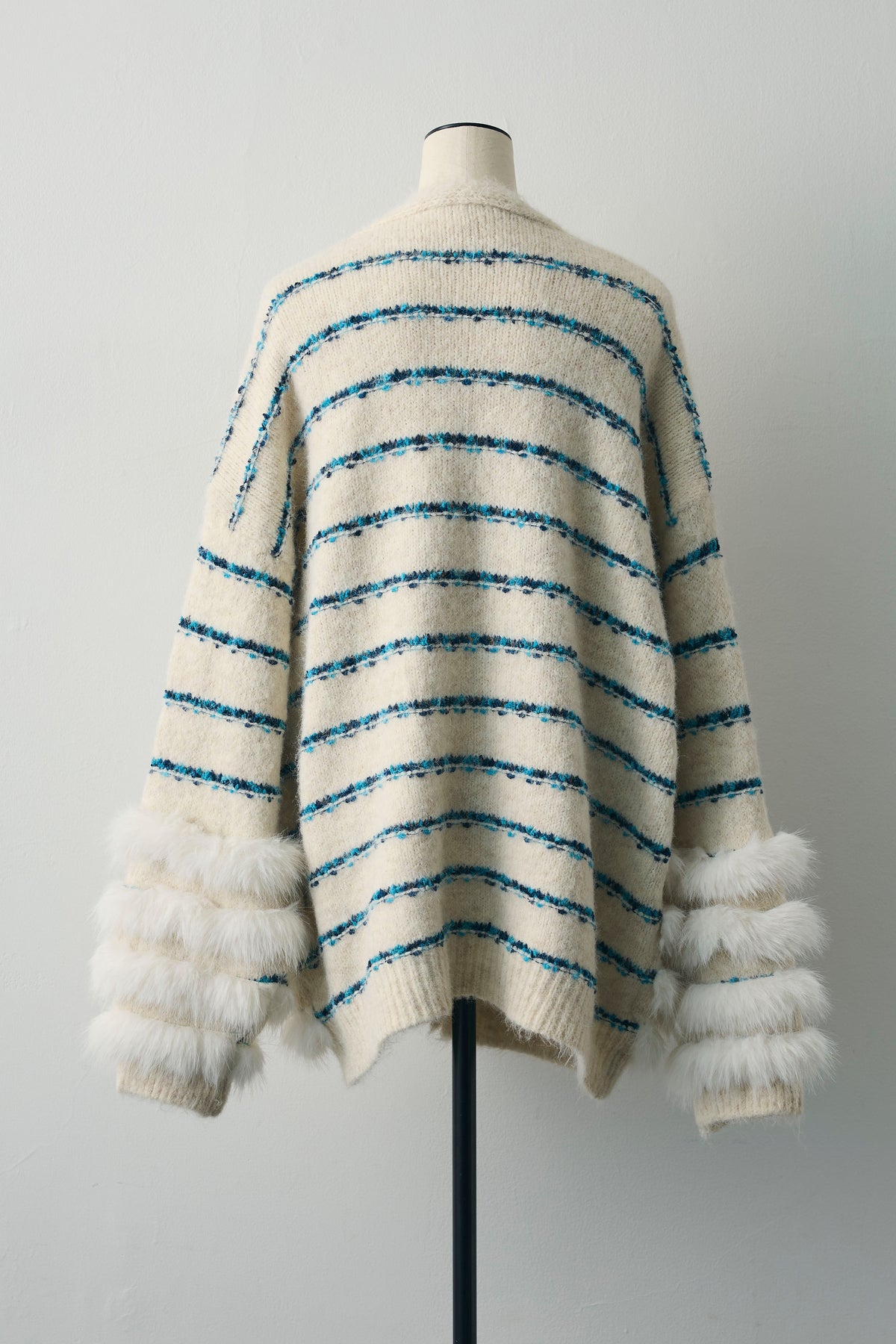 ブルーのラインが映える、ふわふわシャギーの主役カーデ。裾と袖口は段々のフェイクファー切替で、羽織るだけで存在感たっぷり。ヒップを隠す長め丈、Vネック×ボタン開きでインナーを選ばず、ワンピやショートボトムに合わせるだけでコーデが華やぎます。