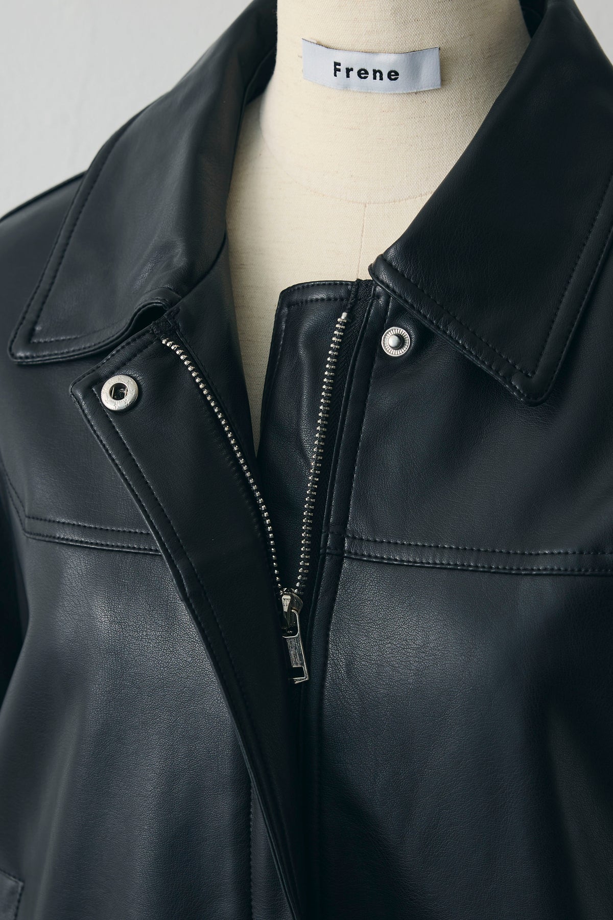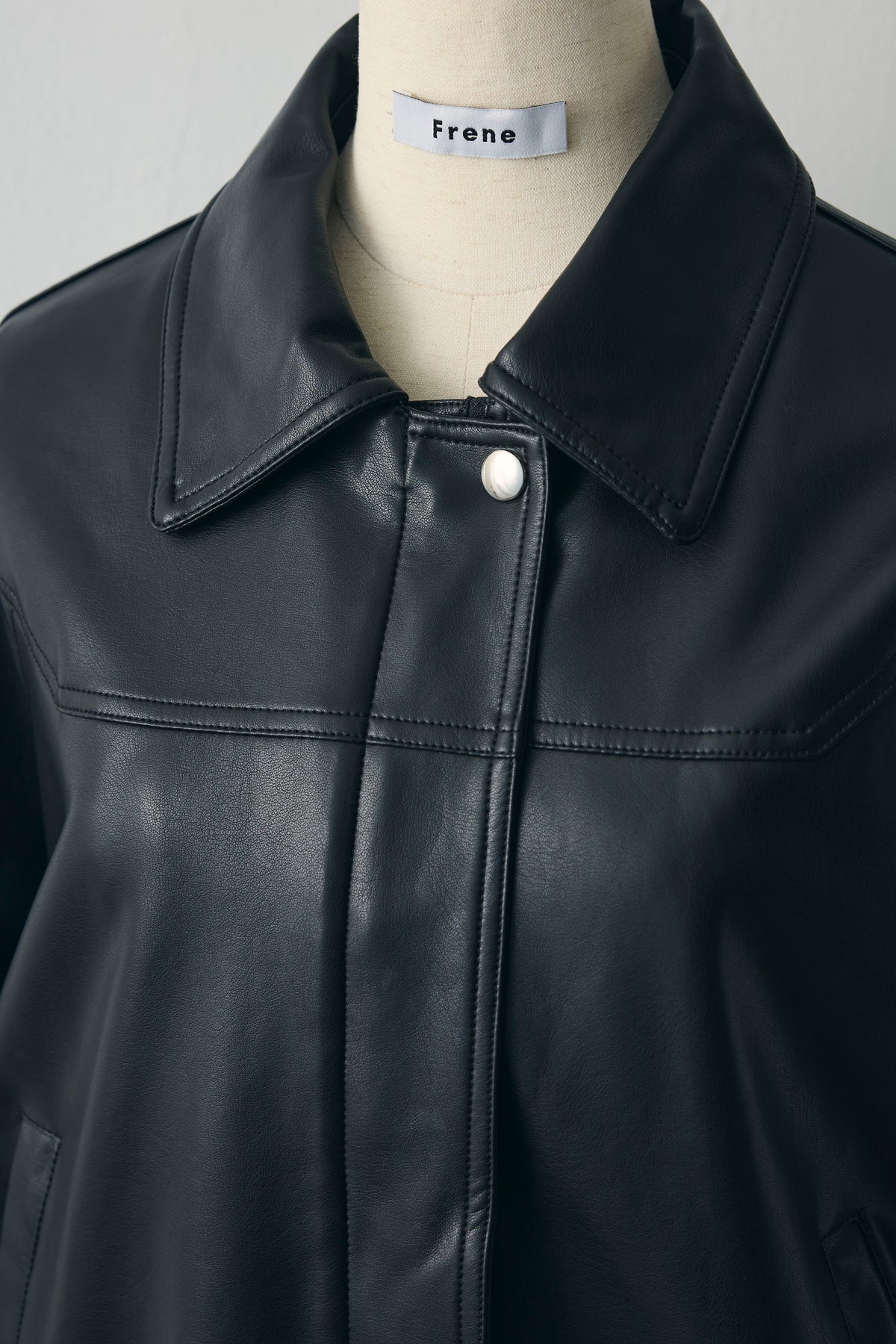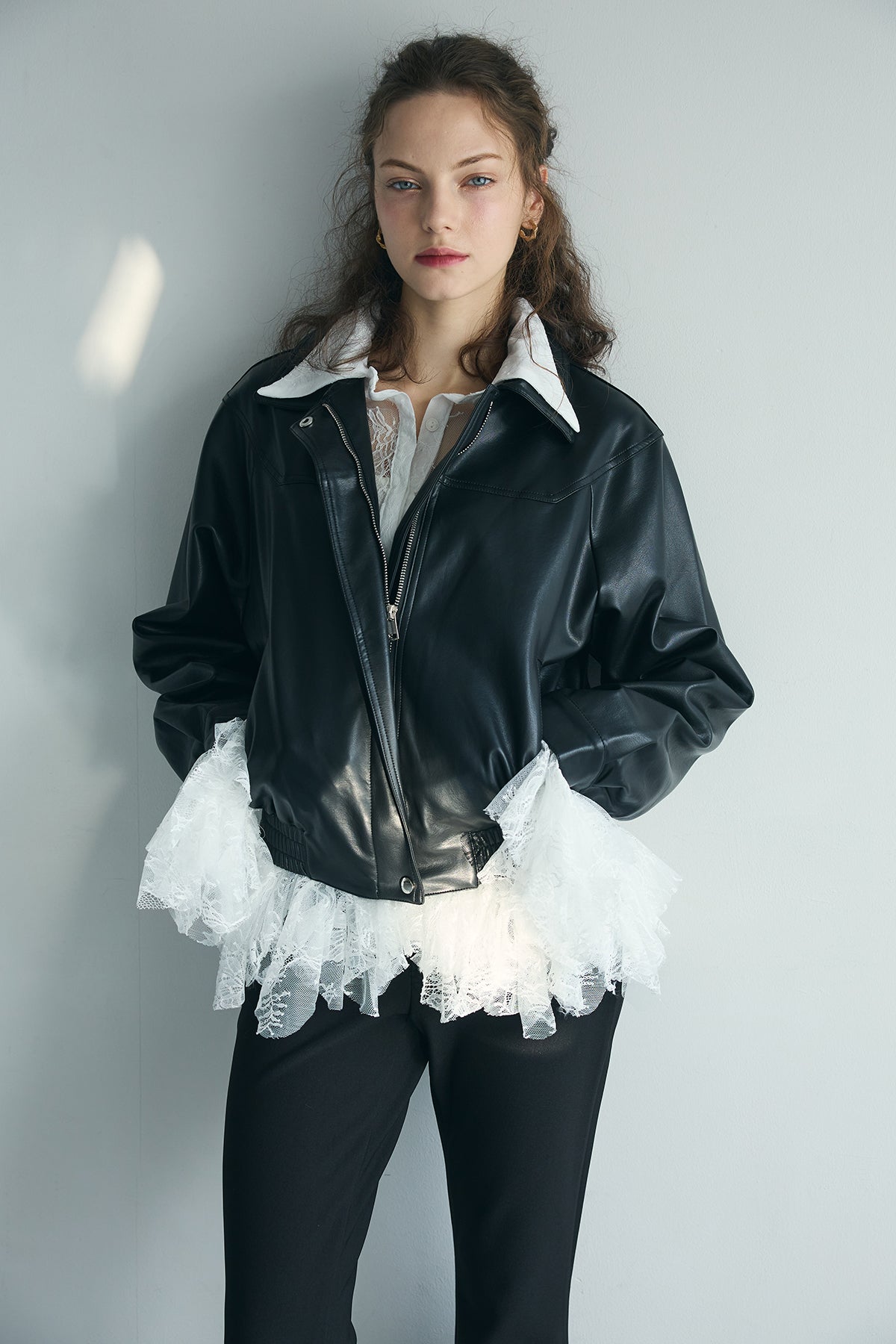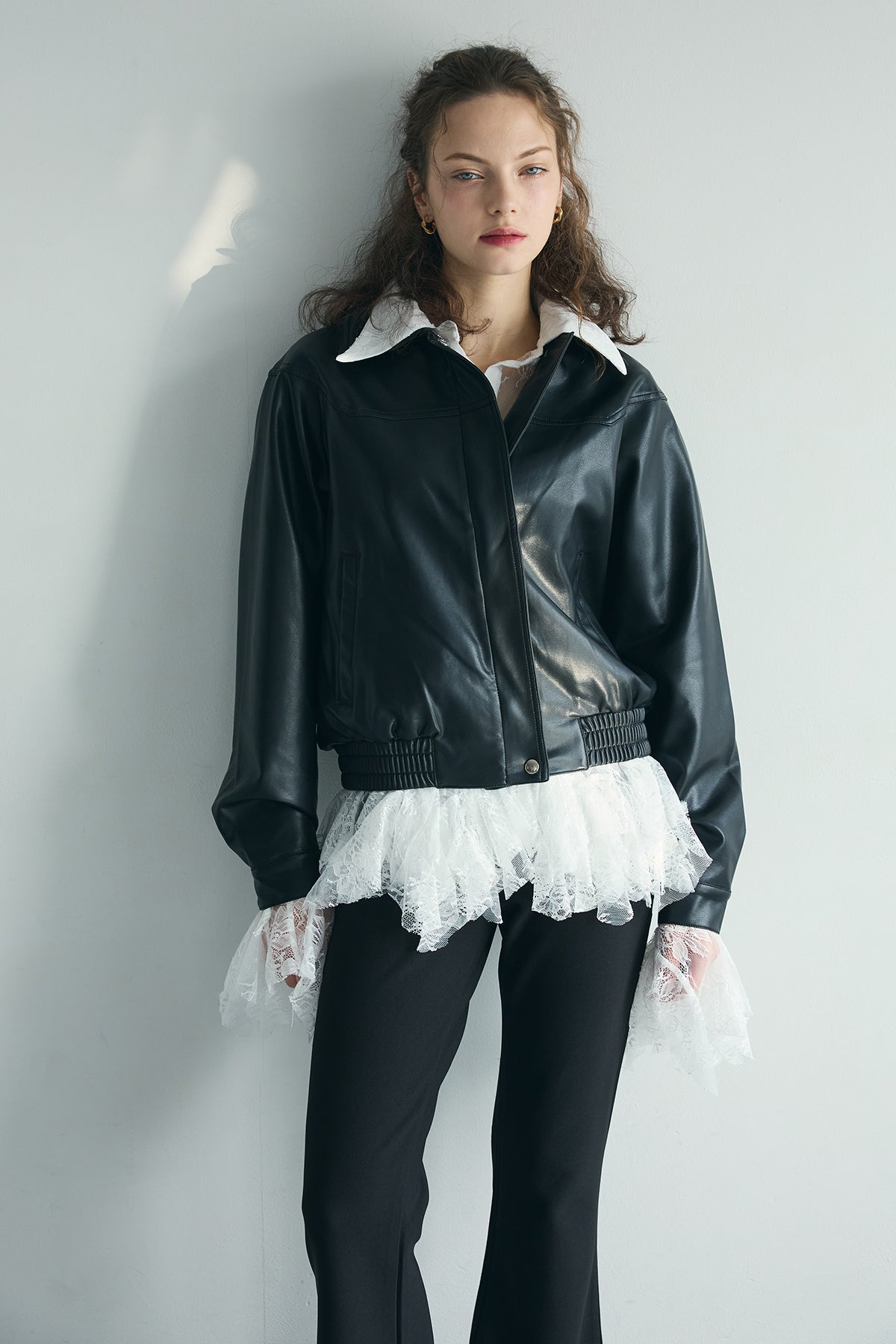 ほのかなツヤのあるレザー見え素材のジップブルゾン。ゆったり肩とふんわり袖、裾のギャザー切り替えで、羽織るだけでこなれた形に。ワンピースやレースに重ねて質感ミックスを楽しんでも、デニムやスラックスでクールにまとめることも。季節の変わり目に使いやすい一枚です。