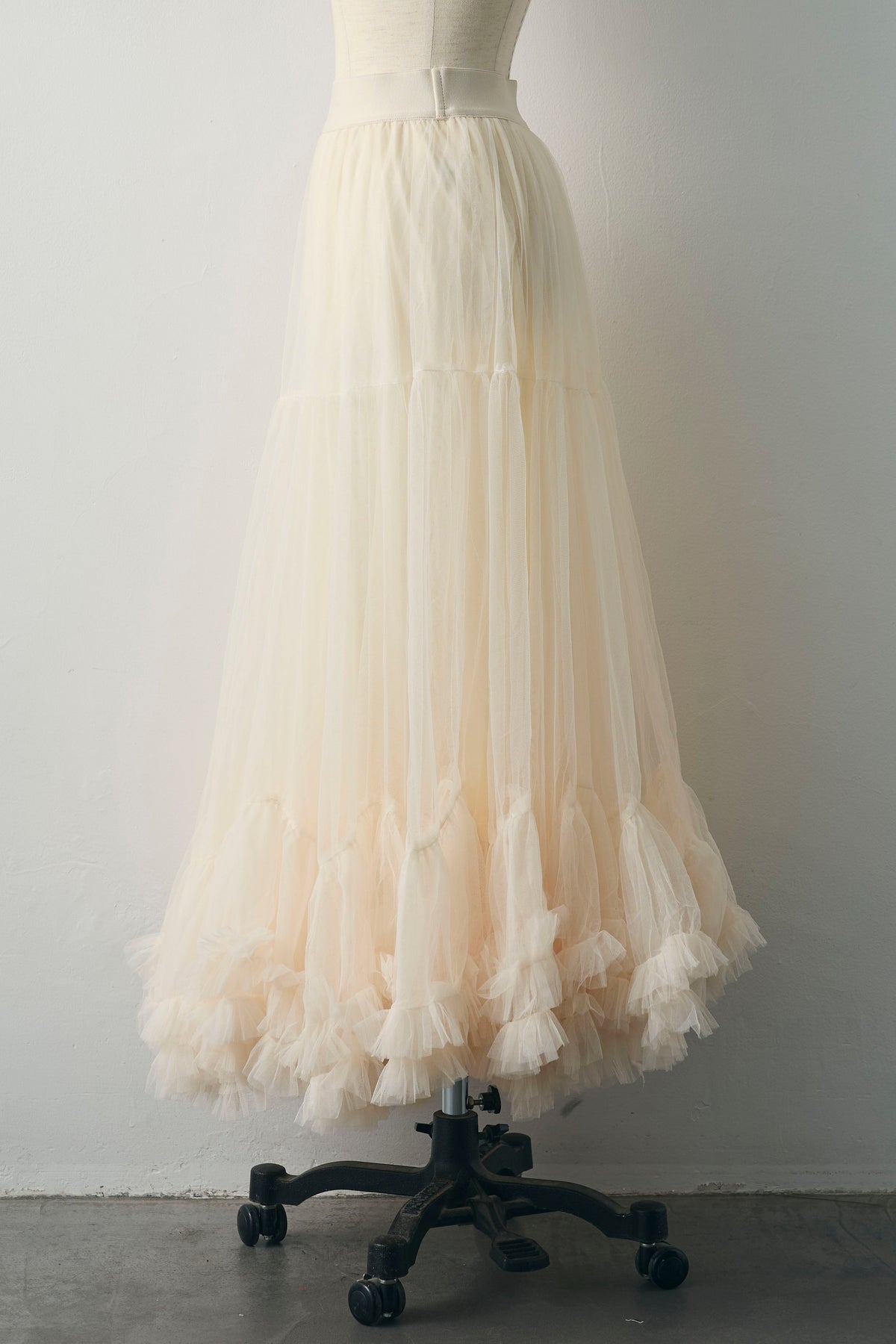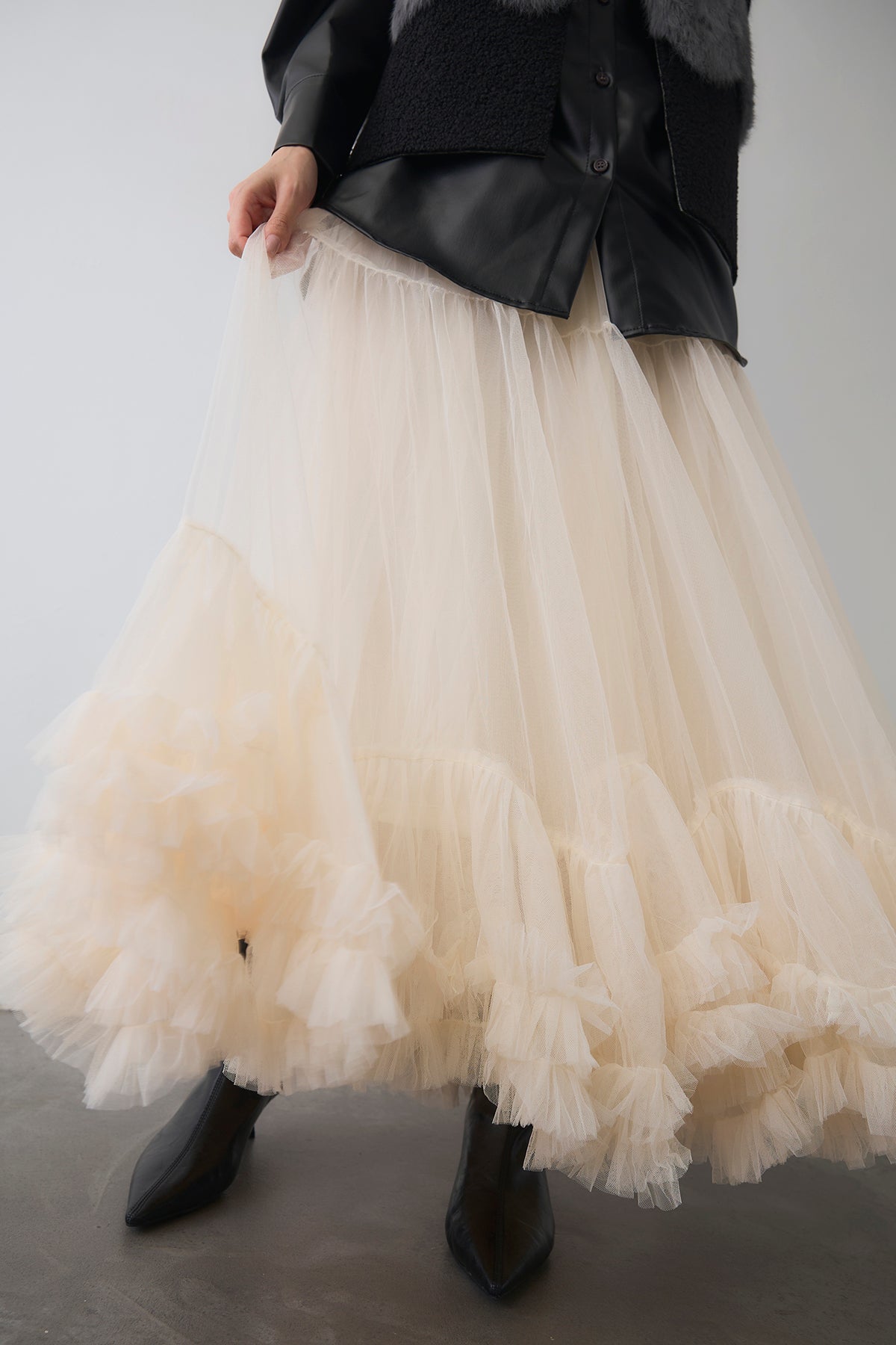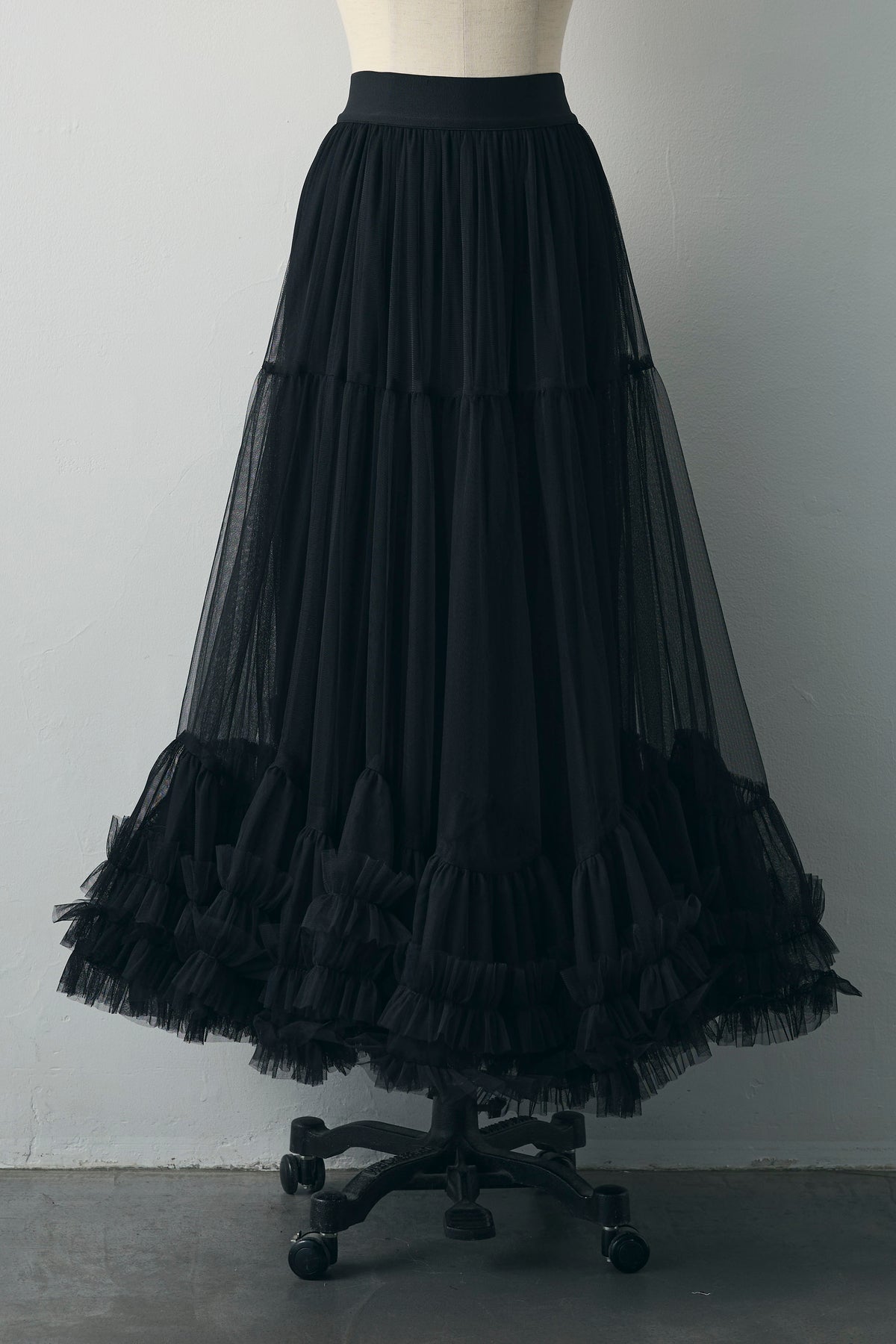 やわらかいチュールをたっぷり重ねたロングスカート。裾のふんわりフリルが歩くたびに揺れて、コーデを一気に華やかにします。ウエストは総ゴムでラクなはき心地。ニットやシャツ、スウェットに合わせるだけで主役級。お出かけにも普段にも。