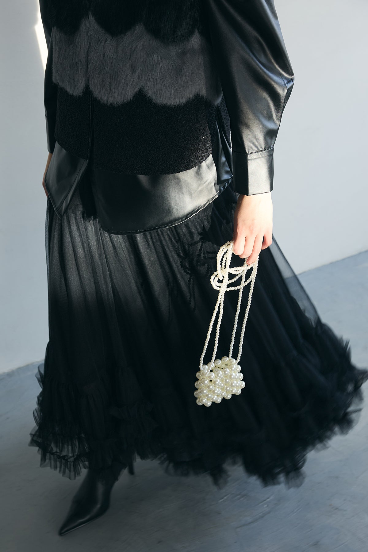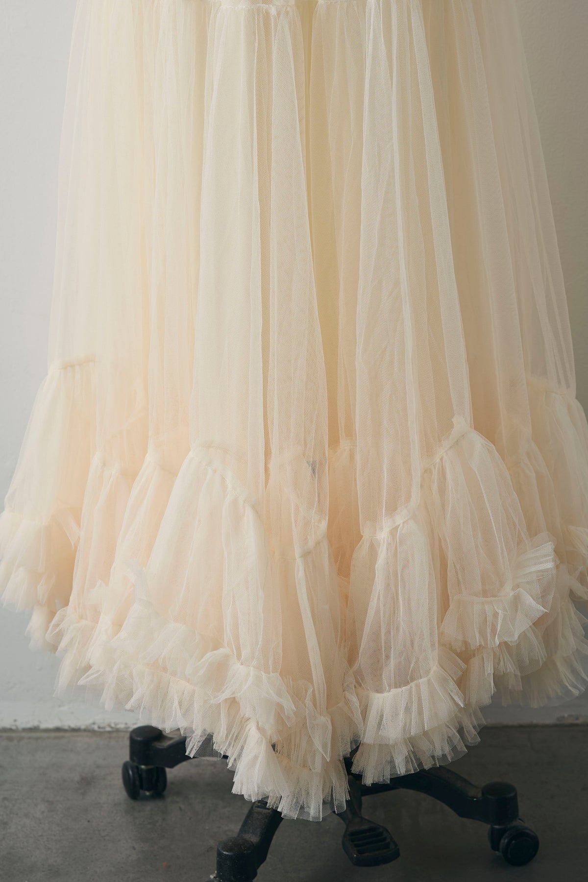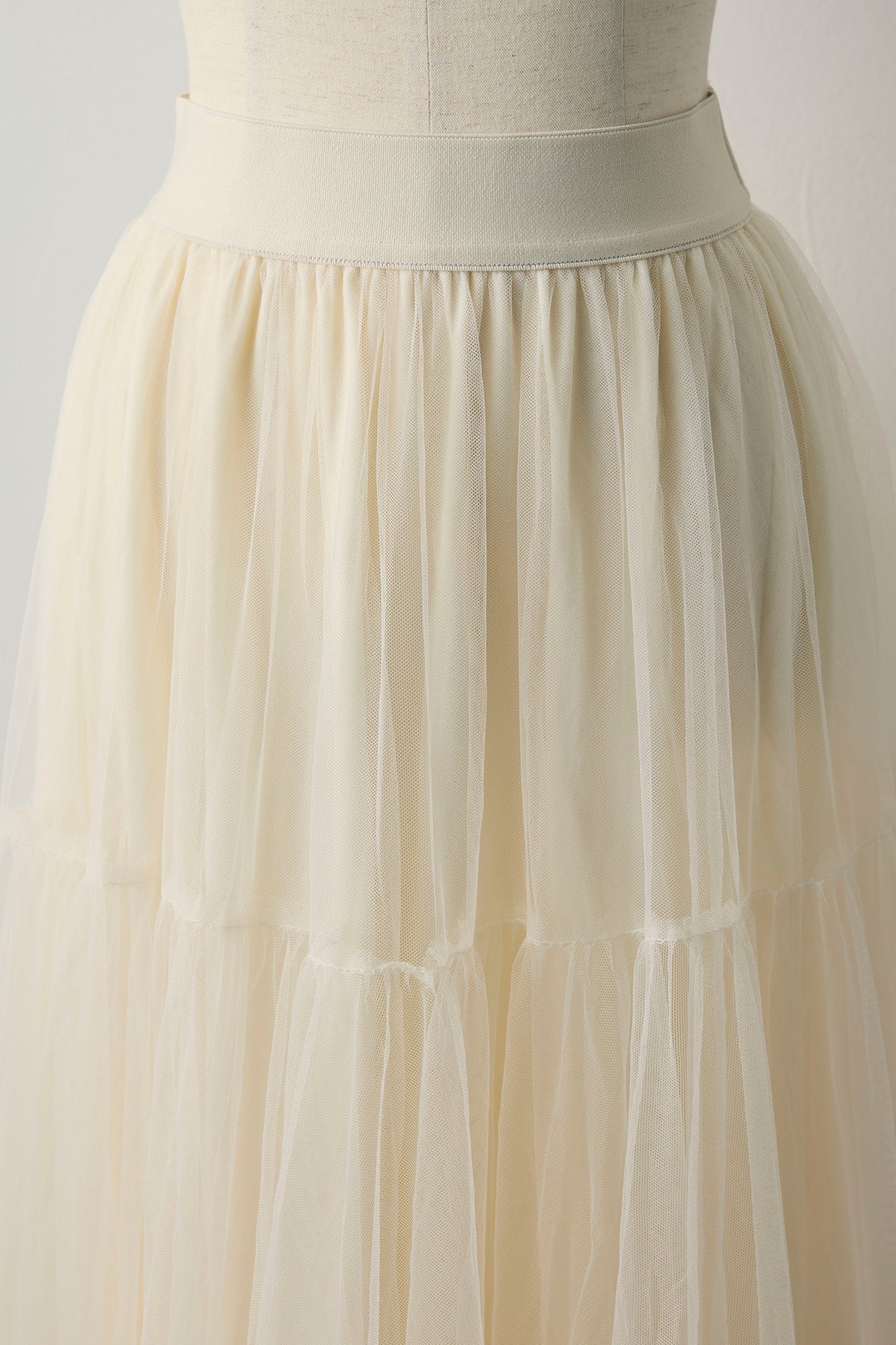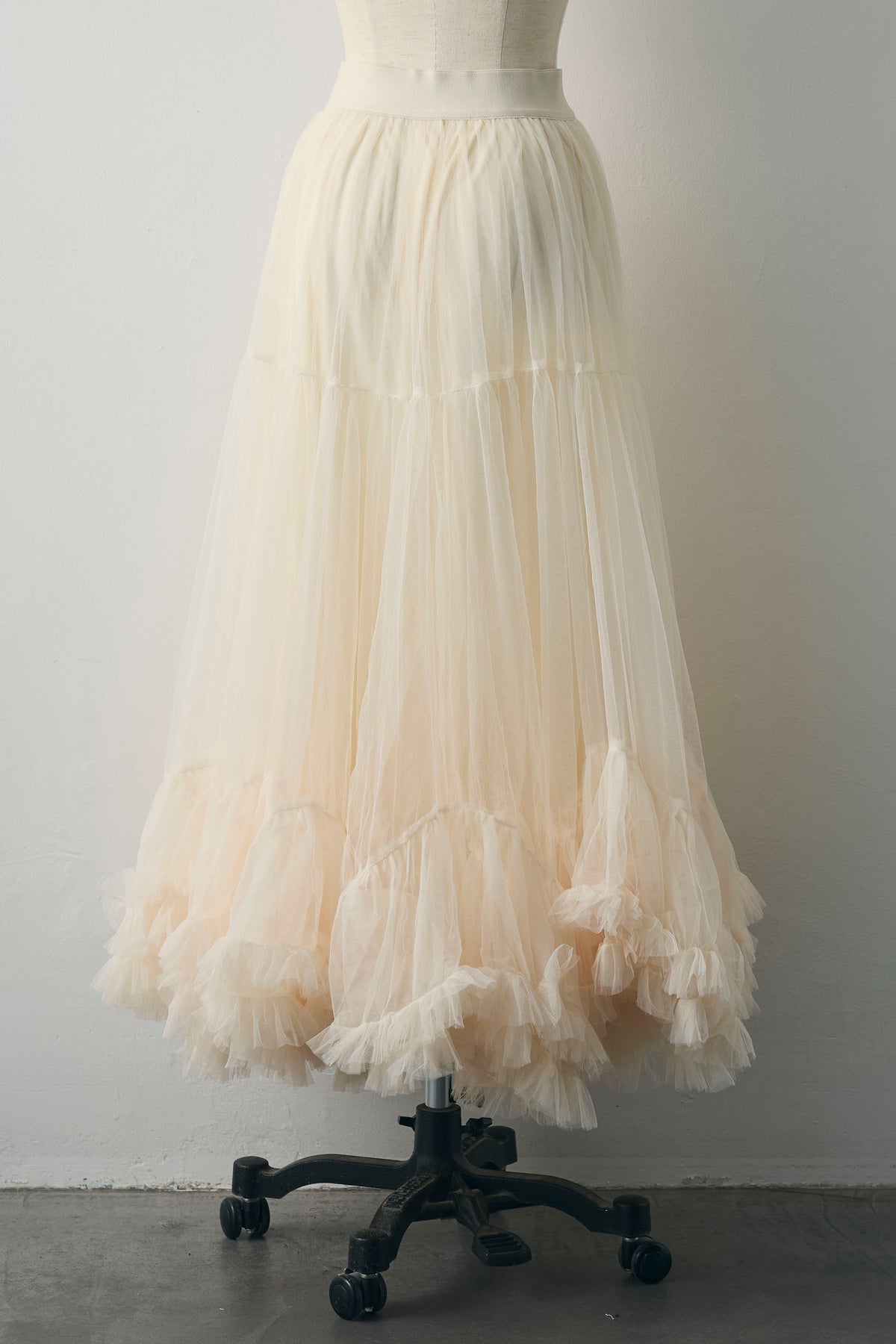 やわらかいチュールをたっぷり重ねたロングスカート。裾のふんわりフリルが歩くたびに揺れて、コーデを一気に華やかにします。ウエストは総ゴムでラクなはき心地。ニットやシャツ、スウェットに合わせるだけで主役級。お出かけにも普段にも。