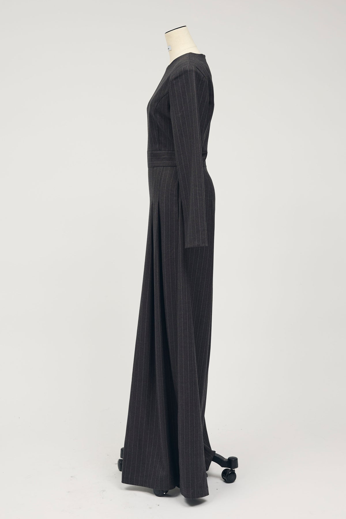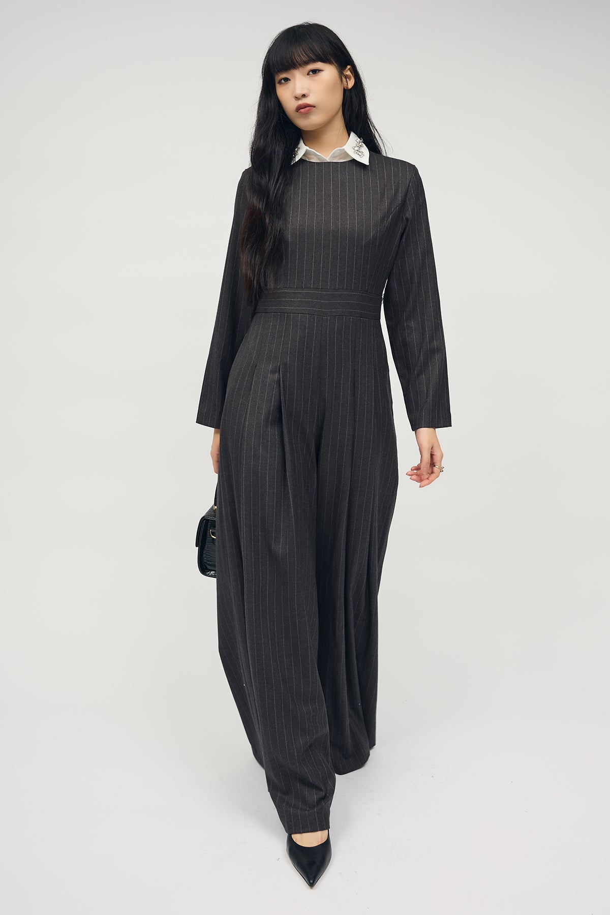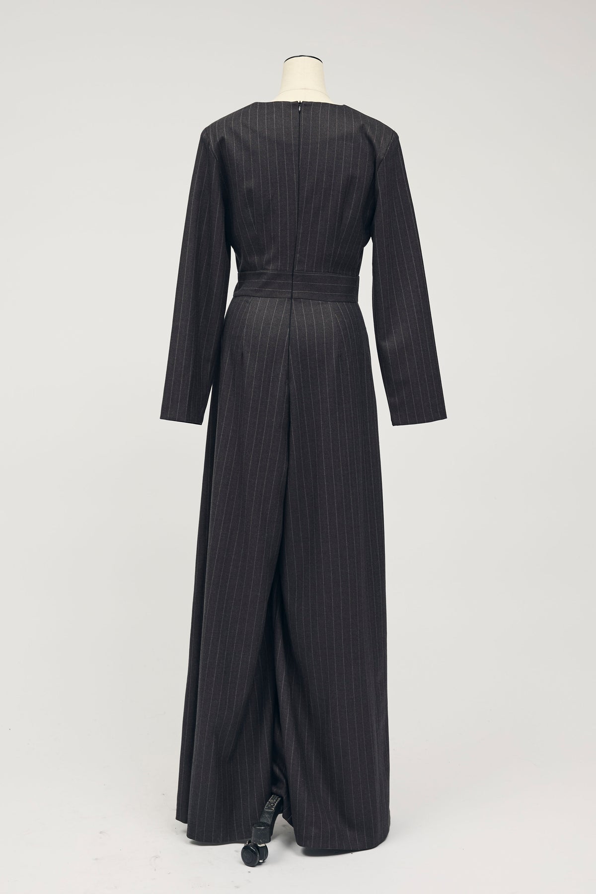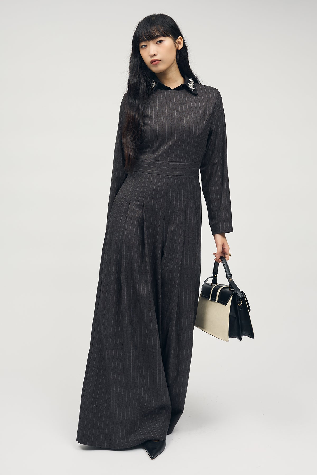 細いストライプが縦のラインを強調し、すっきりと見せてくれるロンパース。ウエスト位置を高めに設定し、脚長効果のあるバランスに仕上げています。ゆとりのあるワイドシルエットながら、上品な印象をキープ。アクセサリーや付け襟を合わせれば、フォーマルからデイリーまで幅広く着まわせる一着です。