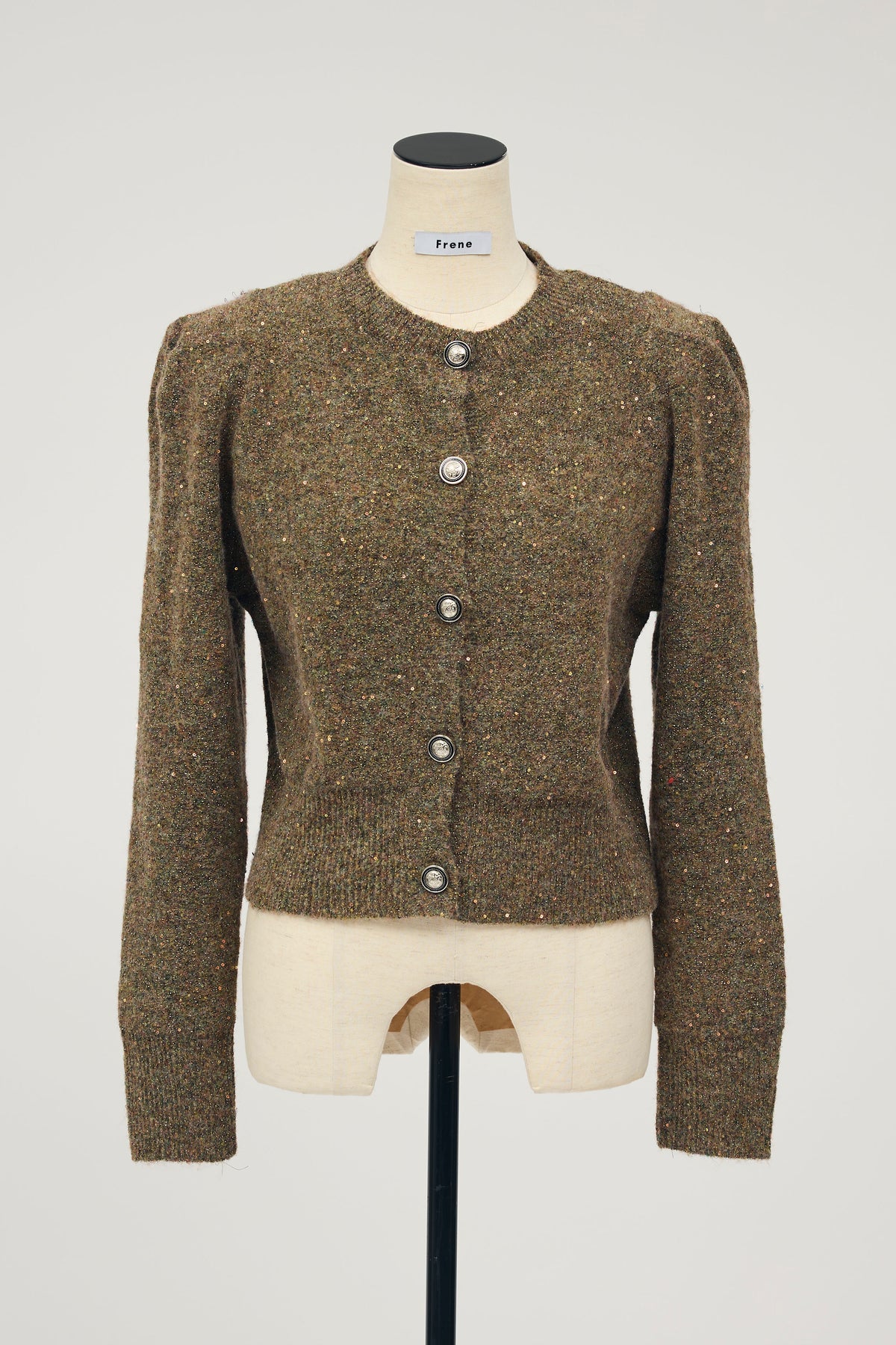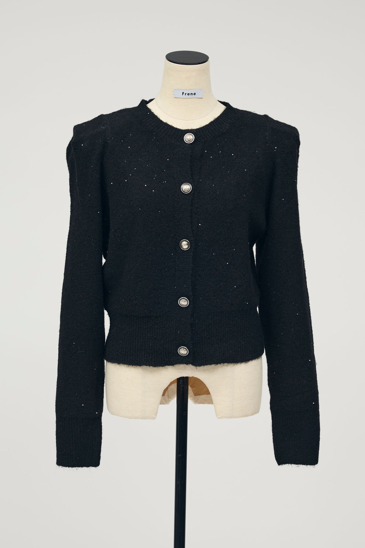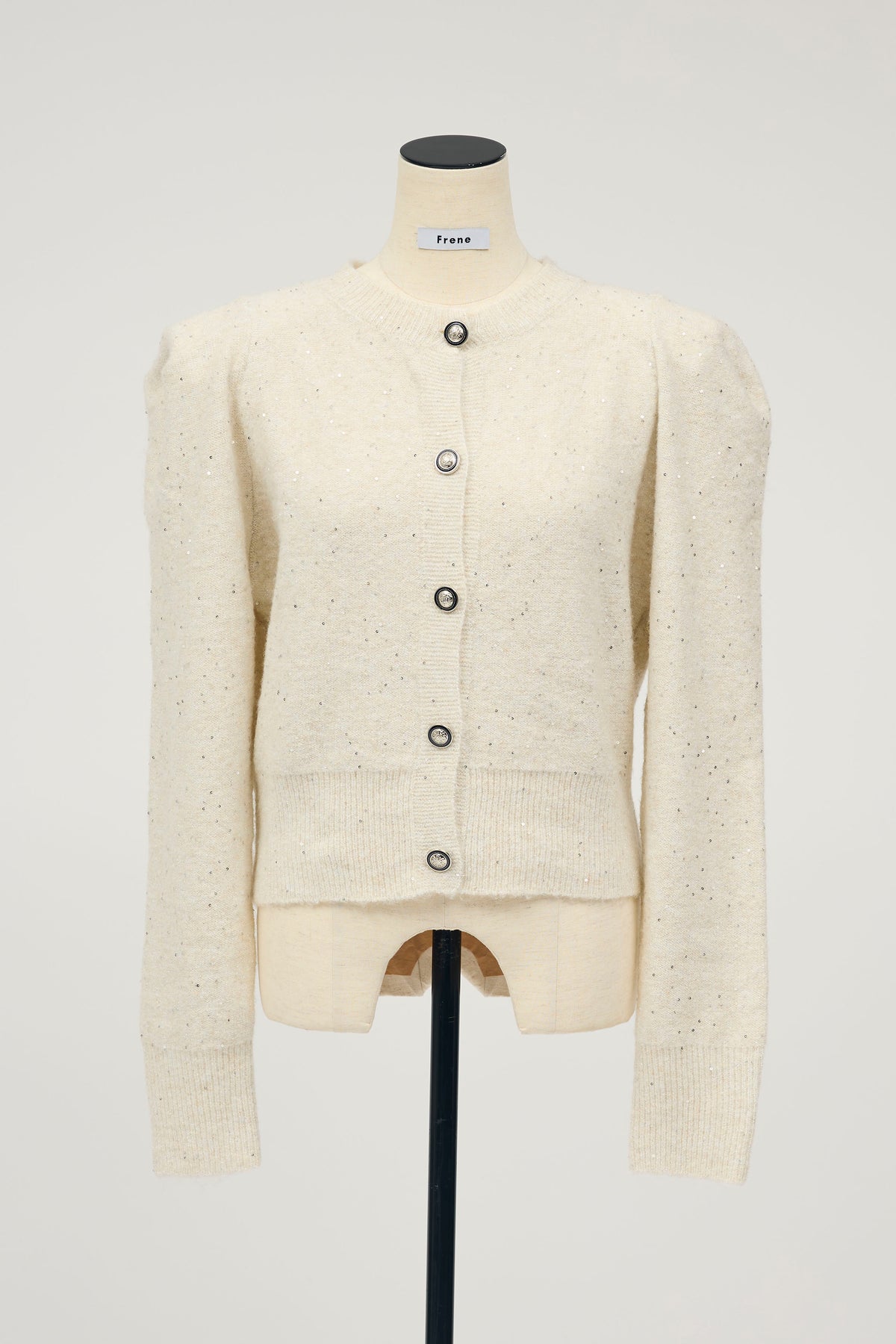 肩にさりげないボリュームを持たせたパワーショルダーデザインが印象的なウール混カーディガン。ラメ糸が織り込まれたシャイニーな風合いが、シンプルながらも華やかさをプラスします。コンパクトな丈感でスタイルアップ効果があり、ボタンを留めてトップスとしても、羽織りとしても活躍。フェミニンなスカートからマニッシュなパンツまで、幅広くマッチするアイテムです。