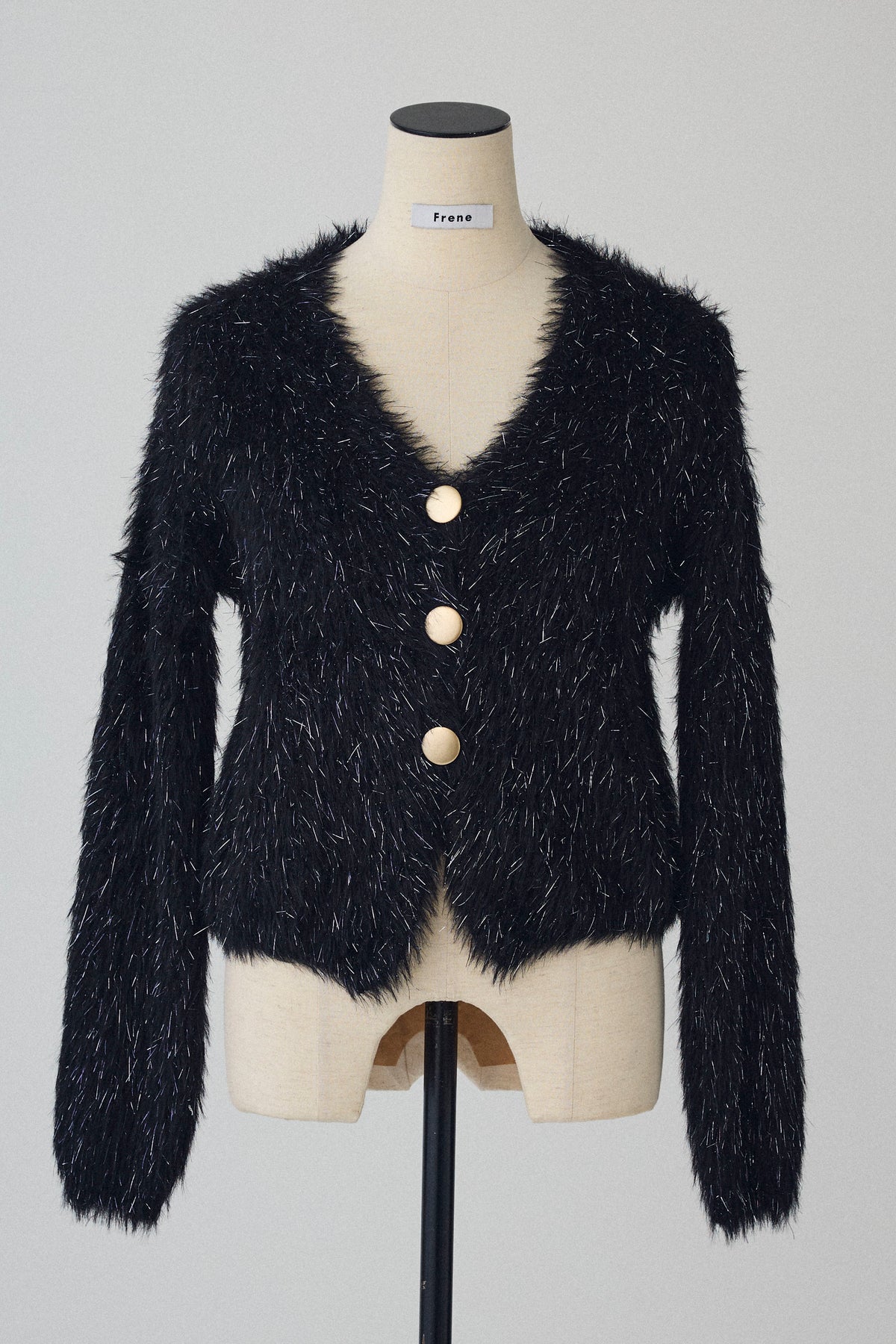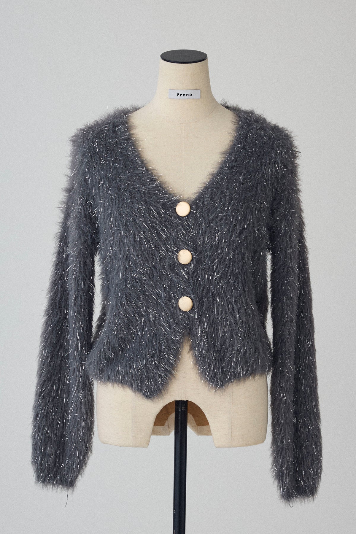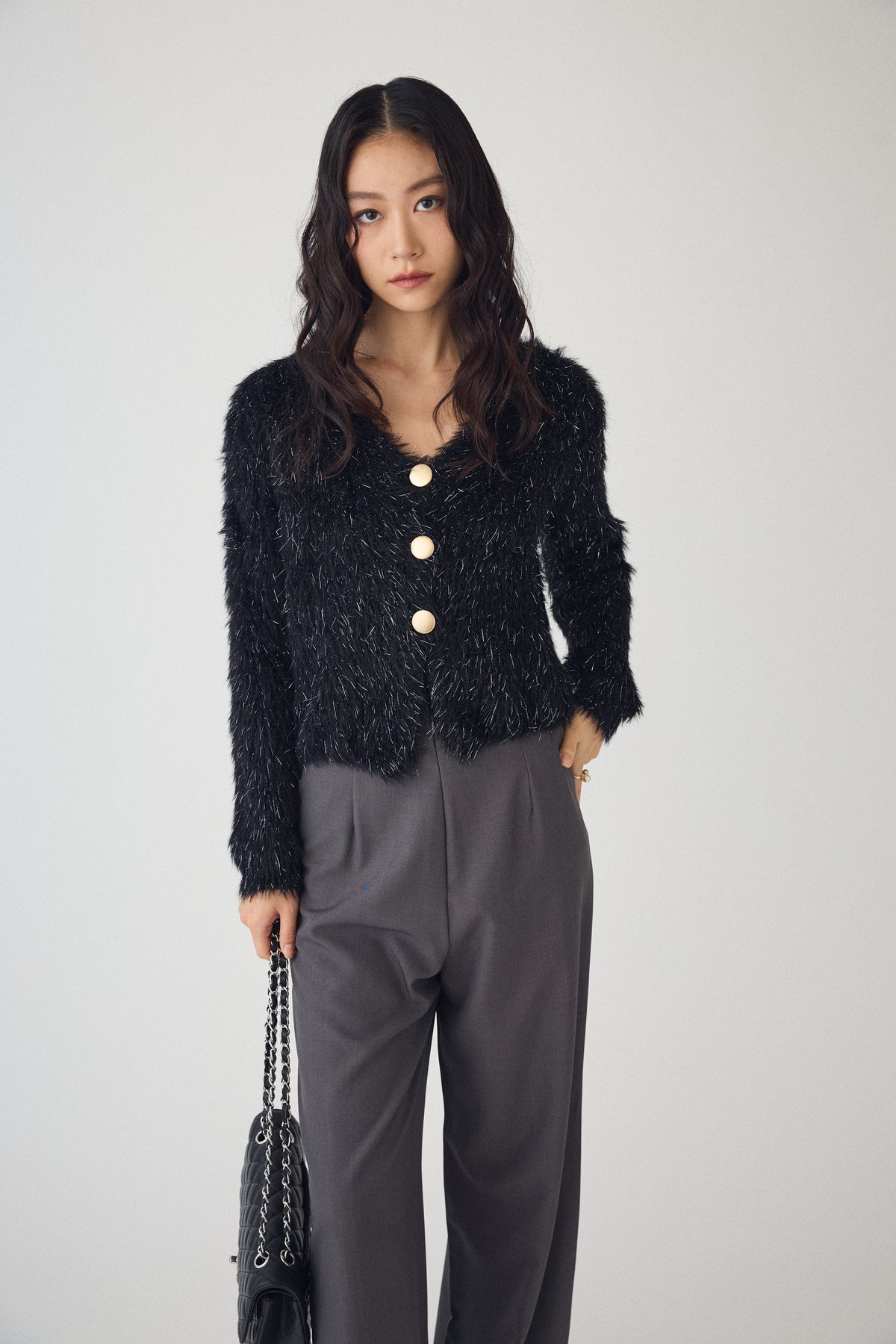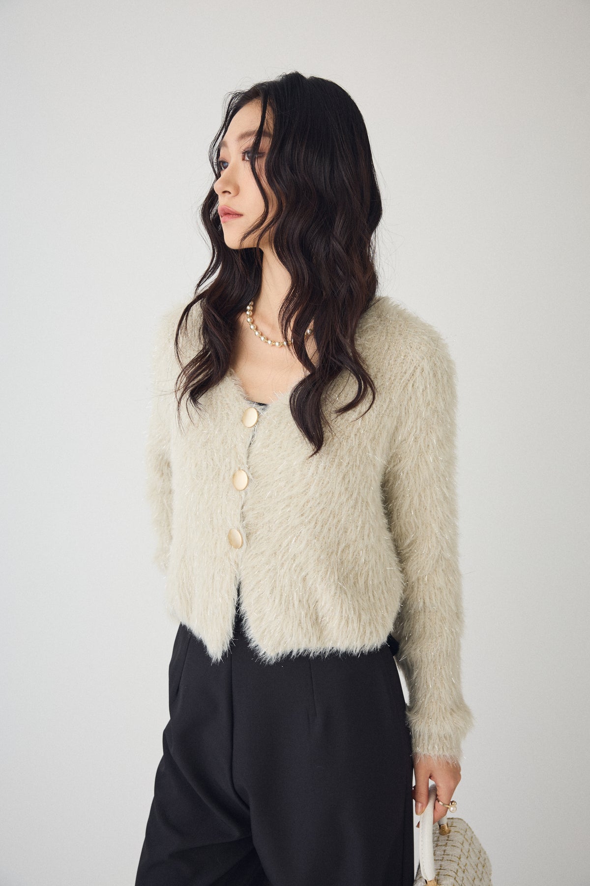 ラメを織り込んだシャギー素材が華やかな印象のニットカーディガン。立体感のある毛足が動くたびにきらめき、コーディネートを引き立てます。フロントにはゴールドのボタンをあしらい、上品さをプラス。深めのVネックラインが顔まわりをすっきり見せ、コンパクトな丈感でボトムスを選ばずバランスよく着こなせます。羽織りとしてもトップスとしても使える、着回し力の高いアイテムです。