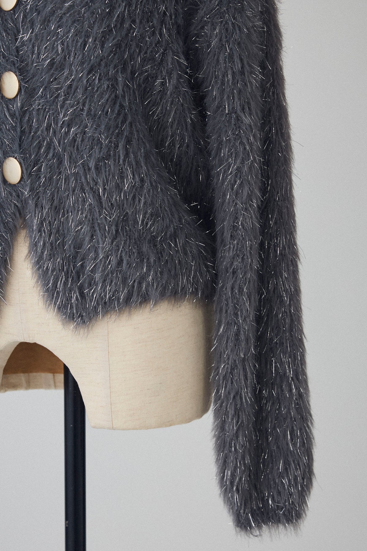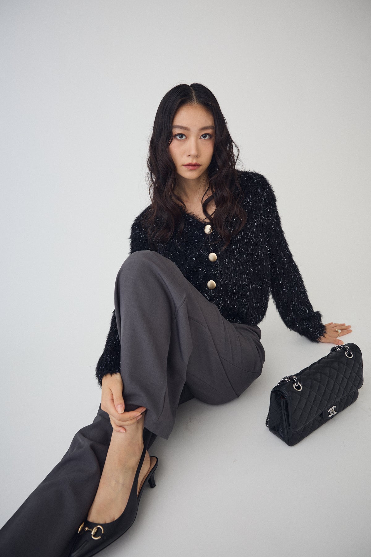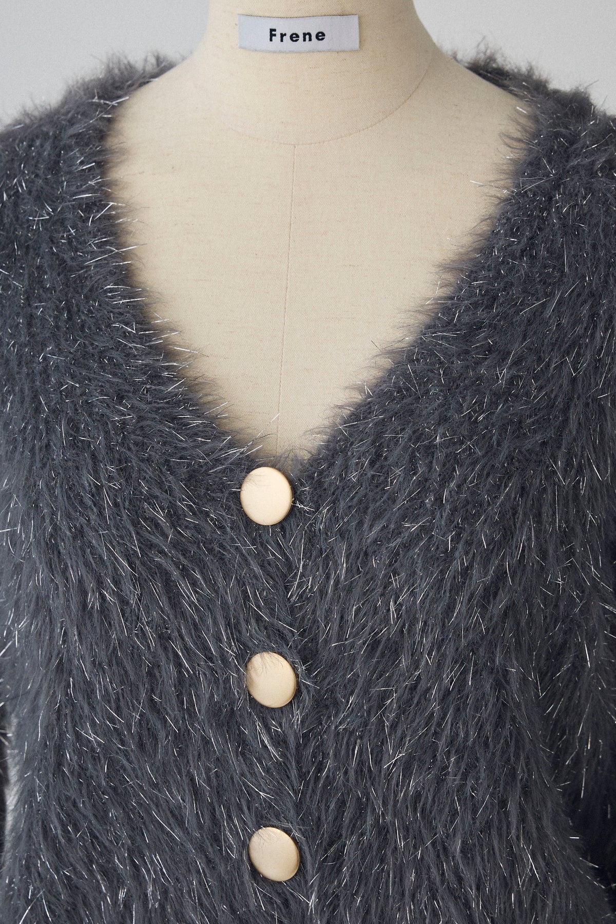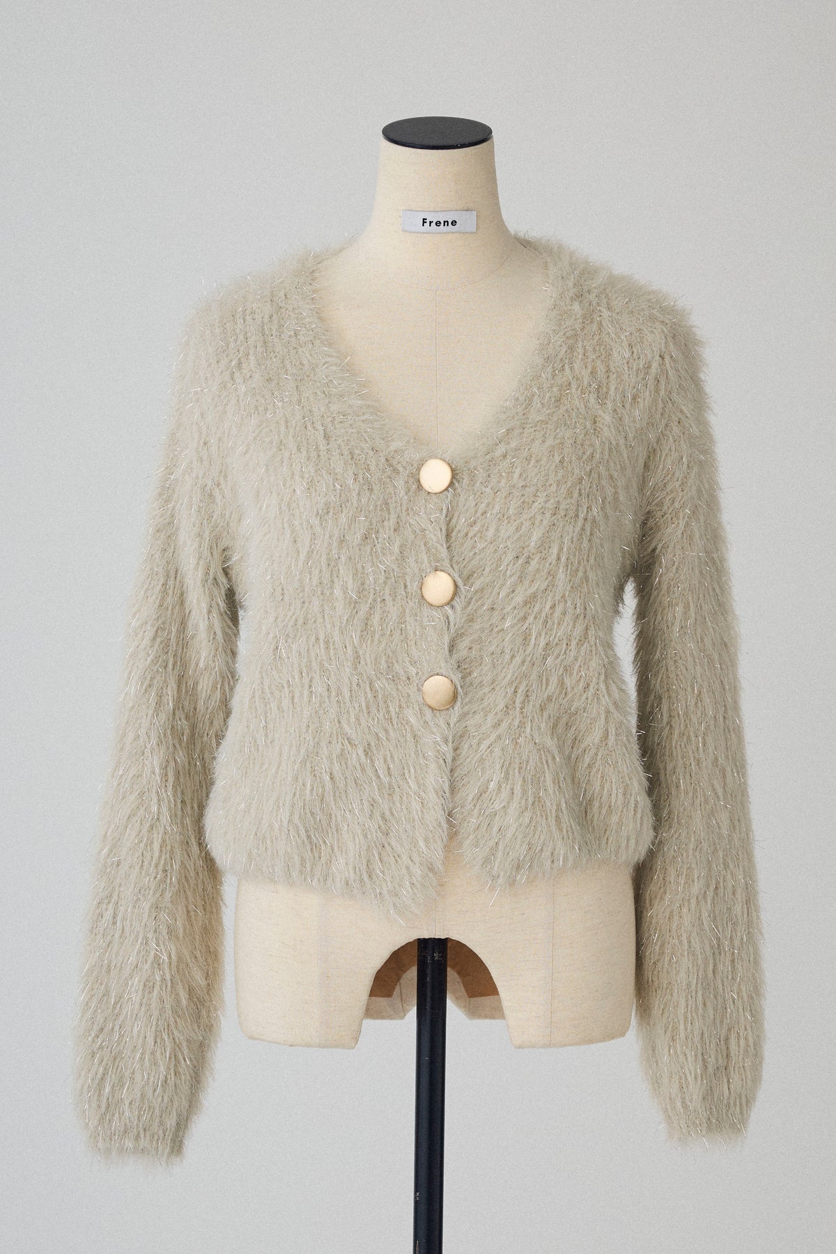ラメを織り込んだシャギー素材が華やかな印象のニットカーディガン。立体感のある毛足が動くたびにきらめき、コーディネートを引き立てます。フロントにはゴールドのボタンをあしらい、上品さをプラス。深めのVネックラインが顔まわりをすっきり見せ、コンパクトな丈感でボトムスを選ばずバランスよく着こなせます。羽織りとしてもトップスとしても使える、着回し力の高いアイテムです。