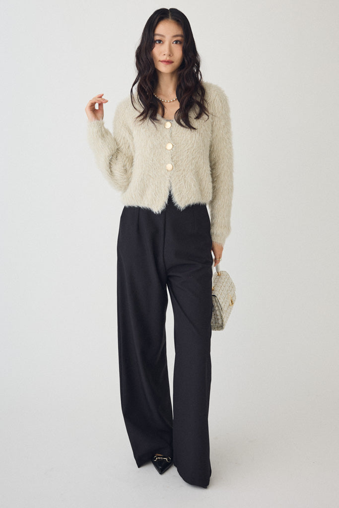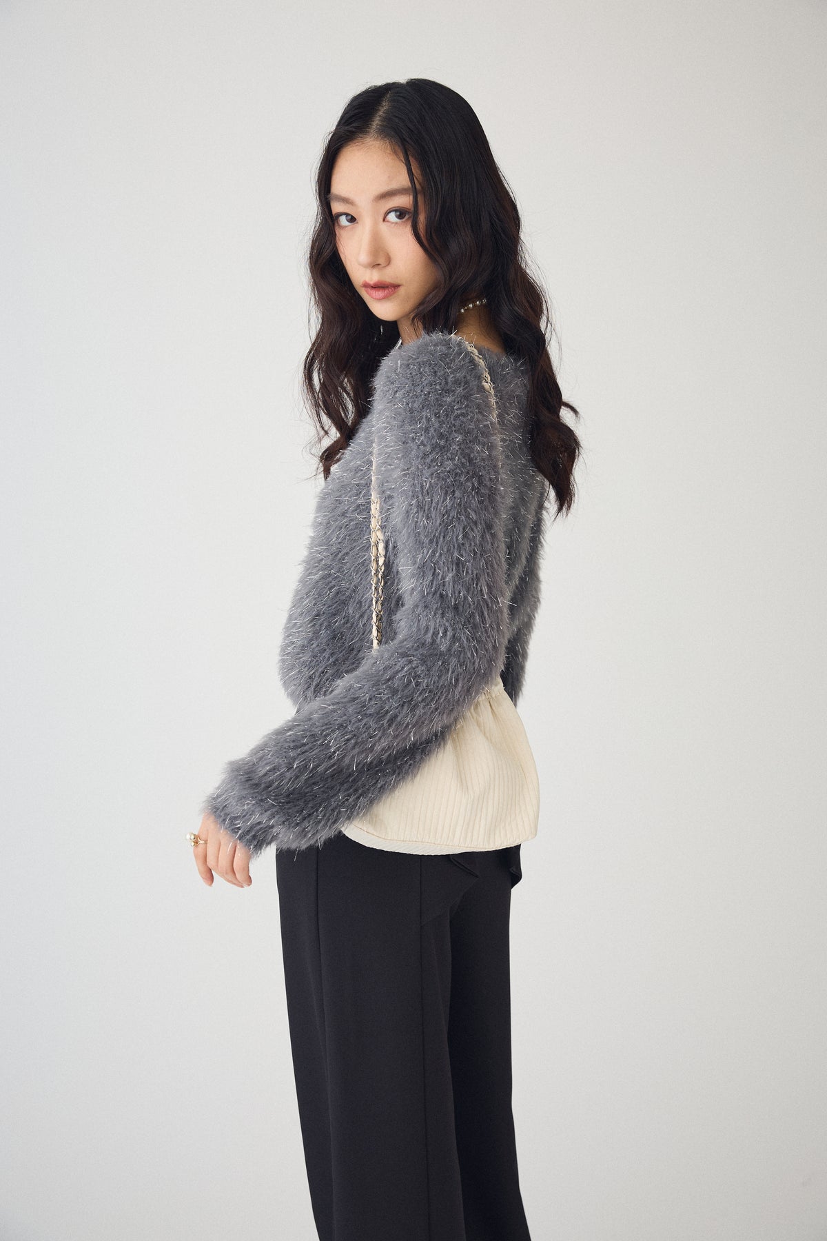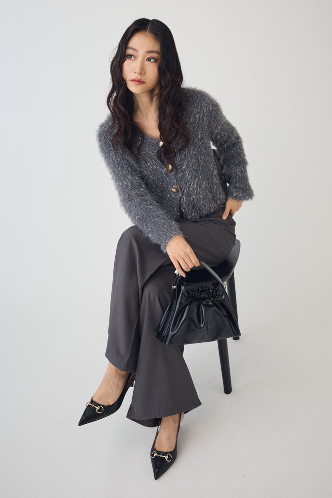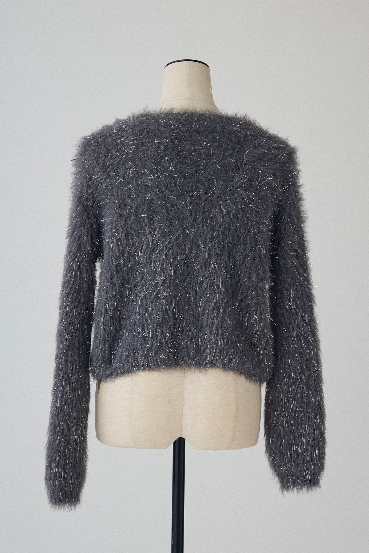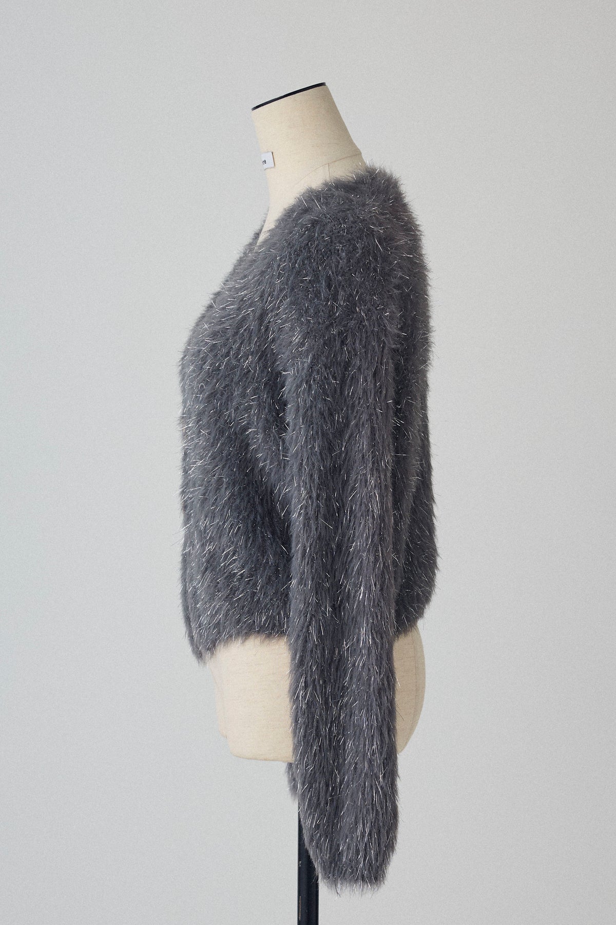 ラメを織り込んだシャギー素材が華やかな印象のニットカーディガン。立体感のある毛足が動くたびにきらめき、コーディネートを引き立てます。フロントにはゴールドのボタンをあしらい、上品さをプラス。深めのVネックラインが顔まわりをすっきり見せ、コンパクトな丈感でボトムスを選ばずバランスよく着こなせます。羽織りとしてもトップスとしても使える、着回し力の高いアイテムです。