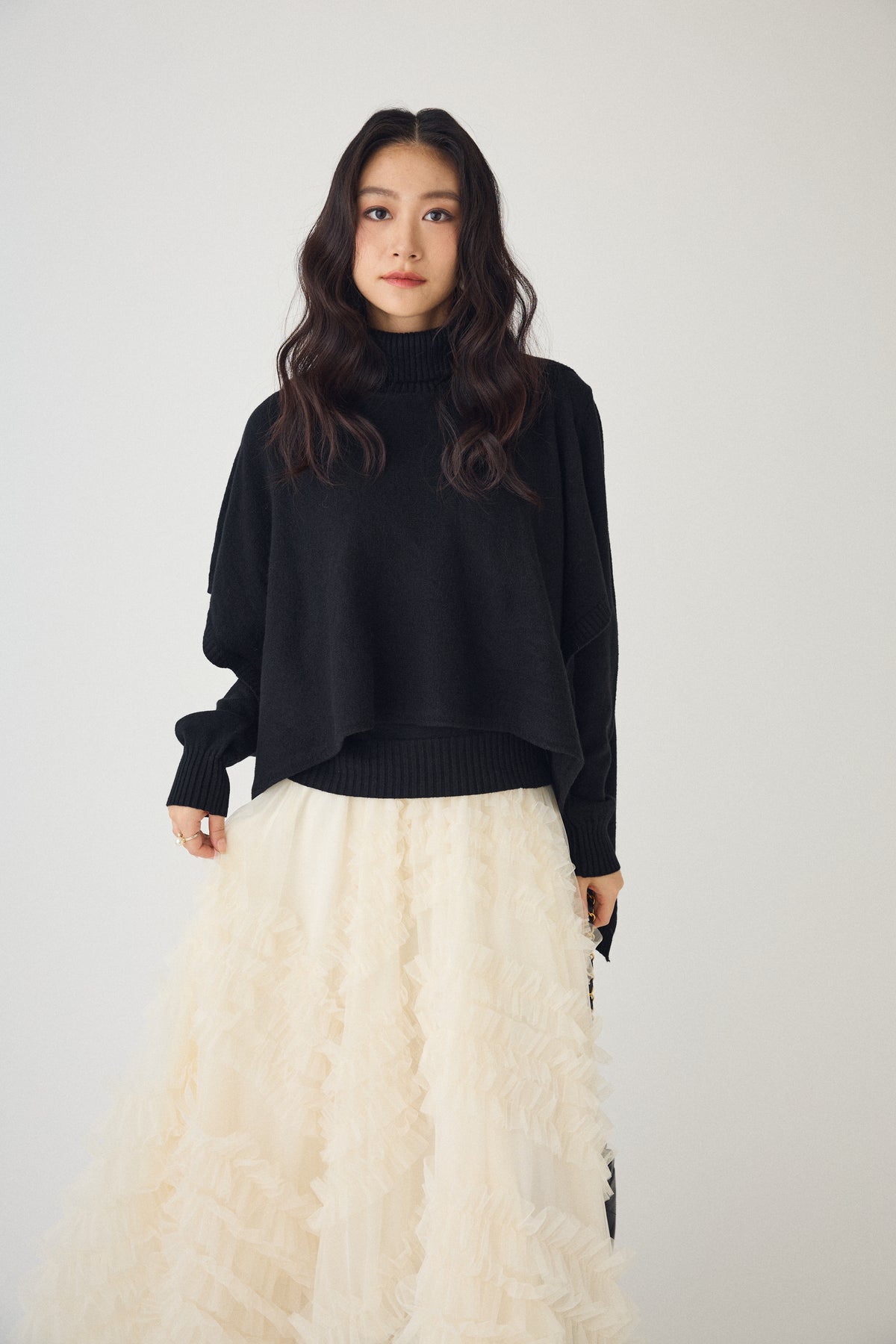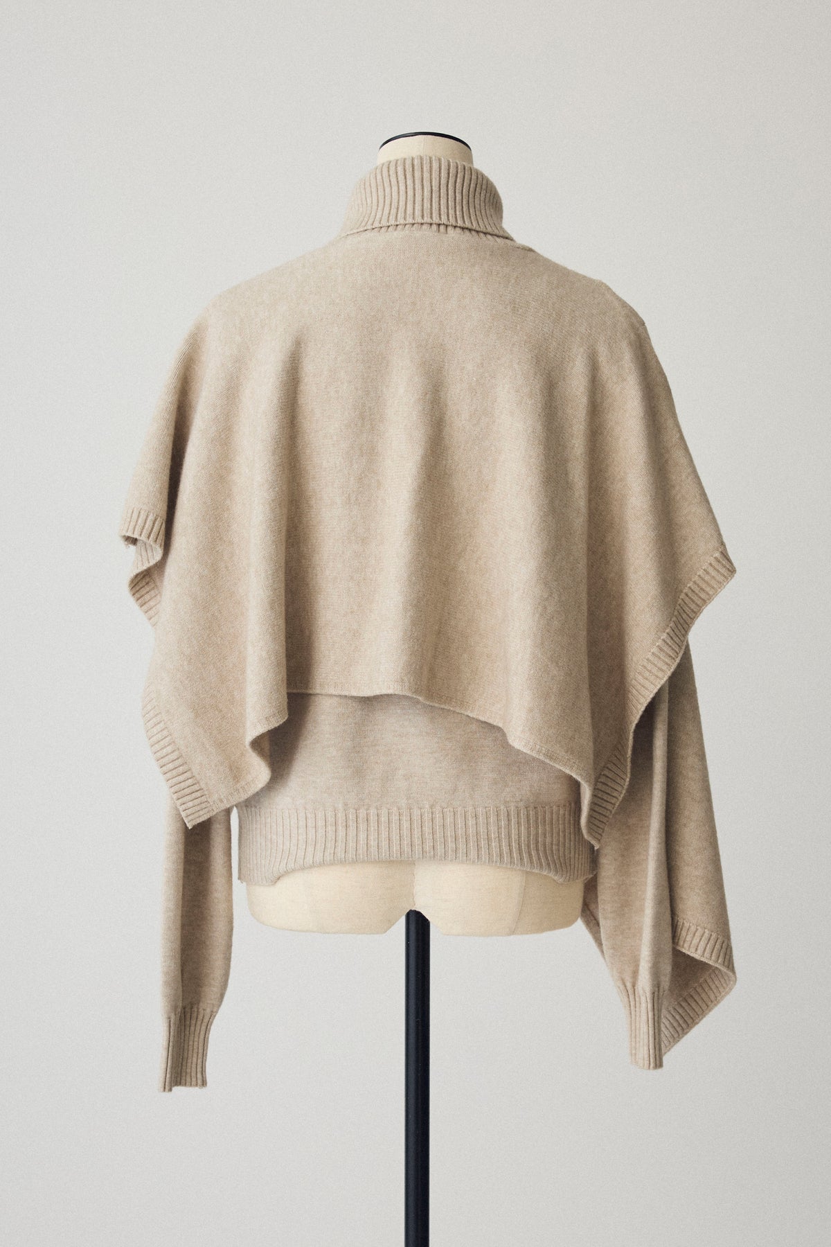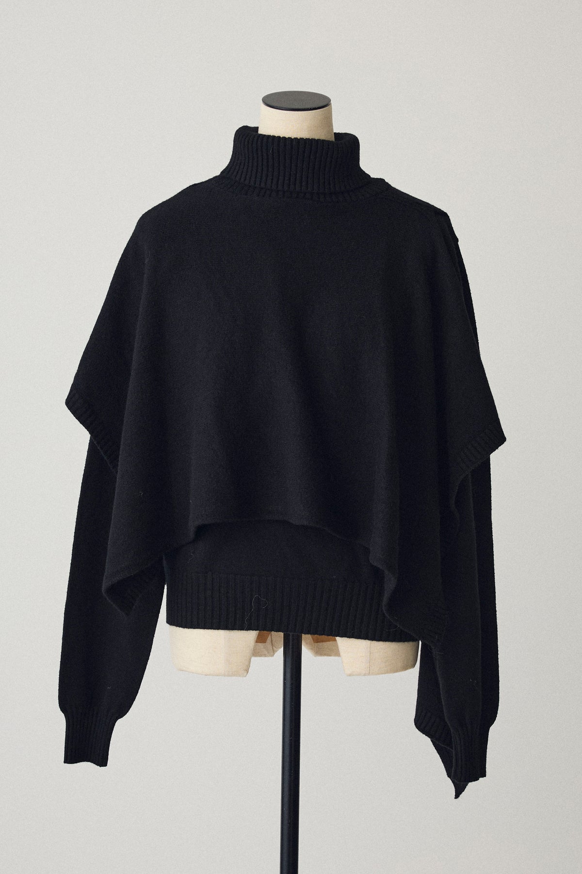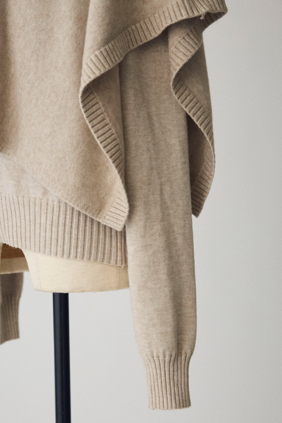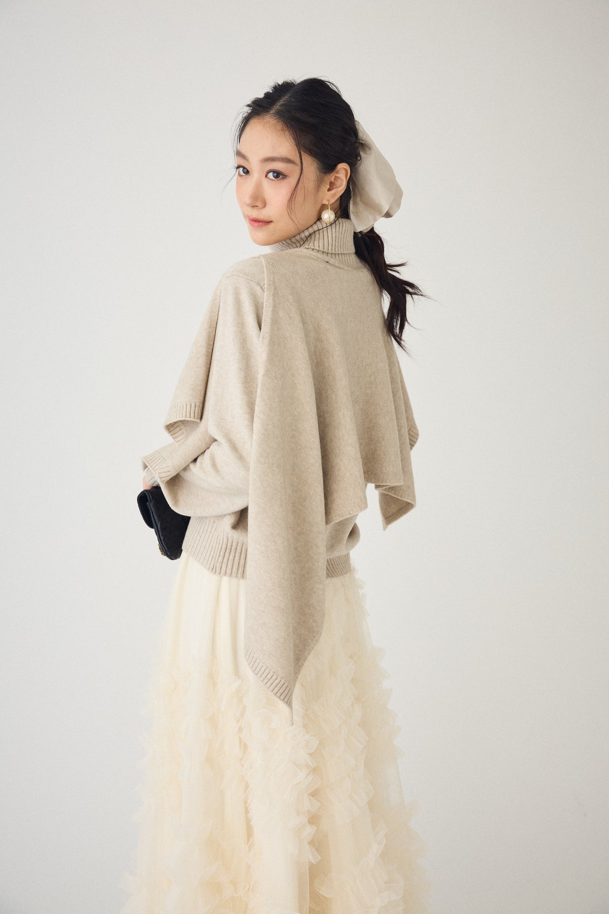 Vネックニットにケープを重ねたようなレイヤードデザインの2wayニット。ケープ部分は取り外し可能で、単体でも着用できる仕様です。セットで合わせるとトレンド感のある着こなしに、単品ではシンプルなニットとして幅広く活躍。程よいゆとりのあるシルエットで、スカートにもパンツにも合わせやすいバランスです。