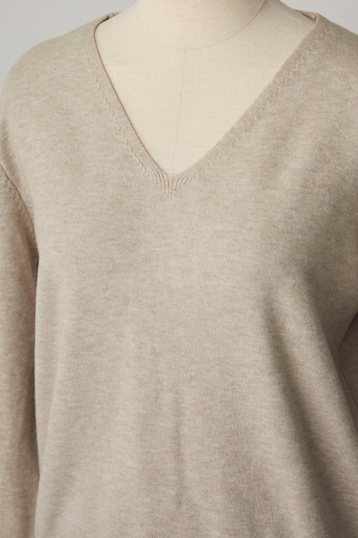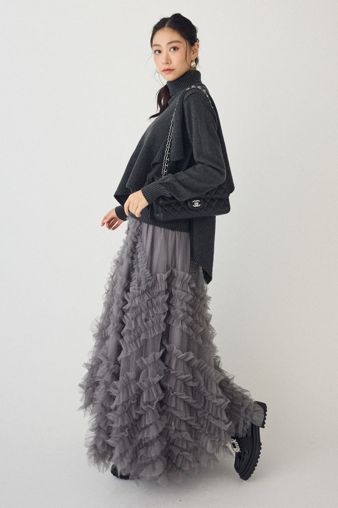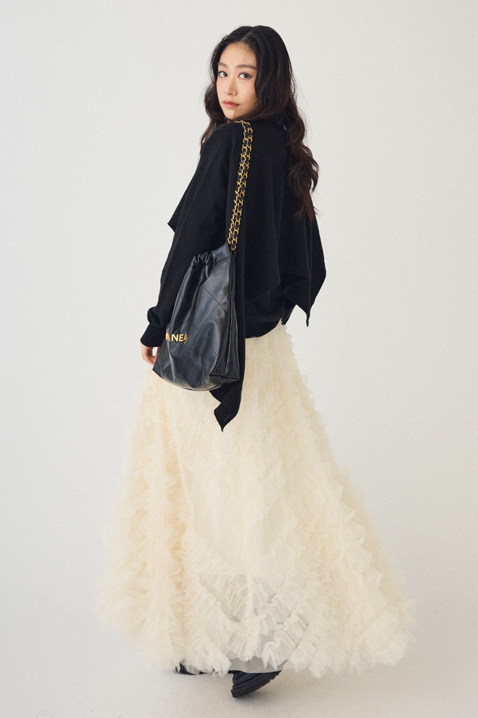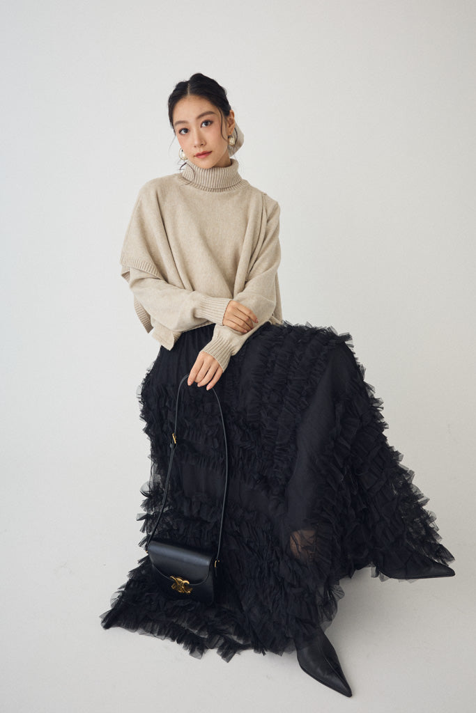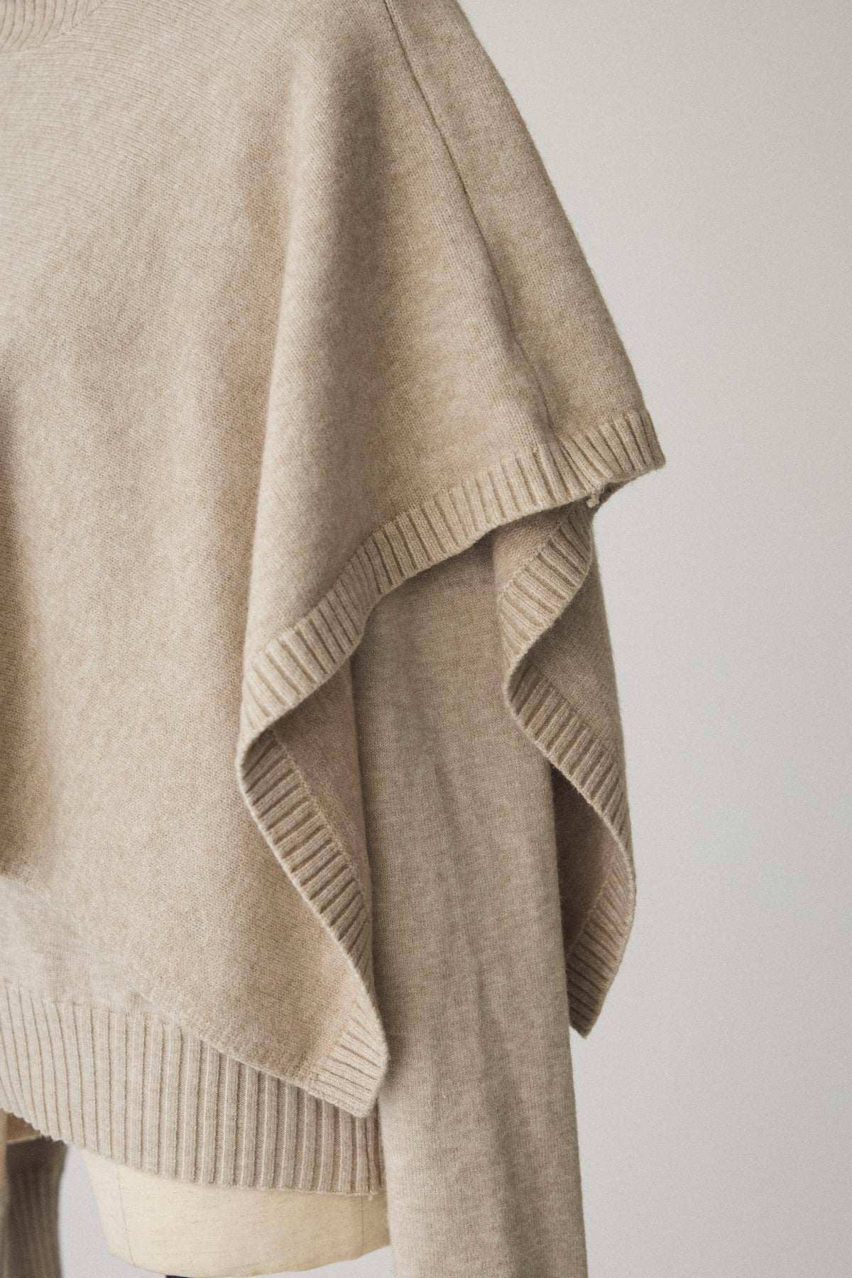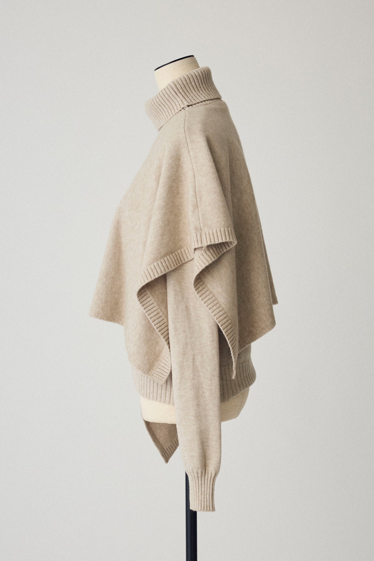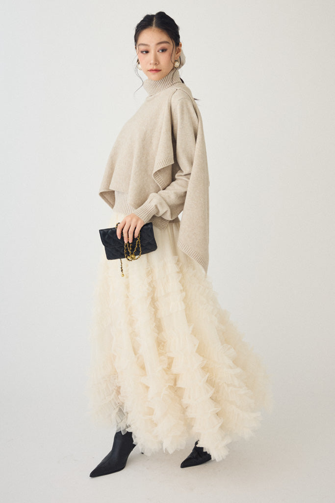 Vネックニットにケープを重ねたようなレイヤードデザインの2wayニット。ケープ部分は取り外し可能で、単体でも着用できる仕様です。セットで合わせるとトレンド感のある着こなしに、単品ではシンプルなニットとして幅広く活躍。程よいゆとりのあるシルエットで、スカートにもパンツにも合わせやすいバランスです。