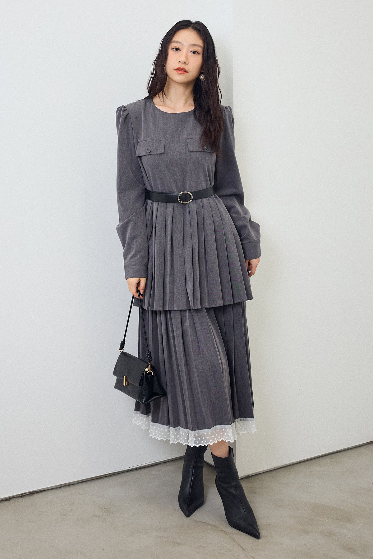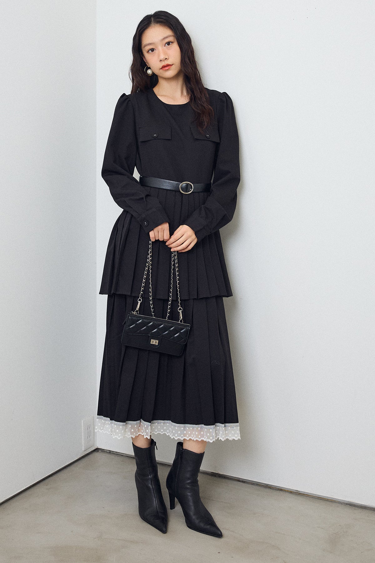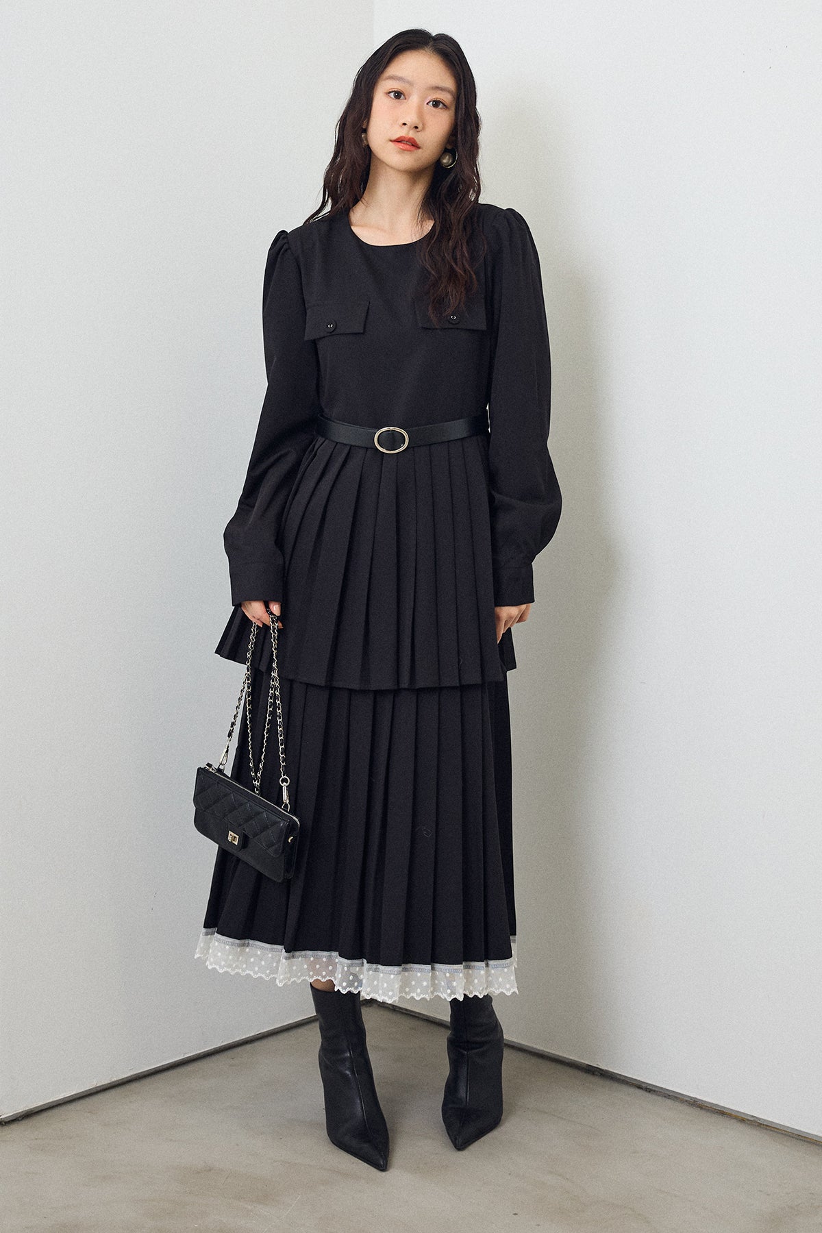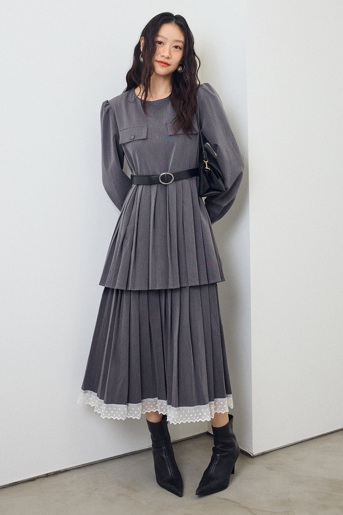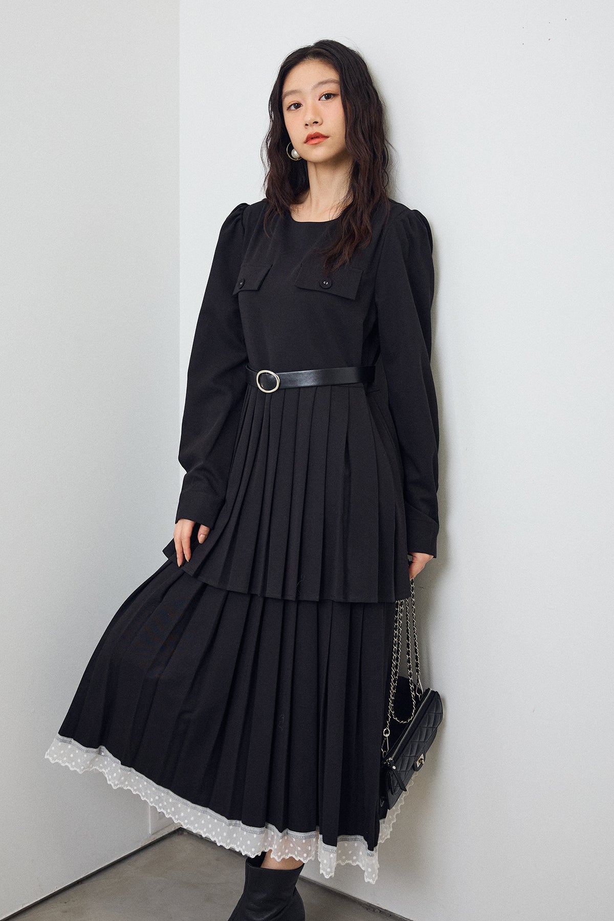 二段のプリーツデザインが動くたびに揺れ、クラシカルな雰囲気を引き立てるワンピース。上身頃のフラップディテールがほどよいアクセントになり、ウエストをベルトでマークすることでシルエットに上品なメリハリが生まれます。重ねたプリーツのボリューム感が華やかさをプラスし、裾からのぞくレースが女性らしい抜け感を演出。シンプルな小物を合わせるだけで、特別感のあるスタイリングが完成する一枚です。