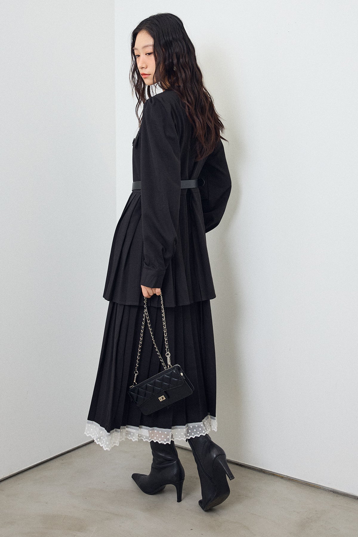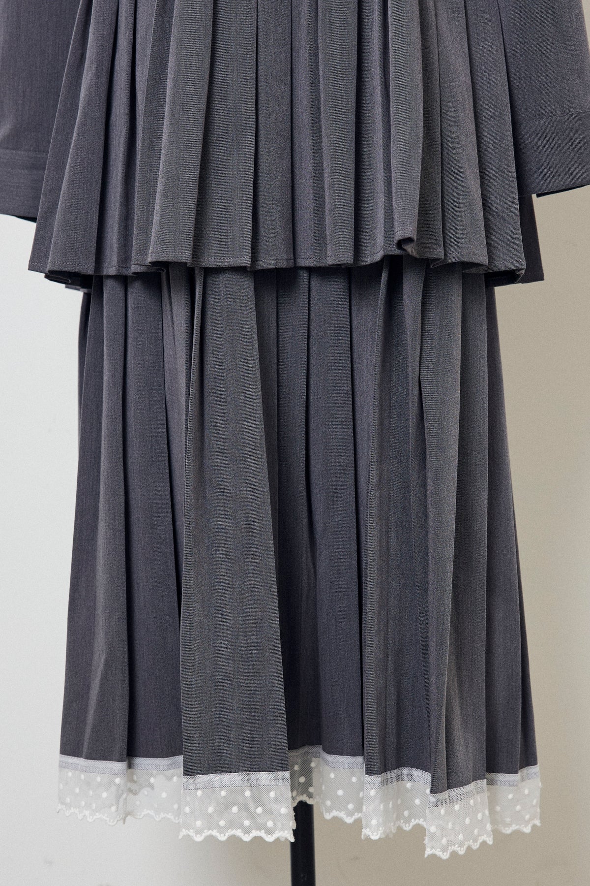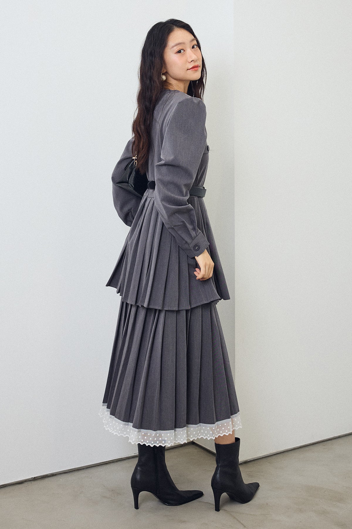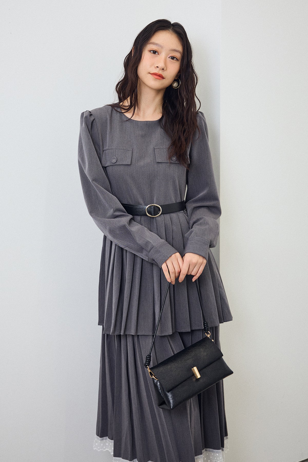 二段のプリーツデザインが動くたびに揺れ、クラシカルな雰囲気を引き立てるワンピース。上身頃のフラップディテールがほどよいアクセントになり、ウエストをベルトでマークすることでシルエットに上品なメリハリが生まれます。重ねたプリーツのボリューム感が華やかさをプラスし、裾からのぞくレースが女性らしい抜け感を演出。シンプルな小物を合わせるだけで、特別感のあるスタイリングが完成する一枚です。