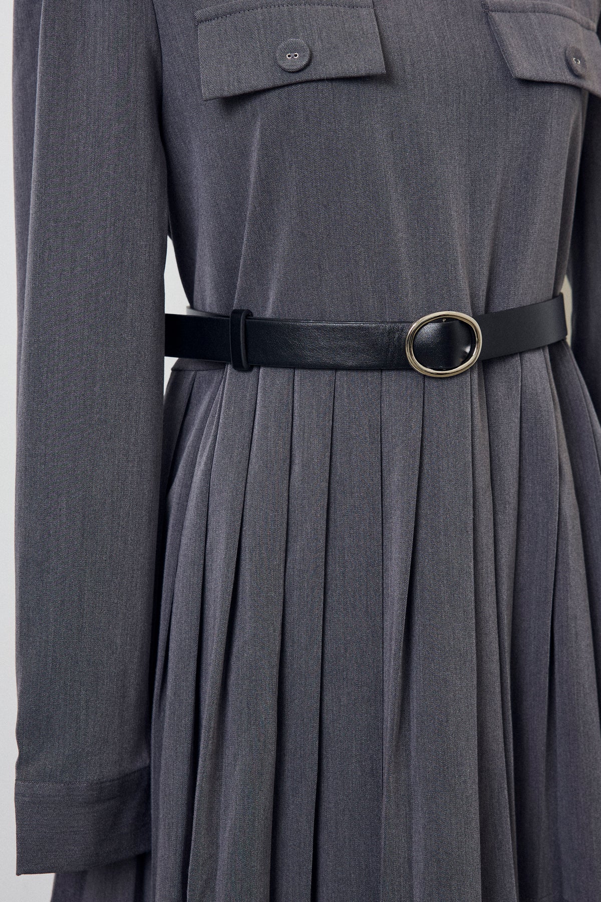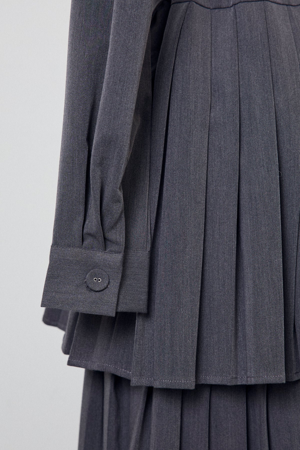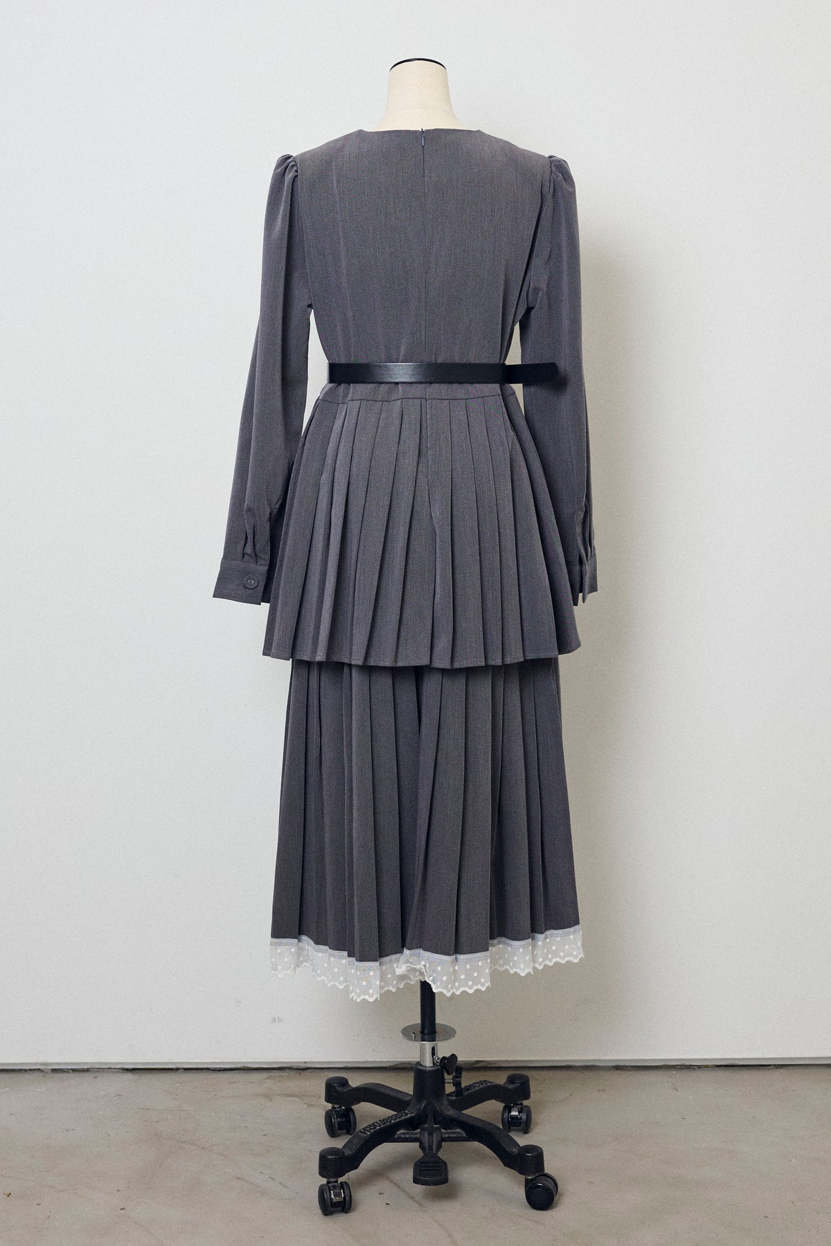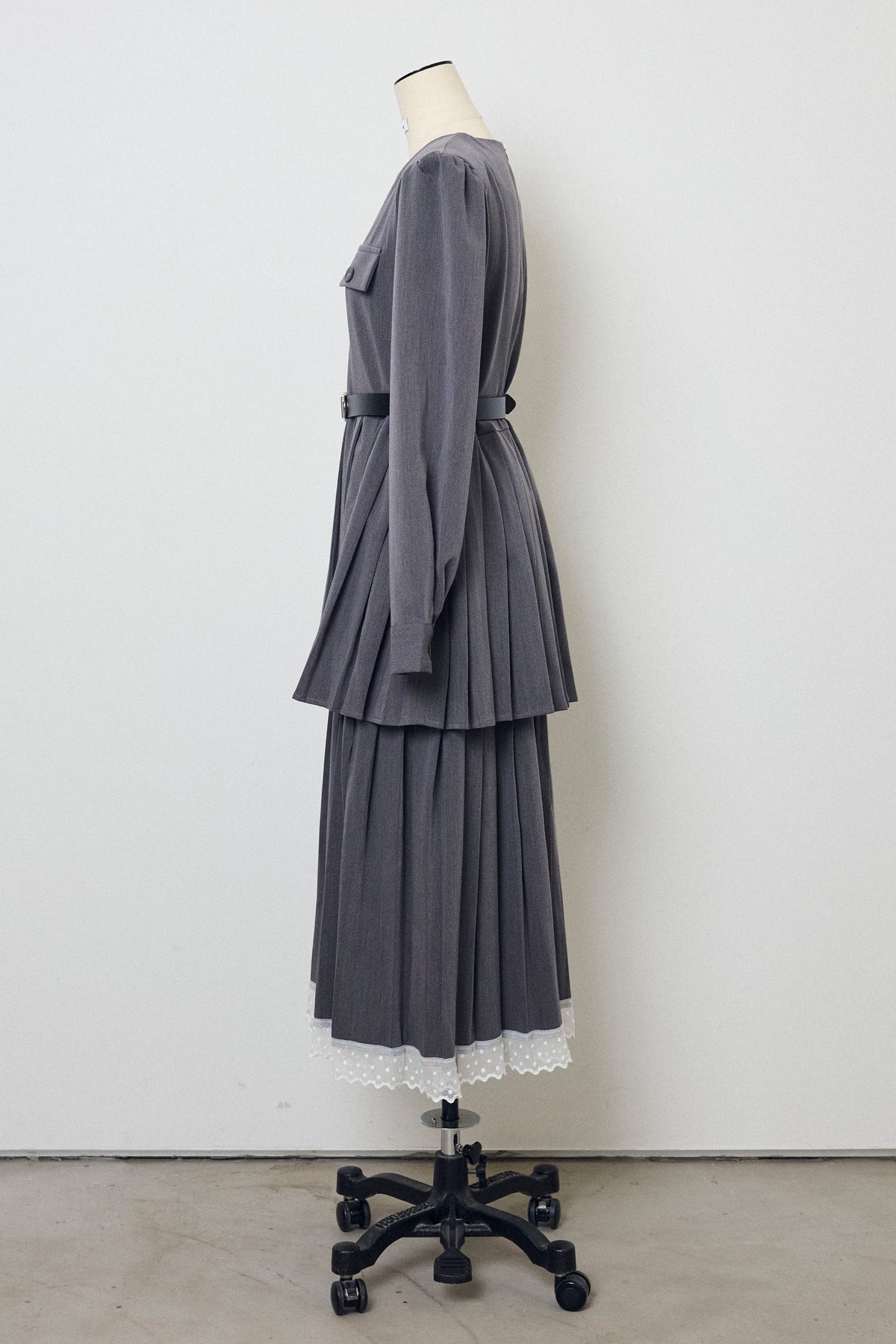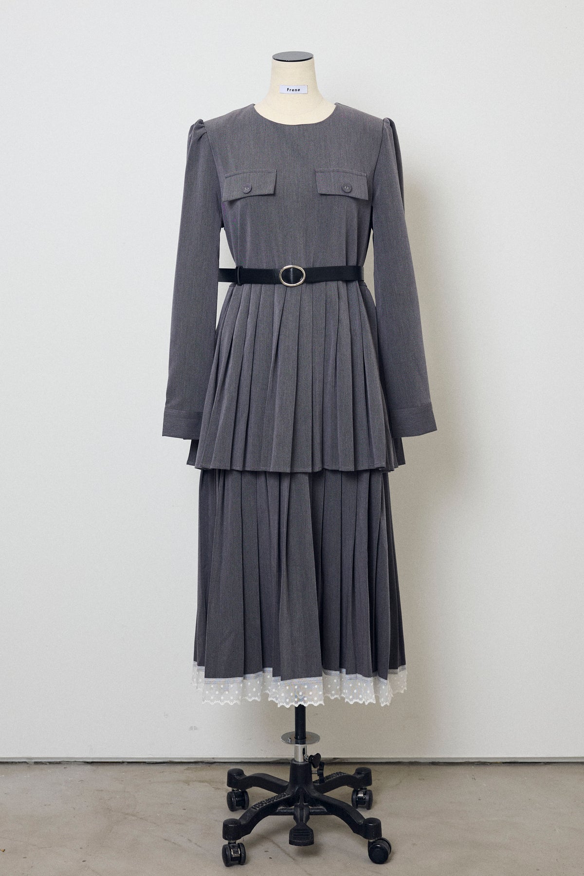二段のプリーツデザインが動くたびに揺れ、クラシカルな雰囲気を引き立てるワンピース。上身頃のフラップディテールがほどよいアクセントになり、ウエストをベルトでマークすることでシルエットに上品なメリハリが生まれます。重ねたプリーツのボリューム感が華やかさをプラスし、裾からのぞくレースが女性らしい抜け感を演出。シンプルな小物を合わせるだけで、特別感のあるスタイリングが完成する一枚です。