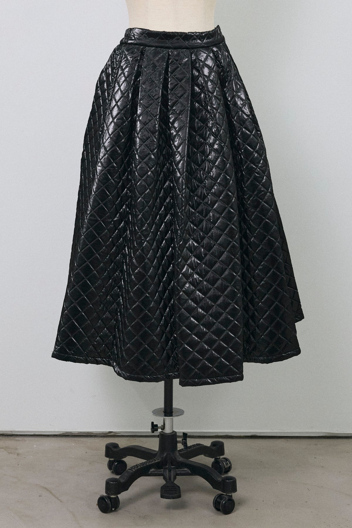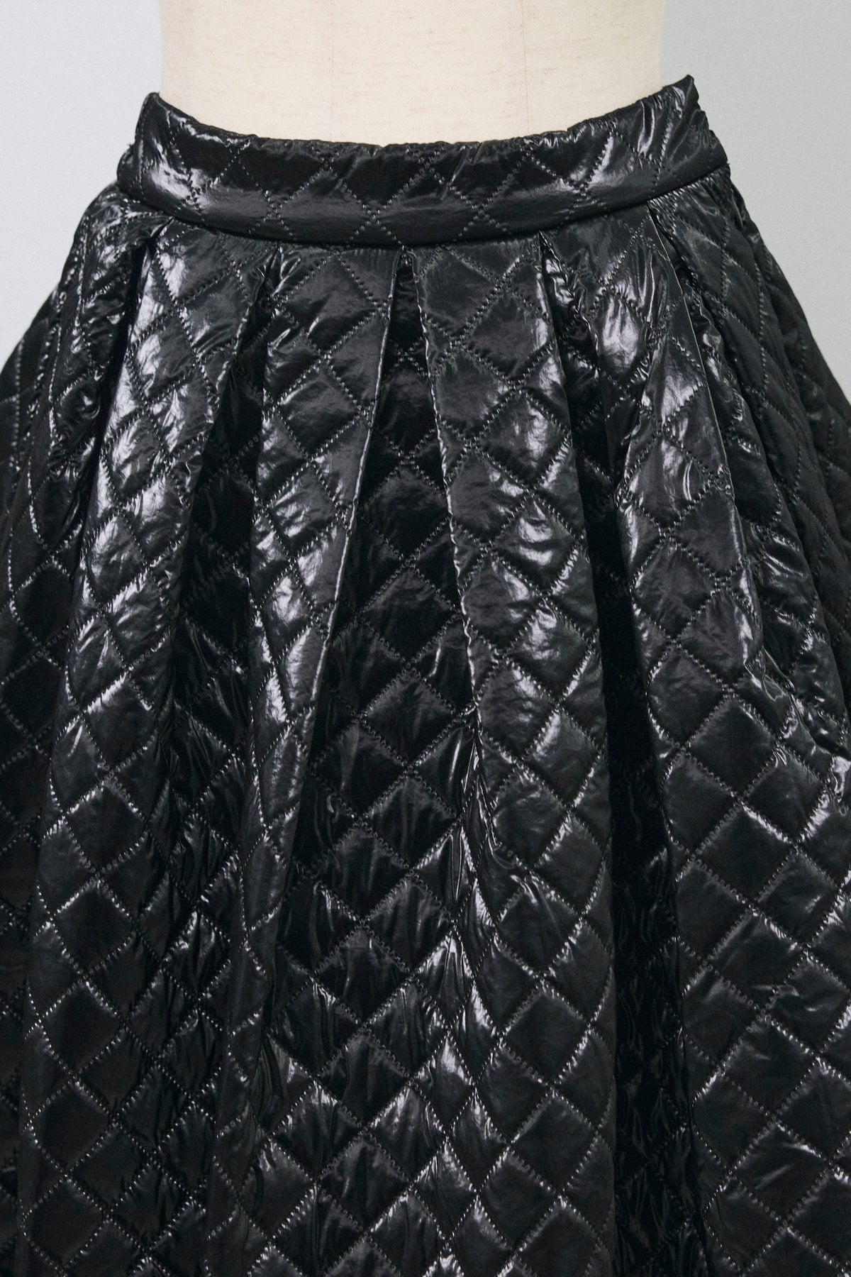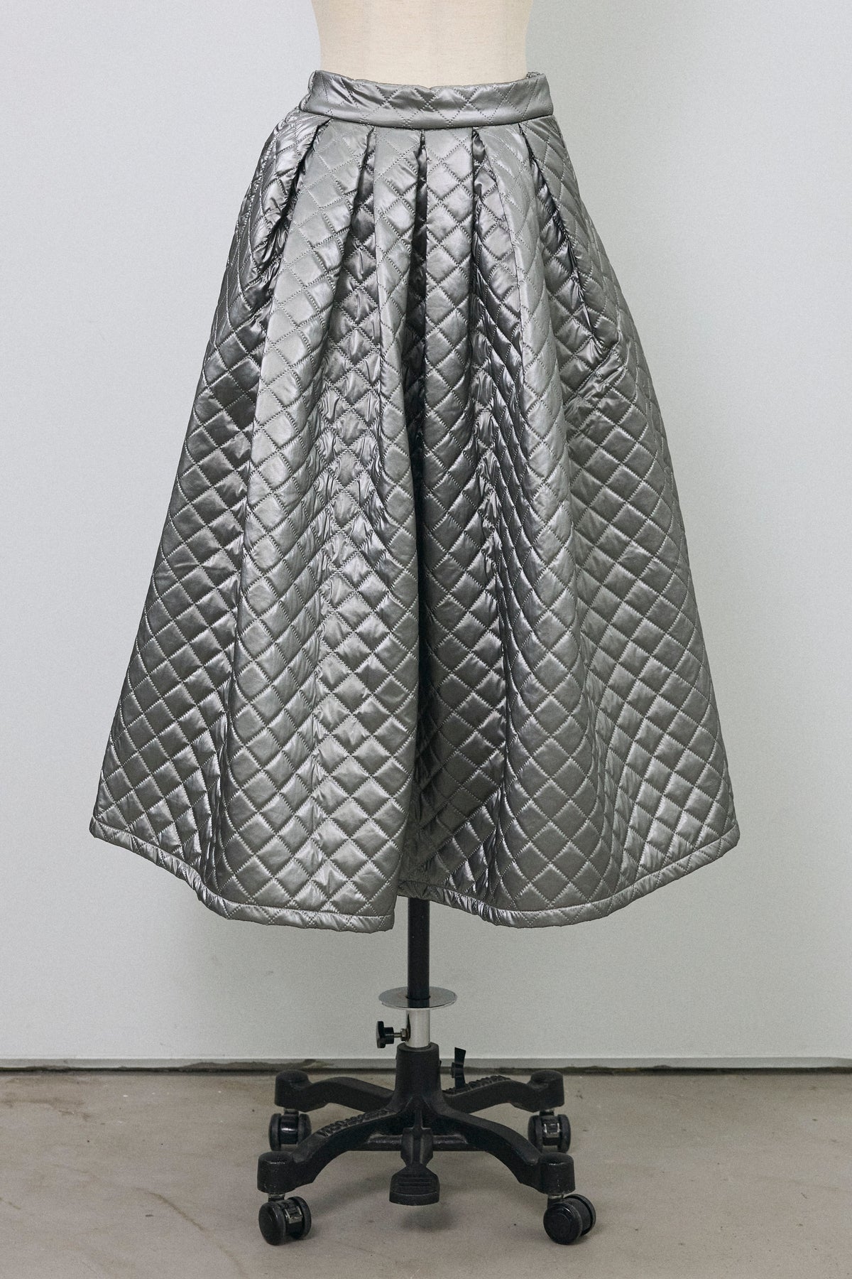 立体的なキルティング素材を使用したフレアスカート。光沢感のあるメタリックな質感がスタイリングにモードな華やかさをプラスします。 ウエスト周りはすっきりと仕上げつつ、裾に向かって広がるボリュームシルエットで女性らしいラインを演出。後ろウエストはゴム仕様で、見た目の美しさと着心地の良さを両立しています。 ニットやツイードジャケットを合わせることで、季節感のある上品なコーディネートが完成します。