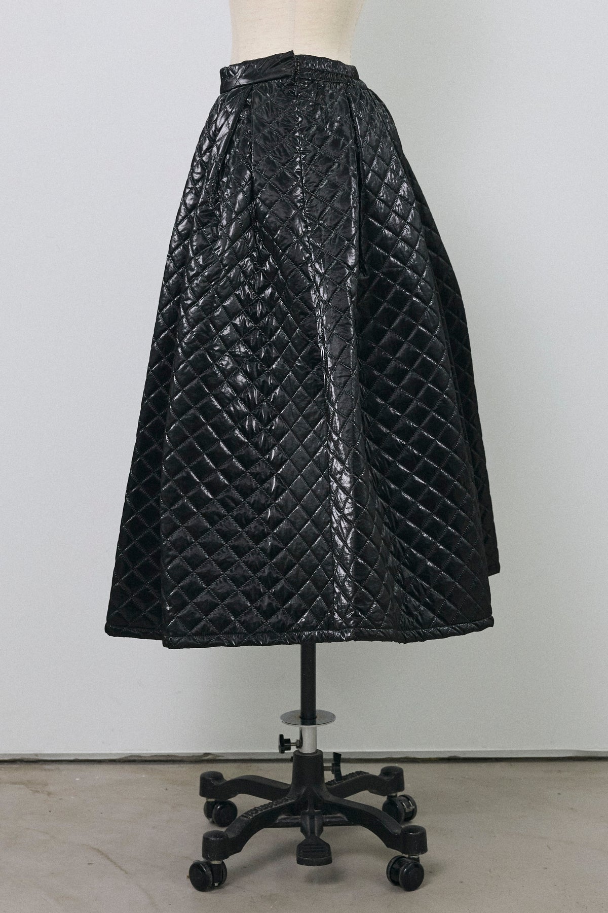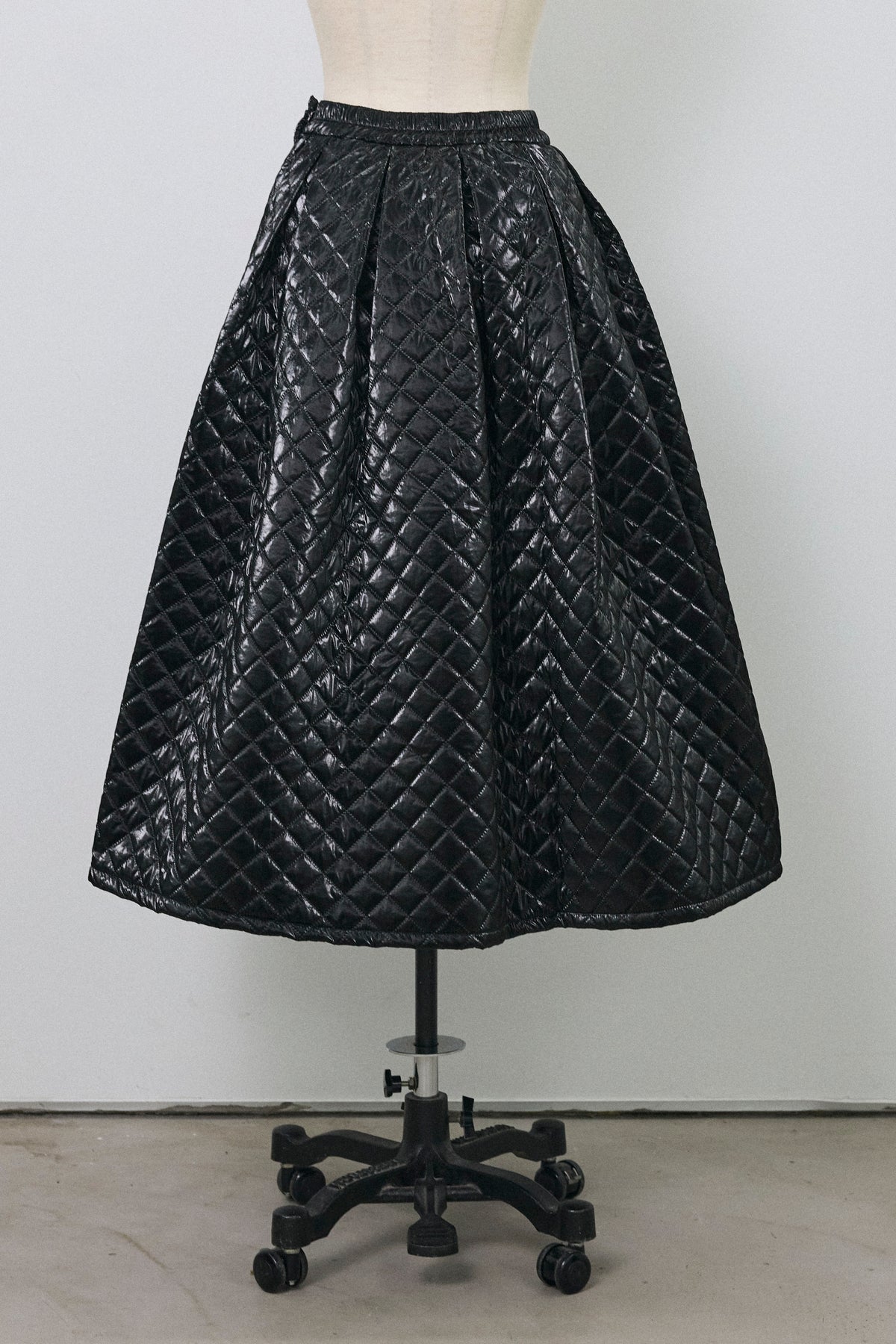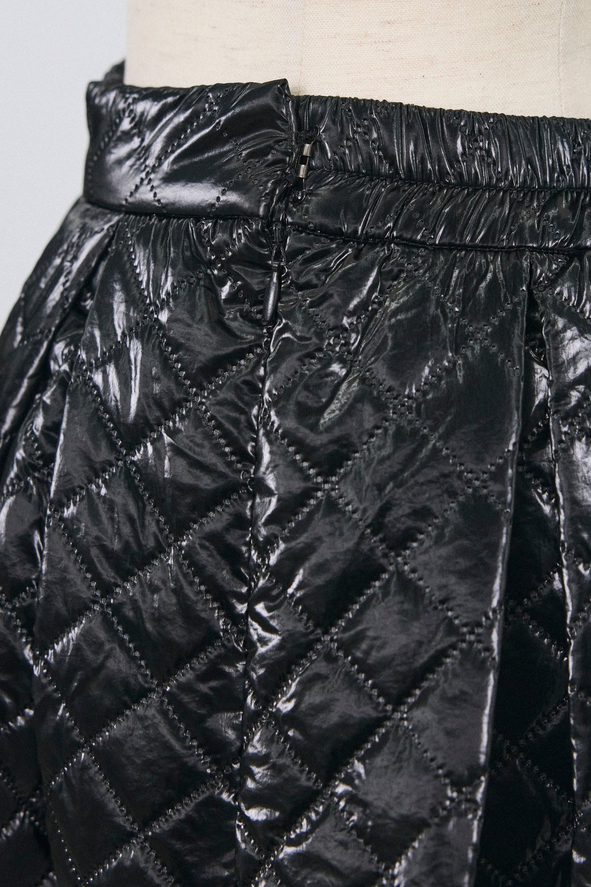 立体的なキルティング素材を使用したフレアスカート。光沢感のあるメタリックな質感がスタイリングにモードな華やかさをプラスします。 ウエスト周りはすっきりと仕上げつつ、裾に向かって広がるボリュームシルエットで女性らしいラインを演出。後ろウエストはゴム仕様で、見た目の美しさと着心地の良さを両立しています。 ニットやツイードジャケットを合わせることで、季節感のある上品なコーディネートが完成します。