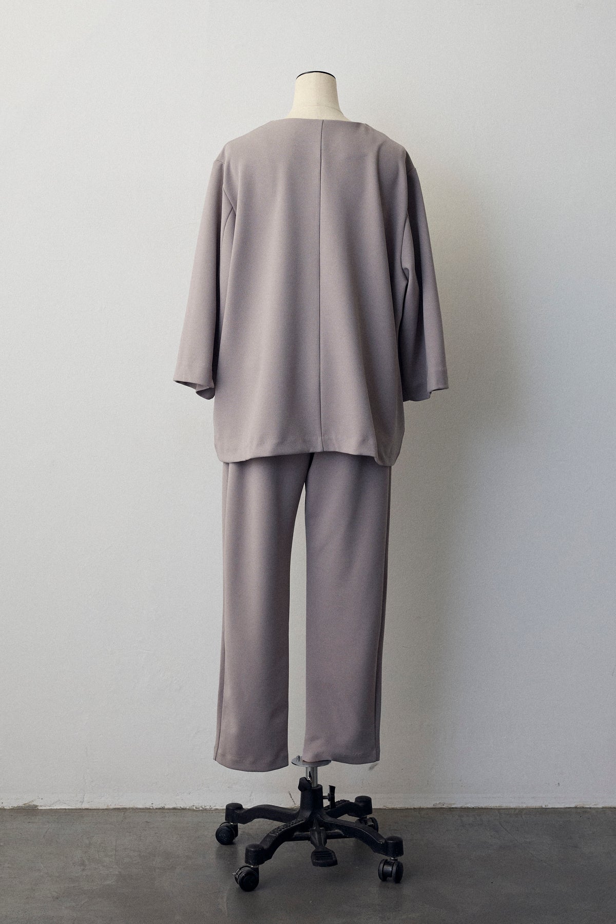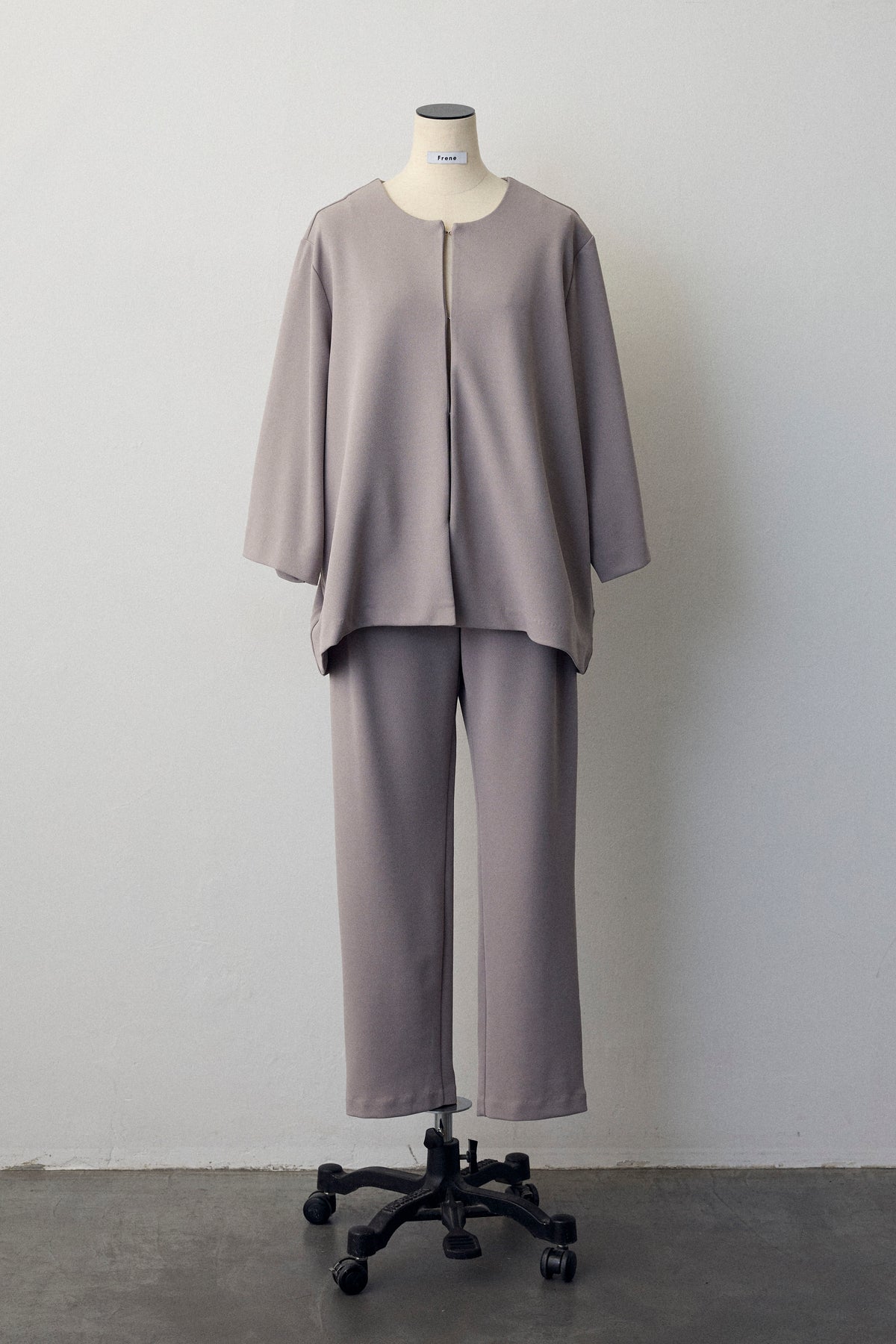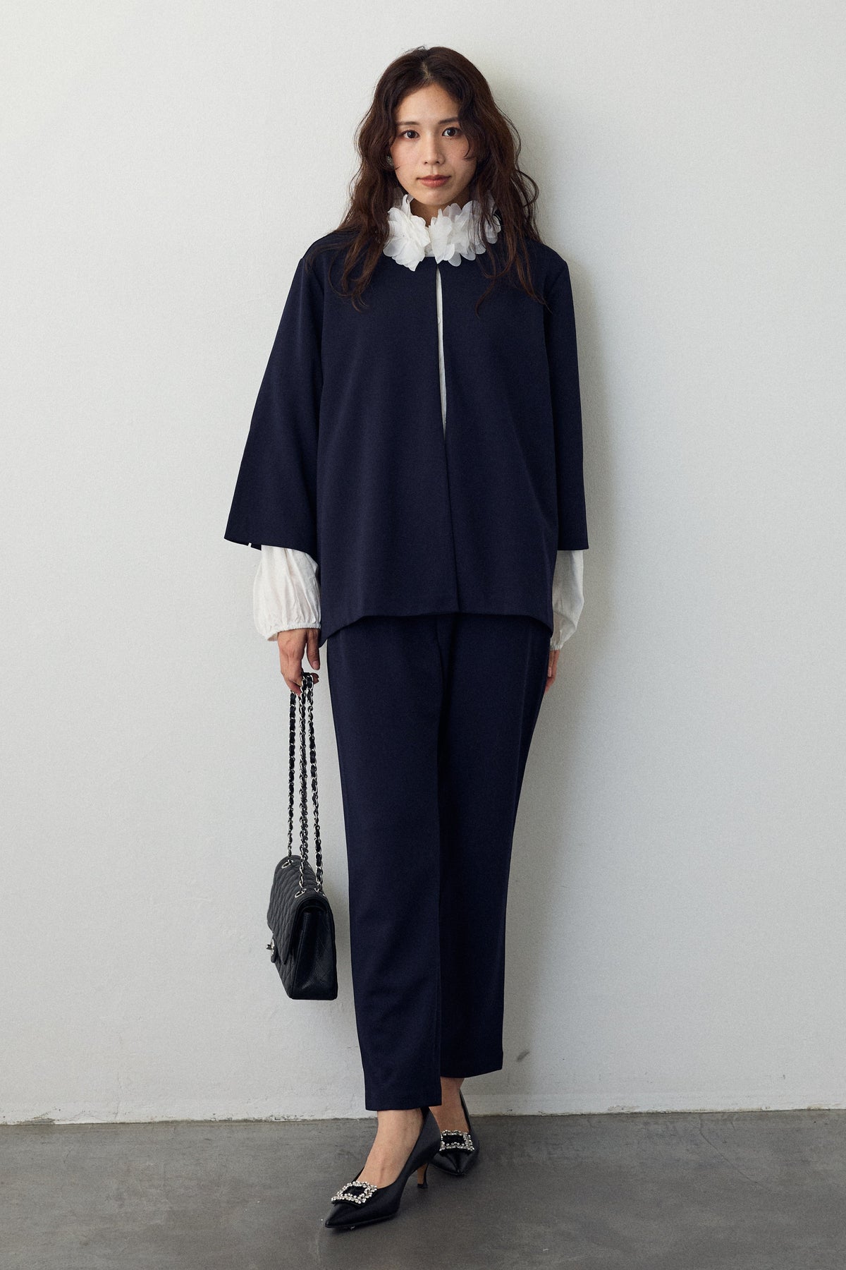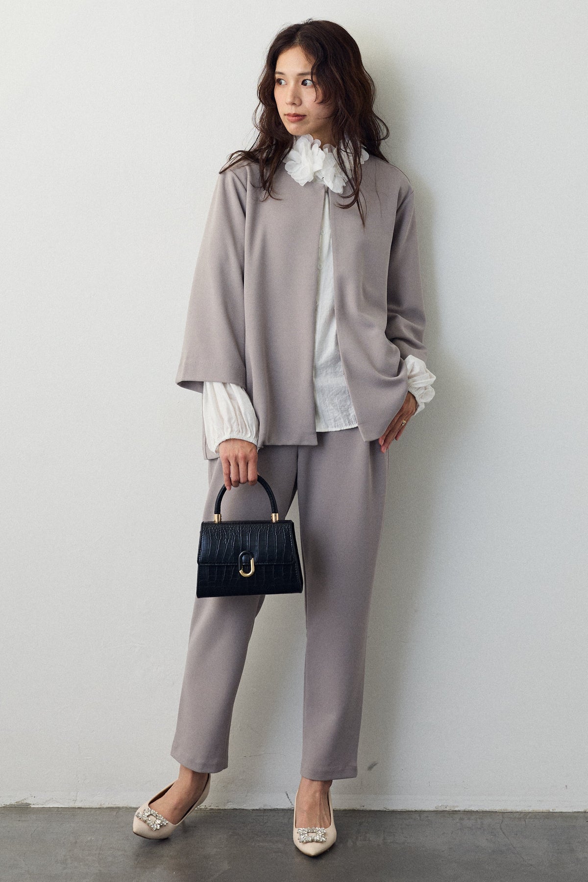 ノーカラーのすっきりとしたデザインが魅力のジョーゼットセットアップ。 程よい厚みと落ち感のある素材で、きちんと見えしながらも快適な着心地。 トップスはゆるやかなシルエット、パンツはテーパードでバランスよく仕上げました。 フォーマルにもデイリーにも対応できる万能アイテムです。